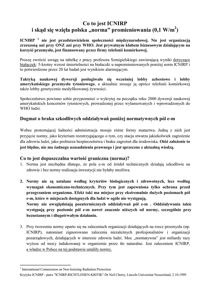 Co to jest ICNIRP i skąd się wzięła polska „norma” promieniowania (0,1 W/m2) ICNIRP 1 nie jest przedstawicielem społeczności międzynarodowej. Nie jest organizacją zrzeszoną ani przy ONZ ani przy WHO. Jest prywatnym klubem biznesowym działającym na korzyść przemysłu, jest finansowany przez firmy telefonii komórkowej. Proszę zwrócić uwagę na tabelkę z pracy profesora Szmigielskiego zawierającą wyniki dotyczące białaczek: 5-krotny wzrost śmiertelności na białaczki u napromieniowanych poniŜej norm ICNIRP i to potwierdzone przez 20 lat badań jest wynikiem alarmującym. Taktyką naukowej dywersji posługiwało się wcześniej lobby azbestowe i lobby amerykańskiego przemysłu tytoniowego, a aktualnie stosuje ją oprócz telefonii komórkowej takŜe lobby genetycznie modyfikowanej Ŝywności. Społeczeństwo powinno sobie przypomnieć o wykrytej na początku roku 2000 dywersji naukowej amerykańskich koncernów tytoniowych, prowadzonej przez wylansowanych i wprowadzonych do WHO ludzi. Dogmat o braku szkodliwych oddziaływań poniŜej normatywnych pól e-m Wobec protestującej ludności administracja stosuje róŜne formy matactwa. Jedną z nich jest przyjęcie normy, jako kryterium rozstrzygającego o tym, czy stacja stwarza jakiekolwiek zagroŜenie dla zdrowia ludzi, jako probierza bezpieczeństwa i braku zagroŜeń dla środowiska. OtóŜ załoŜenie to jest błędne, nie ma Ŝadnego uzasadnienia prawnego i jest sprzeczne z aktualną wiedzą. Co to jest dopuszczalna wartość graniczna (norma)? 1. Norma jest niezbędna dlatego, Ŝe pola e-m od źródeł technicznych działają szkodliwie na zdrowie i bez normy realizacja inwestycji nie byłaby moŜliwa. 2. Normy nie są ustalane według kryteriów biologicznych i zdrowotnych, lecz według wymagań ekonomiczno-technicznych. Przy tym jest zapewniona tylko ochrona przed przegrzaniem organizmu. Efekt taki ma miejsce przy ekstremalnie duŜych poziomach pól e-m, które w miejscach dostępnych dla ludzi w ogóle nie występują. Normy nie uwzględniają pozatermicznych oddziaływań pól e-m . Oddziaływania takie występują przy poziomie pól e-m nawet znacznie niŜszych od normy, szczególnie przy bezustannym i długotrwałym działaniu. 3. Przy tworzeniu normy oparto się na zaleceniach organizacji działających na rzecz przemysłu (np. ICNIRP), natomiast zignorowano zalecenia niezaleŜnych profesjonalistów i organizacji pozarządowych, działających w interesie zdrowia ludzi. Moc „normatywna” jest miliardy razy wyŜsza od mocy indukowanej w organizmie przez tło naturalne. Jest zaleceniem ICNIRP, a władze w Polsce na tej podstawie ustaliły normy. 1 International Commission on Non-Ionizing Radiation Protection Krytyka ICNIRP - patrz "ICNIRP-RICHTLINIEN-KRITIK" Dr Neil Cherry, Lincoln Universitat Neuseeland, 2.10.1999 4. Normę przyjęto arbitralnie na takim poziomie, aby zapewnić inwestorom realizację inwestycji i nie narazić ich na odszkodowania. Poziom normy jest tak dobrany, aby dla istniejących standardowych urządzeń nie mógł być przekroczony w terenie dostępnym dla ludzi. Poprzeczka normy jest podniesiona powyŜej tego, co się aktualnie emituje do środowiska. Potwierdza to praktyka, bowiem dla tysięcy stacji pracujących w Polsce nigdzie nie stwierdzono przekroczenia normy. Z potrzeb ekonomicznych w 1998 r. zwiększono w Polsce normy 4-krotnie dla zakresu radiowego i 10-krotnie dla linii energetycznych. Przy pomocy rozporządzenia promieniowania e-m „stały się nieszkodliwe”, a strefy niebezpieczne „zniknęły” z miejsc przebywania ludzi. Odbyło się to bez jakichkolwiek zmian technicznych. W eterze zapanowało imperium o ogromnej potędze gospodarczej (roczny światowy dochód tylko z telefonii komórkowej wynosi 1,2 biliona dolarów – wg danych z 2004 roku). Imperium to ma swoje instytucje (np. ICNIRP), prowadzi badania, ale publikuje tylko takie wyniki, które są korzystne dla jego interesów . Wymagane poziomy pól e-m ze względów zdrowotnych W publikacjach Parlamentu Europejskiego zaleca się, aby przy dłuŜszym działaniu na ludzi poziom pól e-m nie przekraczał 100 mikrowatów/m2 Polska „norma” jest tysiąc razy wyŜsza od tego poziomu! W dniach 19/20.10.1999 r. odbyło się Buergerforum Elektrosmog pod kierownictwem Ministra Ochrony Środowiska RFN z udziałem wybitnych specjalistów. W przyjętej rezolucji zalecono: - powinny być strefy bezpieczeństwa, szczególnie dla szpitali, szkół, przedszkoli i zabudowań mieszkalnych, - w ekspertyzach musi być przeprowadzany dowód nieszkodliwości oddziaływań, - dla miejsc spania poziom pola e-m nie powinien przekraczać 0,01 (mikrowata/m2) Polska „norma” jest 10 milionów razy wyŜsza od tego poziomu! WyŜej zalecany poziom pól e-m wynika z kompromisu, w którym uwzględnia się zarówno warunki zdrowotne, jak i zapewnienie łączności przez telefon komórkowy. Normą dla ludzi jest tylko elektromagnetyczne tło naturalne. Powinno być ono probierzem dla „norm" ustanawianych przez człowieka. Materiał oparty na opracowaniach mgr inŜ. Mariana Kłoszewskiego ze Stowarzyszenia Przeciwdziałania ElektroskaŜeniom www.prawodozycia.pl i Krzysztofa Puzyny, prowadzącego portal internetowy www.iddd.de . Pan M. Kłoszewski jest równieŜ członkiem "Buergerwelle", niemieckiego ruchu zrzeszającego obywateli, w tym lekarzy, prawników, naukowców, w zapobieganiu ekspansji promieniowania e-m oraz urządzeń go emitujących.