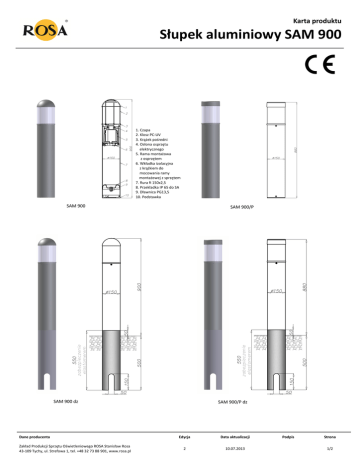 Karta produktu Słupek aluminiowy SAM 900 1. Czapa 2. Klosz PC-UV 3. Krążek pośredni 4. Osłona osprzętu elektrycznego 5. Rama montażowa z osprzętem 6. Wkładka izolacyjna z krążkiem do mocowania ramy montażowej z sprzętem 7. Rura fi 150x2,5 8. Przekładka IP 65 do SA 9. Dławnica PG13,5 10. Podstawka SAM 900 SAM 900/P SAM 900 dz Dane producenta Zakład Produkcji Sprzętu Oświetleniowego ROSA Stanisław Rosa 43-109 Tychy, ul. Strefowa 1, tel. +48 32 73 88 901, www.rosa.pl SAM 900/P dz Edycja Data aktualizacji 2 10.07.2013 Podpis Strona 1/2 Karta produktu Słupek aluminiowy SAM 900 Charakterystyka Stopień ochrony Napięcie Częstotliwość Klasa izolacji IP 65 230V, AC 50 Hz II rura ze stopu aluminium o średnicy zewnętrznej Ø150, klosz cylindryczny biały PC-UV anodowany lub malowany (oznaczone symbolem M) według palety RAL Materiał Kolor na fundamentach betonowych B-0, B-0A lub koszach zbrojeniowych Z-0, Z-0A do twardego podłoża 3 kołkami rozporowymi Ø8 lub wkopywane bezpośrednio do ziemi (oznaczone symbolem dz) Montaż Osprzęt elektryczny na uniwersalnej ramie montażowej, statecznik magnetyczny z zabezpieczeniem termicznym dla lamp 50W-100W, możliwość zastosowania statecznika elektronicznego dla lampy MH 70W (EL) Dane techniczne Nazwa rodzaj źródła światła SAM 900 rodzaj na fundament dz - wkopywany do ziemi wysokość [mm] objętość jednostkowa [m3] 0,023 0,036 anodowany 45008/C../P 45067/C../P malowany 45008M, 45008M/P 45067M, 45067M/P waga [kg] 5,35 6,55 anodowany 45009/C../P 45068/C../P malowany 45009M, 45009M/P 45068M, 45068M/P waga [kg] 5,55 6,75 anodowany 45010/C../P 45069/C../P malowany 45010M, 45010M/P 45069M, 45069M/P waga anodowany 5,65 45010E/C../P 6,75 45069E/C../P malowany waga [kg] anodowany 45010ME, 45010ME/P 4,45 45011/C../P 45069ME, 45069ME/P 5,55 45070/C../P malowany waga [kg] 45011M, 45011M/P 5,75 45070M, 45070M/P 6,95 anodowany malowany waga [kg] 45014/C../P 45014M, 45014M/P 4,45 45073/C../P 45073M, 45073M/P 5,35 Sodowe S-50W E-27 Sodowe S-70W E-27 Metalohalogenkowe MH-70W E-27 Metalohalogenkowe MH-70W Electronic E-27 Metalohalogenkowe MH-100W E-27 Świetlówki kompaktowe 23W E-27 900 /P - z daszkiem płaskim, dz - wkopywane do ziemi, M -malowane, C.. - anodowane Dyrektywa niskonapięciowa LVD 2006/95/WE, norma PN-EN 60598-1 Dyrektywa EMC 2004/108/WE, normy: PN-EN 55015, PN-EN 61547, PN-EN 61000-3-2, PN-EN 61000-3-3 powierzchnia: aluminium szlifowane anodowanie w 12 kolorach opcja malowania proszkowego wg RAL (inne farby na życzenie klienta) słupki wkopywane do ziemi—zabezpieczenie elastomerem w kolorze słupka do wysokości 50 mm (inna wysokość na życzenie klienta) pakowanie: folia bąbelkowa Dane producenta Zakład Produkcji Sprzętu Oświetleniowego ROSA Stanisław Rosa 43-109 Tychy, ul. Strefowa 1, tel. +48 32 73 88 901, www.rosa.pl Edycja Data aktualizacji 2 10.07.2013 Podpis Strona 2/2