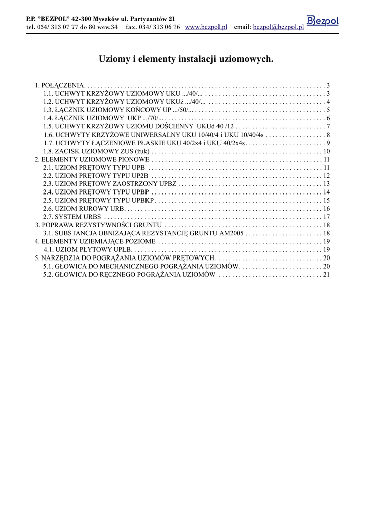 Uziomy i elementy instalacji uziomowych. 1. POŁĄCZENIA. . . . . . . . . . . . . . . . . . . . . . . . . . . . . . . . . . . . . . . . . . . . . . . . . . . . . . . . . . . . . . . . . . . . . . . . 3 1.1. UCHWYT KRZYŻOWY UZIOMOWY UKU .../40/... . . . . . . . . . . . . . . . . . . . . . . . . . . . . . . . . . . . . 3 1.2. UCHWYT KRZYŻOWY UZIOMOWY UKUż .../40/... . . . . . . . . . . . . . . . . . . . . . . . . . . . . . . . . . . . 4 1.3. ŁĄCZNIK UZIOMOWY KOŃCOWY UP .../50/... . . . . . . . . . . . . . . . . . . . . . . . . . . . . . . . . . . . . . . . 5 1.4. ŁĄCZNIK UZIOMOWY UKP .../70/... . . . . . . . . . . . . . . . . . . . . . . . . . . . . . . . . . . . . . . . . . . . . . . . . 6 1.5. UCHWYT KRZYŻOWY UZIOMU DOŚCIENNY UKUd 40 /12 . . . . . . . . . . . . . . . . . . . . . . . . . . . 7 1.6. UCHWYTY KRZYŻOWE UNIWERSALNY UKU 10/40/4 i UKU 10/40/4s . . . . . . . . . . . . . . . . . . 8 1.7. UCHWYTY ŁĄCZENIOWE PŁASKIE UKU 40/2x4 i UKU 40/2x4s . . . . . . . . . . . . . . . . . . . . . . . . 9 1.8. ZACISK UZIOMOWY ZUS (żuk) . . . . . . . . . . . . . . . . . . . . . . . . . . . . . . . . . . . . . . . . . . . . . . . . . . . 10 2. ELEMENTY UZIOMOWE PIONOWE . . . . . . . . . . . . . . . . . . . . . . . . . . . . . . . . . . . . . . . . . . . . . . . . . . . 11 2.1. UZIOM PRĘTOWY TYPU UPB . . . . . . . . . . . . . . . . . . . . . . . . . . . . . . . . . . . . . . . . . . . . . . . . . . . . 11 2.2. UZIOM PRĘTOWY TYPU UP2B . . . . . . . . . . . . . . . . . . . . . . . . . . . . . . . . . . . . . . . . . . . . . . . . . . . 12 2.3. UZIOM PRĘTOWY ZAOSTRZONY UPBZ . . . . . . . . . . . . . . . . . . . . . . . . . . . . . . . . . . . . . . . . . . . 13 2.4. UZIOM PRĘTOWY TYPU UPBP . . . . . . . . . . . . . . . . . . . . . . . . . . . . . . . . . . . . . . . . . . . . . . . . . . . 14 2.5. UZIOM PRĘTOWY TYPU UPBKP . . . . . . . . . . . . . . . . . . . . . . . . . . . . . . . . . . . . . . . . . . . . . . . . . . 15 2.6. UZIOM RUROWY URB. . . . . . . . . . . . . . . . . . . . . . . . . . . . . . . . . . . . . . . . . . . . . . . . . . . . . . . . . . . 16 2.7. SYSTEM URBS . . . . . . . . . . . . . . . . . . . . . . . . . . . . . . . . . . . . . . . . . . . . . . . . . . . . . . . . . . . . . . . . . 17 3. POPRAWA REZYSTYWNOŚCI GRUNTU . . . . . . . . . . . . . . . . . . . . . . . . . . . . . . . . . . . . . . . . . . . . . . . 18 3.1. SUBSTANCJA OBNIŻAJĄCA REZYSTANCJĘ GRUNTU AM2005 . . . . . . . . . . . . . . . . . . . . . . . 18 4. ELEMENTY UZIEMIAJĄCE POZIOME . . . . . . . . . . . . . . . . . . . . . . . . . . . . . . . . . . . . . . . . . . . . . . . . . 19 4.1. UZIOM PŁYTOWY UPŁB. . . . . . . . . . . . . . . . . . . . . . . . . . . . . . . . . . . . . . . . . . . . . . . . . . . . . . . . . 19 5. NARZĘDZIA DO POGRĄŻANIA UZIOMÓW PRĘTOWYCH . . . . . . . . . . . . . . . . . . . . . . . . . . . . . . . . 20 5.1. GŁOWICA DO MECHANICZNEGO POGRĄŻANIA UZIOMÓW. . . . . . . . . . . . . . . . . . . . . . . . . 20 5.2. GŁOWICA DO RĘCZNEGO POGRĄŻANIA UZIOMÓW . . . . . . . . . . . . . . . . . . . . . . . . . . . . . . . 21 BK 9000 do BK 9005 1.1. UCHWYT KRZYŻOWY UZIOMOWY UKU.../40/... Materiał: Stal ocynkowana ogniowo wg normy PN-EN ISO 1461 Zastosowanie: Do realizacji połączeń prętów lub rur uziomowych z płaskim przewodem uziomowym (bednarką) o szerokości do 40 mm. Nr kat. KTM Typ BK 9000 0654-291-425-162 BK 9001 Wymiary [mm] a c b d UKU 16/40/2 70 40 70 16 0654-291-425-202 UKU 20/40/2 70 40 70 20 BK 9002 0654-291-425-272 UKU 27/40/2 70 40 70 27 BK 9003 0654-291-425-164 UKU 16/40/4 70 40 70 16 BK 9004 0654-291-425-204 UKU 20/40/4 70 40 70 20 BK 9005 0654-291-425-274 UKU 27/40/4 70 40 80 27 3 BK 9006 do BK 9008 1.2. UCHWYT KRZYŻOWY UZIOMOWY UKUż .../40/... Materiał: - Stal ocynkowana ogniowo - blacha 6 wg normy PN-EN ISO 1461 - Zaciski - odlew żeliwny ocynkowany ogniowo. - Przekładki na powierzchniach stykowych. Zastosowanie: Uchwyt krzyżowy uziomowy UKU /40/ przeznaczony jest do realizacji połaczeń prętów uziomów pionowych z płaskimi lub okrągłymi przewodami uziomowymi. Maksymalna szerokość mocowanej bednarki 40 mm. Maksymalna średnica okrągłego przewodu uziomowego 10 mm. Produkowany w wersjach dla średnic prętów 16,20,27. Nr kat. KTM Typ BK 9006 0654-291-425-113 BK 9007 BK 9008 Wymiary [mm] a b c d UKUż 16/40 70 70 40 16 0654-291-425-213 UKUż 20/40 70 70 40 20 0654-291-425-313 UKUż 27/40 70 70 40 27 4 BK 9009 do BK 9010 1.3. ŁĄCZNIK UZIOMOWY KOŃCOWY UP .../50/... Materiał: - Stal ocynkowana ogniowo wg normy PN-EN ISO 1461 - Element mocująco uszczelniający. Zastosowanie: Łączniki uziomowe UP /50/2 są przeznaczone do realizacji połączeń prętów uziomowych i bednarki. Sposób montażu: Połaczenie uzyskuje się przez wywiercenie w bednarce otworów i przymocowanie jej do płaszczyzny mocującej łącznika za pomocą śrub. Następnie należy osadzić łącznik gniazdem na wieloklinie ostatniego z pogrążonych uziomów i zamocować przez osiowe uderzenie młotkiem do pełnego zamknięcia się zamka kształtowego. Nr kat. KTM Typ BK 9009 0654-291-016-002 BK 9010 0654-291-020-002 Wymiary [mm] a b D d L l UP 16/50/2 45 50 16 11 115 25 UP 20/50/2 45 50 20 12,5 115 29 5 BK 9011 do BK 9012 1.4. ŁĄCZNIK UZIOMOWY KOŃCOWY UKP .../70/... Materiał: - Stal ocynkowana ogniowo wg normy PN-EN ISO 1461 - Element mocująco uszczelniający. Zastosowanie: Łączniki uziomowe UKP ... /70/4 są przeznaczone do realizacji połączeń prętów uziomowych i bednarki. Umożliwiają realizację odejścia bednarką o szer max. 40 mm lub okrągłym przewodem uziomowym o średnicy max. 10 mm, zarówno w płaszczyźnie pionowej jak i poziomej. Nie wymagają wiercenia otworów w bednarce. Mocowanie następuje przez dokręcenie śrubami blaszki dociskowej – tak jak w tradycyjnych zaciskach krzyżowych. Następnie należy osadzić łącznik gniazdem na wieloklinie ostatniego z pogrążonych uziomów i zamocować przez osiowe uderzenie młotkiem do 