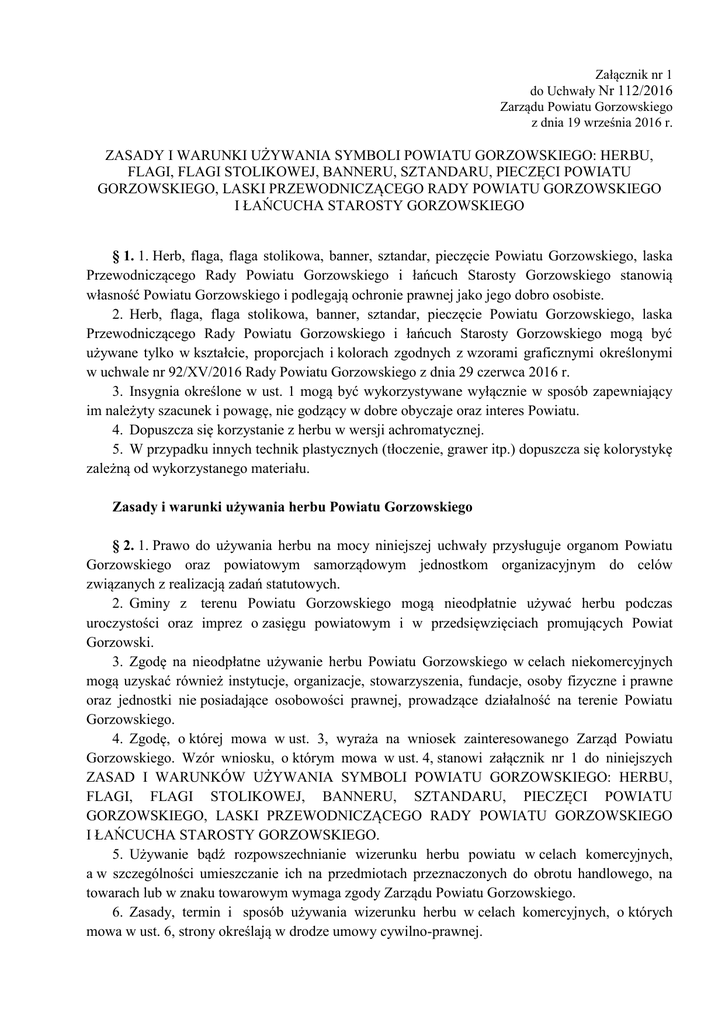 Załącznik nr 1 do Uchwały Nr 112/2016 Zarządu Powiatu Gorzowskiego z dnia 19 września 2016 r. ZASADY I WARUNKI UŻYWANIA SYMBOLI POWIATU GORZOWSKIEGO: HERBU, FLAGI, FLAGI STOLIKOWEJ, BANNERU, SZTANDARU, PIECZĘCI POWIATU GORZOWSKIEGO, LASKI PRZEWODNICZĄCEGO RADY POWIATU GORZOWSKIEGO I ŁAŃCUCHA STAROSTY GORZOWSKIEGO § 1. 1. Herb, flaga, flaga stolikowa, banner, sztandar, pieczęcie Powiatu Gorzowskiego, laska Przewodniczącego Rady Powiatu Gorzowskiego i łańcuch Starosty Gorzowskiego stanowią własność Powiatu Gorzowskiego i podlegają ochronie prawnej jako jego dobro osobiste. 2. Herb, flaga, flaga stolikowa, banner, sztandar, pieczęcie Powiatu Gorzowskiego, laska Przewodniczącego Rady Powiatu Gorzowskiego i łańcuch Starosty Gorzowskiego mogą być używane tylko w kształcie, proporcjach i kolorach zgodnych z wzorami graficznymi określonymi w uchwale nr 92/XV/2016 Rady Powiatu Gorzowskiego z dnia 29 czerwca 2016 r. 3. Insygnia określone w ust. 1 mogą być wykorzystywane wyłącznie w sposób zapewniający im należyty szacunek i powagę, nie godzący w dobre obyczaje oraz interes Powiatu. 4. Dopuszcza się korzystanie z herbu w wersji achromatycznej. 5. W przypadku innych technik plastycznych (tłoczenie, grawer itp.) dopuszcza się kolorystykę zależną od wykorzystanego materiału. Zasady i warunki używania herbu Powiatu Gorzowskiego § 2. 1. Prawo do używania herbu na mocy niniejszej uchwały przysługuje organom Powiatu Gorzowskiego oraz powiatowym samorządowym jednostkom organizacyjnym do celów związanych z realizacją zadań statutowych. 2. Gminy z terenu Powiatu Gorzowskiego mogą nieodpłatnie używać herbu podczas uroczystości oraz imprez o zasięgu powiatowym i w przedsięwzięciach promujących Powiat Gorzowski. 3. Zgodę na nieodpłatne używanie herbu Powiatu Gorzowskiego w celach niekomercyjnych mogą uzyskać również instytucje, organizacje, stowarzyszenia, fundacje, osoby fizyczne i prawne oraz jednostki nie posiadające osobowości prawnej, prowadzące działalność na terenie Powiatu Gorzowskiego. 4. Zgodę, o której mowa w ust. 3, wyraża na wniosek zainteresowanego Zarząd Powiatu Gorzowskiego. Wzór wniosku, o którym mowa w ust. 4, stanowi załącznik nr 1 do niniejszych ZASAD I WARUNKÓW UŻYWANIA SYMBOLI POWIATU GORZOWSKIEGO: HERBU, FLAGI, FLAGI STOLIKOWEJ, BANNERU, SZTANDARU, PIECZĘCI POWIATU GORZOWSKIEGO, LASKI PRZEWODNICZĄCEGO RADY POWIATU GORZOWSKIEGO I ŁAŃCUCHA STAROSTY GORZOWSKIEGO. 5. Używanie bądź rozpowszechnianie wizerunku herbu powiatu w celach komercyjnych, a w szczególności umieszczanie ich na przedmiotach przeznaczonych do obrotu handlowego, na towarach lub w znaku towarowym wymaga zgody Zarządu Powiatu Gorzowskiego. 6. Zasady, termin i sposób używania wizerunku herbu w celach komercyjnych, o których mowa w ust. 6, strony określają w drodze umowy cywilno-prawnej. 7. Zarząd Powiatu Gorzowskiego może cofnąć zgodę na używanie herbu Powiatu Gorzowskiego w trybie natychmiastowym, jeżeli podmiot używający herbu używa go niezgodnie z warunkami określonymi w umowie. 8. Herb Powiatu Gorzowskiego umieszcza się przede wszystkim na budynkach oraz w pomieszczeniach urzędowych i salach posiedzeń należących do organów powiatu oraz jego jednostek organizacyjnych. 9. Herb Powiatu Gorzowskiego może być również umieszczony na: a) materiałach Powiatu Gorzowskiego wydawanych przez organy powiatu, powiatowe jednostki organizacyjne oraz podmioty realizujące z samorządem powiatowym wspólne zadania; b) materiałach korespondencyjnych organów powiatu oraz powiatowych jednostek organizacyjnych; c) służbowych wizytówkach oraz identyfikatorach radnych, pracowników Starostwa Powiatowego w Gorzowie Wielkopolskim i jednostek organizacyjnych powiatu; d) tablicach i słupach usytuowanych w granicach administracyjnych powiatu; e) sztandarach instytucji oraz jednostek samorządowych podlegających samorządowi powiatowemu; f) stronach internetowych powiatu, biuletynu informacji publicznej, powiatowych jednostek organizacyjnych, powiatowych służb, inspekcji, straży, polskich i zagranicznych stronach internetowych umożliwiających połączenie się z oficjalną stroną Powiatu Gorzowskiego poprzez podanie linku. Zasady i warunki używania flagi i banneru Powiatu Gorzowskiego § 3. 1. Flagę i banner Powiatu Gorzowskiego można umieszczać na budynku lub przed budynkiem będącym siedzibą organów powiatu, powiatowych jednostek samorządowych i organizacyjnych z okazji uroczystości, świąt oraz rocznic. Flaga może być również umieszczana w salach obrad organów powiatu. 2. W przypadku wywieszania kilku flag obowiązuje następujący porządek: a) flaga państwowa/wojewódzka zajmuje z punktu widzenia patrzącego miejsce po lewej stronie flagi powiatowej, b) w przypadku dwóch flag powiatowych, po lewej stronie umieszcza się flagę gospodarza, w przypadku trzech flag – flaga gospodarza zajmuje środkowe miejsce, c) w przypadku trzech flag np. państwowej, wojewódzkiej i powiatowej, flagę państwową umieszcza się w środku, a wojewódzką po stronie lewej. 3. W czasie świąt i uroczystości banner podnosi się obok flagi powiatowej, państwowej i wojewódzkiej zgodnie z zasadami określonymi w stosownych przepisach. 4. Prawo do używania flagi i banneru przysługuje wyłącznie osobom i organom określonym w niniejszej uchwale. 5. W przypadkach uzasadnionych, w określonych miejscach i terminach, Zarząd Powiatu Gorzowskiego może udzielić zgody na używanie flagi powiatowej i banneru innym podmiotom. Zasady i warunki używania pieczęci Powiatu Gorzowskiego § 4. 1. Pieczęcie Powiatu Gorzowskiego są symbolem Powiatu Gorzowskiego i podlegają ochronie prawnej. 2. Prawo używania pieczęci „* POWIAT * GORZOWSKI ” ma Starosta Gorzowski i Przewodniczący Rady Powiatu Gorzowskiego. 3. Prawo używania pieczęci „STAROSTA * GORZOWSKI” ma Starosta Gorzowski. 4. Prawo używania pieczęci * R