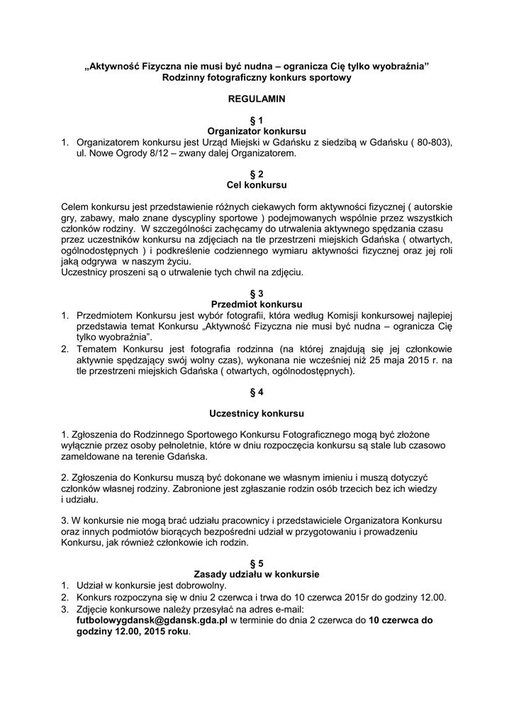 „Aktywność Fizyczna nie musi być nudna – ogranicza Cię tylko wyobraźnia” Rodzinny fotograficzny konkurs sportowy REGULAMIN §1 Organizator konkursu 1. Organizatorem konkursu jest Urząd Miejski w Gdańsku z siedzibą w Gdańsku ( 80-803), ul. Nowe Ogrody 8/12 – zwany dalej Organizatorem. §2 Cel konkursu Celem konkursu jest przedstawienie różnych ciekawych form aktywności fizycznej ( autorskie gry, zabawy, mało znane dyscypliny sportowe ) podejmowanych wspólnie przez wszystkich członków rodziny. W szczególności zachęcamy do utrwalenia aktywnego spędzania czasu przez uczestników konkursu na zdjęciach na tle przestrzeni miejskich Gdańska ( otwartych, ogólnodostępnych ) i podkreślenie codziennego wymiaru aktywności fizycznej oraz jej roli jaką odgrywa w naszym życiu. Uczestnicy proszeni są o utrwalenie tych chwil na zdjęciu. §3 Przedmiot konkursu 1. Przedmiotem Konkursu jest wybór fotografii, która według Komisji konkursowej najlepiej przedstawia temat Konkursu „Aktywność Fizyczna nie musi być nudna – ogranicza Cię tylko wyobraźnia”. 2. Tematem Konkursu jest fotografia rodzinna (na której znajdują się jej członkowie aktywnie spędzający swój wolny czas), wykonana nie wcześniej niż 25 maja 2015 r. na tle przestrzeni miejskich Gdańska ( otwartych, ogólnodostępnych). §4 Uczestnicy konkursu 1. Zgłoszenia do Rodzinnego Sportowego Konkursu Fotograficznego mogą być złożone wyłącznie przez osoby pełnoletnie, które w dniu rozpoczęcia konkursu są stale lub czasowo zameldowane na terenie Gdańska. 2. Zgłoszenia do Konkursu muszą być dokonane we własnym imieniu i muszą dotyczyć członków własnej rodziny. Zabronione jest zgłaszanie rodzin osób trzecich bez ich wiedzy i udziału. 3. W konkursie nie mogą brać udziału pracownicy i przedstawiciele Organizatora Konkursu oraz innych podmiotów biorących bezpośredni udział w przygotowaniu i prowadzeniu Konkursu, jak również członkowie ich rodzin. §5 Zasady udziału w konkursie 1. Udział w konkursie jest dobrowolny. 2. Konkurs rozpoczyna się w dniu 2 czerwca i trwa do 10 czerwca 2015r do godziny 12.00. 3. Zdjęcie konkursowe należy przesyłać na adres e-mail: [email protected] w terminie do dnia 2 czerwca do 10 czerwca do godziny 12.00, 2015 roku. 4. Każdy z uczestników zgłasza do Konkursu jedno zdjęcie w formie JPEG o pojemności do 5 MB wraz z wypełnioną i podpisaną Kartą Zgłoszenia ( skan, zdjęcie), która stanowi załącznik nr 1 do niniejszego Regulaminu. 5. Każdy uczestnik jest zobowiązany umieścić w Karcie Zgłoszenia krótką informację na temat swojej rodziny przedstawionej na fotografii, okoliczności wykonania zdjęcia oraz miejsca w tle. Informacja o wynikach konkursu zostanie opublikowana na stronie internetowej www.gdansk.pl oraz zostanie zamieszczona na profilu facebook Wydziału Rozwoju Społecznego Urzędu Miejskiego w Gdańsku pod adresem https://www.facebook.com/zGdanska. Ogłoszenie wyników nastąpi w dniu 10 czerwca o godzinie 19.00, 2015 roku. 6. Nadesłanie zdjęcia z Kartą Zgłoszenia na Konkurs jest równoznaczne z wyrażeniem zgody na publikację zdjęcia, imienia i nazwiska autora zgłoszenia na stronie internetowej www.gdansk.pl ; https://www.facebook.com/zGdanska oraz partnera konkursu PGE Arena Gdańsk www.pgearena.gdansk.pl; www.facbook.com/PGEArena w dniach od 10 do 16 czerwca br. ( tj. od dnia ogłoszenia wyników do 6 dni po dacie ogłoszenia wyników Konkursu). 7. Fotografie i zgłoszenia dostarczone po terminie nie będą brały udziału w Konkursie. §6 Organizator zastrzega sobie prawo do odrzucenia zdjęć, które nie będą spełniały kryteriów przedstawionych w niniejszym Regulaminie, będą sprzeczne z prawem lub będą naruszały dobre zasady współżycia społecznego. 1. 2. 3. 4. 5. 6. 7. 8. §7 Rozstrzygnięcie konkursu Organizator przewiduje przyznanie jednej nagrody głównej dla zwycięscy Konkursu oraz dwóch nagród dodatkowych. O wyborze najlepszego zdjęcia zadecyduje Komisja konkursowa. W skład Komisji konkursowej wchodzą: - Maciej Nicgorski - Wojciech Dąbrowski - Damian Kuźmiński - Jan Ptach - Mateusz Wojewoda - Aleksandra Kicińska Ogłoszenie wyników konkursu nastąpi 10 czerwca 2015 r. o godzinie 19.00 po obradach Komisji, które odbędą się w dniu 10 czerwca 2015 r. Wszystkie decyzje Komisji konkursowej są nieodwołalne. Wyniki konkursu będą publikowane na stronach: www.gdansk.pl; www.facebook.com/zGdanska; pgearena.gdansk.pl; facebook.com/PGEArena Nagrody przewidziane w Konkursie to: 1) Nagroda główna – bilety na mecz piłki nożnej Polska – Grecja, który odbędzie się 16 czerwca 2015 roku na PGE Arena Gdańsk. 2) Dwie nagrody dodatkowe – pakiet materiałów promocyjnych o Gdańsku oraz sprzęt sportowy. Wszyscy laureaci Konkursu zostaną powiadomieni przez Organizatora o wynikach głosowania poprzez ogłoszenie ich na stronie internetowej www.gdansk.pl; www.facebook.com/zGdanska; pgearena.gdansk.pl; www.facebook.com/PGEArena w dniu 10 czerwca 2015 r. 9. Przekazanie nagrody głównej zwycięscy Konkursu, nastąpi w wyznaczonym przez Organizatora terminie i miejscu, jednak nie później niż do dnia 16 czerwca 2015 r. 10. Zwycięzca nagrody głównej zostanie poinformowany drogą mailową oraz telefoniczną o wynikach konkursu. Zwycięzca nagrody głównej będzie poproszony o przesłanie Imienia, Nazwiska oraz Peseli członków rodziny występujących na fotografii. Dane należy przesłać pod adres [email protected] w terminie do 11 czerwca do godziny 12.00. Nie przesłanie danych równoznaczne jest z rezygnacją z nagrody. Powyższy obowiązek wynika z ustawy o bezpieczeństwie imprez masowych. 11. Przekazanie nagród dodatkowych laureatom Konkursu, nastąpi w wyznaczonym przez Organizatora terminie i miejscu, jednak nie później niż w terminie 14 dni od daty opublikowania wyników. 12. W przypadku braku możliwości skontaktowania się Organizatora ze Zwycięzcą