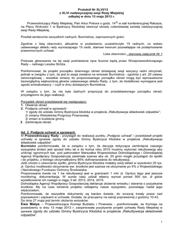Protokół Nr XLVI/13 z XLVI nadzwyczajnej sesji Rady Miejskiej odbytej w dniu 13 maja 2013 r. Przewodniczący Rady Miejskiej, Pan Artur Pokora o godz. 1430 w sali konferencyjnej Ratusza, na Placu Wolności 1 w Bystrzycy Kłodzkiej otworzył obrady czterdziestej szóstej nadzwyczajnej sesji Rady Miejskiej. Powitał serdecznie wszystkich radnych, Burmistrza, zaproszonych gości. Zgodnie z listą obecności, aktualnie w posiedzeniu uczestniczyło 15 radnych, co wobec ustawowego składu rady wynoszącego 15 osób, stanowi kworum pozwalające na podejmowanie prawomocnych uchwał. Lista obecności - stanowią załącznik Nr 1 Podczas głosowania na tej sesji podniesione ręce liczone będą przez Wiceprzewodniczącego Rady – radnego Leszka Stróża. Poinformował, że projekt porządku dziennego obrad dzisiejszej sesji wszyscy radni otrzymali, jednak w związku z tym, że jest to sesja zwołana na wniosek Burmistrza - zgodnie z art. 20 ustawy samorządowej - wszelkie zmiany do proponowanego porządku obrad mogą być wprowadzone bezwzględną większością głosów ustawowego składu Rady, z tym, że dodatkowo wymagana jest zgoda wnioskodawcy – czyli w dniu dzisiejszym Burmistrza. W związku z tym, że nie była żadnych propozycji do przedstawionego porządku obrad, przystąpiono do jego realizacji. Porządek obrad przedstawiał się następująco: 1. Otwarcie obrad. 2. Podjęcie uchwał w sprawach: 1/ zgody do udziału Gminy Bystrzyca kłodzka w projekcie „Rekultywacja składowisk odpadów”; 2/ zmiany Wieloletniej Prognozy Finansowej; 3/ zmian w budżecie gminy. 3. Zamknięcie obrad. Ad. 2. Podjęcie uchwał w sprawach. 1/ Przewodniczący Rady - przystąpił do realizacji punktu „Podjęcie uchwał” i przedstawił projekt uchwały w sprawie zgody do udziału Gminy Bystrzyca Kłodzka w projekcie „Rekultywacja składowisk odpadów”. Burmistrz poinformowała, że w związku z tym, że decyzja dotycząca zamknięcia naszego wysypiska śmieci jest sprzed kilku lat a do końca roku 2015 musimy wykonać rekultywację aby uniknąć ogromnych kar, pod patronatem Marszałka Województwa Dolnośląskiego i Dolnośląskiej Agencji Współpracy Gospodarczej zaistniała szansa aby ok. 20 gmin mogło przystąpić do spółki i do projektu, z którego otrzymalibyśmy 85% dofinansowania do rekultywacji. Jeśli chodzi o utworzenie spółki, gmina Bystrzyca Kłodzka miałaby swój wkład w wysokości 20 tys. zł. Oprócz możliwości otrzymania ww. środków jest szansa na otrzymanie po 5% z Wojewódzkiego i Narodowego Funduszu Ochrony Środowiska. Proponowana kwota na 1 ha rekultywacji jest w granicach 1 mln zł. Oprócz tego jest jeszcze monitoring, dokumentacja. W sumie nasz udział własny wynosi ponad 500 tys. zł gdzie wydatkowanie ich nastąpi w ciągu 3 lat: 2013, 2014, 2015. Dolnośląska Agencji Współpracy Gospodarczej deklaruje złożenie wniosku i starania o pozyskanie środków. My na czas istnienia projektu oddajemy nasze wysypisko, pozostając nadal jego właścicielem. Poinformowała, że wszystkie dokumenty są bardzo świeże, do wczoraj trwały prace nad poprawkami i zapisami w uchwale. Dodała, że pracujemy na wersji poprawionej z godziny 10.43. Do dnia 27 maja jest termin złożenia wniosków. Ewa Matys – Przewodnicząca Komisji Budżetu i Finansów - poinformowała, że Komisja na posiedzeniu w dniu 13 maja 2013 r. zaopiniowała pozytywnie projekt uchwały Rady Miejskiej w sprawie zgody do udziału Gminy Bystrzyca Kłodzka w projekcie „Rekultywacja składowisk odpadów”. 1 Mieczysław Kamiński – mówi, że Pani Burmistrz rzuciła cień wątpliwości mówiąc, że to porozumienie, które otrzymaliśmy jest zmienione. Prosi Panią Burmistrz o przedstawienie zmian. Burmistrz odczytała zmiany. Mieczysław Kamiński – mówi, że radni nie otrzymują materiały na czas. Prosi aby takie autopoprawki radni otrzymywali na piśmie. Mówi, że w umowie spółki jest wyszczególniona władza spółki i wskazuje, że zapis powinien być nieco inaczej sformułowany. Zapis wskazuje, że rada nadzorcza składa się z 3 do 5 członków, których po jednym wskazują wspólnicy spółki. Jeżeli w tej spółce jest 9 gmin + Dolnośląska Organizacja to z tego wynika, że nie wszyscy mogą mieć przedstawicieli w radzie nadzorczej. Mówi, że gdyby tworzył taką spółkę to wpisałby, że rada nadzorcza liczy przynajmniej 10 -11 członków. Burmistrz – odsyła radnego do przepisów kodeksu spółek handlowych, który reguluje te przepisy. Będziemy mieli swojego kandydata do rady nadzorczej w osobie Prezesa Kazimierza Sołotwińskiego. Mieczysław Kamiński – zacytował § 16 wskazujący na to, że jeśli nie będziemy mieli we władzach spółki swojego człowieka to będziemy mieli mniejszy wpływ na tą spółkę. Dodał, że jeśli zadanie będzie dofinansowane, udział finansowy naszej gminy będzie bardzo mały i jesteśmy wszyscy za. Jeśli spółka złoży wniosek i pozyska środki mamy szansę w ciągu trzech lat zrekultywować wysypisko w Bystrzycy Kłodzkiej. Burmistrz – mówi, że nie do końca się zgodzi z tym, że jeśli będziemy mieli swojego przedstawiciela we władzach to będziemy mieli wpływ. Wszystko zależy od tego jak ułożą się głosy, ilu będzie za a ilu przeciw. Mieczysław Kamiński – poinformował, że mając swojego człowieka na bieżąco będziemy wiedzieli co się dzieje w spółce. Przewodniczący Rady przystąpił do przeprowadzenia głosowania nad projektem uchwały. Rada w obecności 15 radnych, w głosowaniu jawnym, 15 głosami za, jednogłośnie podjęła: Uchwałę Nr XLVI/440/13 zgody do udziału Gminy Bystrzyca Kłodzka w projekcie „Rekultywacja składowisk odpadów” - stanowiący załącznik nr 2 2/ Przewodniczący Rady - przystąpił do realizacji punktu „Podjęcie uchwał” i przedstawił projekt uchwały w sprawie zmiany Wieloletniej Prognozy Finansowej. Burmistrz poinformowała, że omówi równocześnie proj