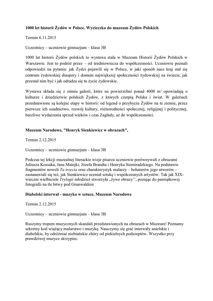 1000 let historii Żydów w Polsce. Wycieczka do muzeum Żydów Polskich Termin 6.11.2015 Uczestnicy – uczniowie gimnazjum – klasa 3B 1000 lat historii Żydów polskich to wystawa stała w Muzeum Historii Żydów Polskich w Warszawie. Jest to podróż przez – od średniowiecza do współczesności. Uczniowie poznali odpowiedzi na pytania: jak Żydzi pojawili się w Polsce, w jaki sposób nasz kraj stał się centrum żydowskiej diaspory i domem największej społeczności żydowskiej na świecie, jak przestał nim być i jak odradza się tu życie żydowskie. Wystawa składa się z ośmiu galerii, które na powierzchni ponad 4000 m2 opowiadają o kulturze i dziedzictwie polskich Żydów, z których czerpią Polska i świat. W galeriach przedstawione są kolejne etapy w historii: od legend o przybyciu Żydów na te ziemie, przez pierwsze ich osadnictwo, rozwój kultury, różnorodności społecznej, religijnej i politycznej, burzliwe wydarzenia sprzed wieków i czas Zagłady, aż do współczesności. Muzeum Narodowe, "Henryk Sienkiewicz w obrazach", Termin 2.12.2015 Uczestnicy – uczniowie gimnazjum – klasa 3B Podczas tej lekcji muzealnej literackie wizje pisarza uczniowie porównywali z obrazami Juliusza Kossaka, Jana Matejki, Józefa Brandta i Henryka Siemiradzkiego. Na podstawie fragmentów noweli Ta trzecia oraz charakterystyk malarzy – bohaterów jego utworów – zastanawiali się też, jak Sienkiewicz oceniał sztukę i współczesnych artystów. Tak jak XIXwieczni wielbiciele Trylogii młodzież stworzyła „żywe obrazy’’, pozując do pamiątkowej fotografii na tle bitwy pod Grunwaldem Diabelski interwał - muzyka w sztuce, Muzeum Narodowe Termin 2.12.2015 Uczestnicy – uczniowie gimnazjum – klasa 3B Ruszymy tropem muzycznych skandali przedstawionych na obrazach w Muzeum! Poznamy sekretny kod wiążący malarstwo i muzykę. Nauczymy się grać interwały anielskie i diabelskie, by odróżniać niebiańskie chóry od piekielnych podszeptów. Wszystko przy prawdziwej muzyce skrzypiec.