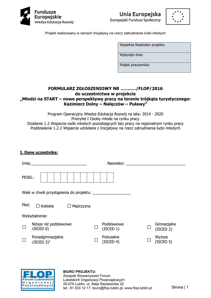 Projekt realizowany w ramach Inicjatywy na rzecz zatrudnienia ludzi młodych Wypełnia Realizator projektu Wpłynęło dnia: Podpis pracownika: FORMULARZ ZGŁOSZENIOWY NR ……..…/FLOP/2016 do uczestnictwa w projekcie „Młodzi na START – nowe perspektywy pracy na terenie trójkąta turystycznego: Kazimierz Dolny – Nałęczów – Puławy” Program Operacyjny Wiedza Edukacja Rozwój na lata: 2014 - 2020 Priorytet I Osoby młode na rynku pracy Działanie 1.2 Wsparcie osób młodych pozostających bez pracy na regionalnym rynku pracy Poddziałanie 1.2.2 Wsparcie udzielane z Inicjatywy na rzecz zatrudnienia ludzi młodych I. Dane uczestnika: Imię:__________________________ Nazwisko: ____________________________ PESEL: Wiek w chwili przystąpienia do projektu: __________________ Płeć: □ Kobieta □ Mężczyzna Wykształcenie: □ Niższe niż podstawowe (ISCED 0) □ Podstawowe (ISCED 1) □ Gimnazjalne (ISCED 2) □ Ponadgimnazjalne (ISCED 3)1 □ Policealne (ISCED 4) □ Wyższe (ISCED 5) BIURO PROJEKTU: Związek Stowarzyszeń Forum Lubelskich Organizacji Pozarządowych 20-076 Lublin, ul. Aleje Racławickie 22 tel.: 81 533 12 17, [email protected], www.flop.lublin.pl Strona | 1 Projekt realizowany w ramach Inicjatywy na rzecz zatrudnienia ludzi młodych II. Dane kontaktowe uczestnika: Adres zamieszkania:2 Ulica: ____________________________ Nr domu: __________ Nr lokalu: ________ Miejscowość: ______________________ Kod pocztowy: ________________________ Gmina: ___________________________ Powiat: ______________________________ Województwo: ________________________________ Obszar zamieszkania według stopnia urbanizacji (DEGURBA): □ obszar gęsto zaludniony - 1 □ obszar o średniej gęstości zaludnienia – 2 (powiat puławski: gmina miejska Puławy) □ obszar słabo zaludniony – 3 (powiat puławski: gminy miejsko-wiejskie, gminy wiejskie) Telefon kontaktowy: _________________ E-mail: ______________________________ III. Status uczestnika na rynku pracy w chwili przystąpienia do projektu: Osoba pracująca3 Osoba bezrobotna4 - w tym: osoba bezrobotna niezarejestrowana w ewidencji urzędów pracy - w tym: osoba bezrobotna zarejestrowana w ewidencji urzędów pracy - w tym: osoba długotrwale bezrobotna5 Osoba bierna zawodowo6 Osoba ucząca się Osoba nieuczestnicząca w kształceniu lub szkoleniu7 BIURO PROJEKTU: Związek Stowarzyszeń Forum Lubelskich Organizacji Pozarządowych 20-076 Lublin, ul. Aleje Racławickie 22 tel.: 81 533 12 17, [email protected], www.flop.lublin.pl □ TAK □ NIE □ TAK □ NIE □ TAK □ NIE □ TAK □ NIE □ TAK □ NIE □ TAK □ NIE □ TAK □ NIE □ TAK □ NIE Strona | 2 Projekt realizowany w ramach Inicjatywy na rzecz zatrudnienia ludzi młodych IV. Status uczestnika w chwili przystąpienia do projektu: □ TAK □ NIE Osoba należąca do mniejszości narodowej lub etnicznej, migrant, osoba obcego pochodzenia □ TAK □ NIE Osoba bezdomna lub dotknięta wykluczeniem z dostępu do mieszkań □ TAK □ NIE Osoba z niepełnosprawnościami9 □ TAK □ NIE Osoba przebywająca w gospodarstwie domowym bez osób pracujących □ TAK □ NIE - w tym: w gospodarstwie domowym z dziećmi pozostającymi na utrzymaniu Osoba żyjąca w gospodarstwie składającym się z jednej osoby dorosłej i dzieci pozostających na utrzymaniu □ TAK □ NIE □ TAK □ NIE Osoba w innej niekorzystnej sytuacji społecznej (innej niż wymienione powyżej) □ TAK □ Osoba należąca do młodzieży z pieczy zastępczej8 NIE □ Odmowa podania informacji □ Odmowa podania informacji □ Odmowa podania informacji V. Preferowany udział w szkoleniach z egzaminem w Projekcie (zaznaczyć właściwe X) Kazimierz Dolny: □ □ □ Pracownik biura podróży z branżowym językiem angielskim Kelner–barman-barista z branżowym językiem angielskim Recepcjonista w hotelarstwie z branżowym językiem angielskim Puławy: □ □ □ Pracownik biura podróży z branżowym językiem angielskim Kelner–barman-barista z branżowym językiem angielskim Recepcjonista w hotelarstwie z branżowym językiem angielskim Nałęczów: □ □ □ Pracownik biura podróży z branżowym językiem angielskim Kelner–barman-barista z branżowym językiem angielskim Recepcjonista w hotelarstwie z branżowym językiem angielskim BIURO PROJEKTU: Związek Stowarzyszeń Forum Lubelskich Organizacji Pozarządowych 20-076 Lublin, ul. Aleje Racławickie 22 tel.: 81 533 12 17, [email protected], www.flop.lublin.pl Strona | 3 Projekt realizowany w ramach Inicjatywy na rzecz zatrudnienia ludzi młodych VI. Oświadczenia uczestnika: Ja, niżej podpisany/a ________________________________________________________ uprzedzony/a o odpowiedzialności karnej za składanie fałszywych oświadczeń wynikających z art. 233 Ustawy z dnia 6 czerwca 1997 r. – Kodeks Karny (Dz. U. Nr 88, poz. 553, z późn. zm.), oświadczam, iż: 1) Spełniam warunki formalne kwalifikujące mnie do udziału w Projekcie zgodnie z Regulaminem Projektu, tj. jestem osobą w wieku 15-29 lat należącą do grupy tzw. młodzieży NEET i spełniam łącznie następujące kryteria: a) nie pracuję (osoba bezrobotna lub bierna zawodowo), b) nie kształcę się (tj. nie uczestniczę w kształceniu formalnym w trybie stacjonarnym rozumianym jako, kształcenie w formach szkolnych w trybie dziennym), c) nie szkolę się (tj. nie uczestniczyłem/am w tego typu formie aktywizacji, finansowanej ze środków publicznych, w okresie ostatnich 4 tygodni), d) zamieszkuję zgodnie z Kodeksem Cywilnym na terenie powiatu puławskiego w województwie lubelskim, e) nie należę do grupy osób określonych dla trybu konkursowego w Poddziałanie 1.3.1 PO WER 2014-2020 (zgodnie z zapisami SZOOP), tj. młodzieży z pieczy zastępczej opuszczająca pieczę (do roku po opuszczeniu instytucji pieczy). 2) Zapoznałem/am się z Regulaminem Uczestnictwa w Projekcie i akceptuję jego warunki. 3) Dobrowolnie deklaruję udział w projekcie „Młodzi na