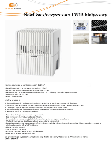 Nawilżacz/oczyszczacz LW15 biały/szary Nawilża powietrze w pomieszczeniach do 20m². ● ● ● ● ● Nawilża powietrze w pomieszczeniach do 20 m² Oczyszcza powietrze w pomieszczeniach do 10 m² Ekonomiczny i kompaktowy Venta-Airwasher LW15 idealny do małych pomieszczeń. Wymiary: 26 x 28 x 31cm Kolor: biały / szary Idealny w walce z: 1. 2. 3. 4. 5. ● ● ● ● ● ● ● ● ● Przeziębieniami i drażniącym kaszlem powstałym w wyniku wysuszonych śluzówek. Efektem podrażnionego gardła, zapchanego nosa, wysuszonej skóry i spierzchniętych ust. "Zimnym" dymem papierosowym i innymi nieprzyjemnymi zapachami. Rozsychaniem się drewnianych mebli, parkietów i instrumentów muzycznych. Kurzem, sierścią zwierzęcą i pyłkami. Podwójna funkcja: nawilżanie i oczyszczanie Bez wymiennych filtrów: woda jest filtrem Można jednym ruchem wyjąć silnik i wentylator, aby wyczyścić urządzenie Wieloletnia trwałość dzięki podwójnej wzmocnionej konstrukcji Uwalnia powietrze od zanieczyszczeń m.in. kurzu, pyłków, nieprzyjemnych zapachów i innych zanieczyszczeń o wielkości powyżej 10 µ (10/1000 mm) Niskie zużycie energii 100% Made in Germany Przeznaczony do całorocznego użytkowania Gwarancja DOOR-TO-DOOR 2 lata Do gruntownego czyszczenia urządzenia co pół roku polecamy Oczyszczacz /Odkamieniacz Venta Cena: 849PLN