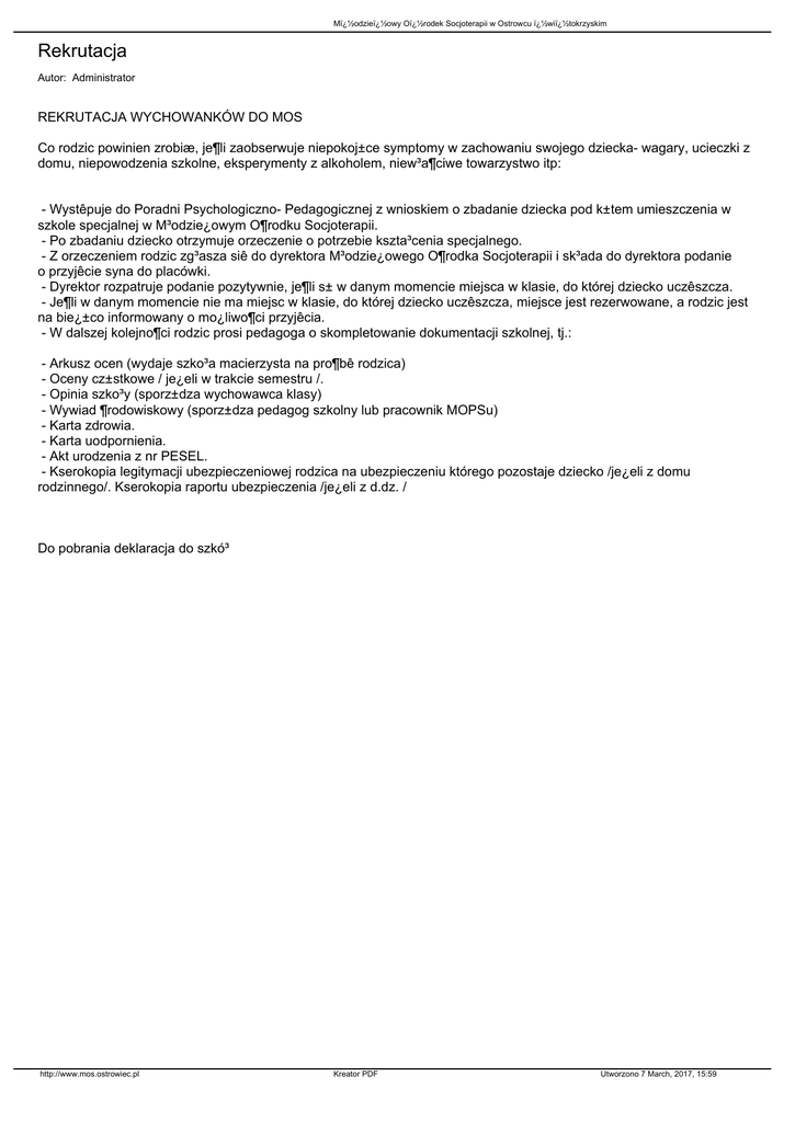 M�odzie�owy O�rodek Socjoterapii w Ostrowcu �wi�tokrzyskim Rekrutacja Autor: Administrator REKRUTACJA WYCHOWANKÓW DO MOS Co rodzic powinien zrobiæ, je¶li zaobserwuje niepokoj±ce symptomy w zachowaniu swojego dziecka- wagary, ucieczki z domu, niepowodzenia szkolne, eksperymenty z alkoholem, niew³a¶ciwe towarzystwo itp: - Wystêpuje do Poradni Psychologiczno- Pedagogicznej z wnioskiem o zbadanie dziecka pod k±tem umieszczenia w szkole specjalnej w M³odzie¿owym O¶rodku Socjoterapii. - Po zbadaniu dziecko otrzymuje orzeczenie o potrzebie kszta³cenia specjalnego. - Z orzeczeniem rodzic zg³asza siê do dyrektora M³odzie¿owego O¶rodka Socjoterapii i sk³ada do dyrektora podanie o przyjêcie syna do placówki. - Dyrektor rozpatruje podanie pozytywnie, je¶li s± w danym momencie miejsca w klasie, do której dziecko uczêszcza. - Je¶li w danym momencie nie ma miejsc w klasie, do której dziecko uczêszcza, miejsce jest rezerwowane, a rodzic jest na bie¿±co informowany o mo¿liwo¶ci przyjêcia. - W dalszej kolejno¶ci rodzic prosi pedagoga o skompletowanie dokumentacji szkolnej, tj.: - Arkusz ocen (wydaje szko³a macierzysta na pro¶bê rodzica) - Oceny cz±stkowe / je¿eli w trakcie semestru /. - Opinia szko³y (sporz±dza wychowawca klasy) - Wywiad ¶rodowiskowy (sporz±dza pedagog szkolny lub pracownik MOPSu) - Karta zdrowia. - Karta uodpornienia. - Akt urodzenia z nr PESEL. - Kserokopia legitymacji ubezpieczeniowej rodzica na ubezpieczeniu którego pozostaje dziecko /je¿eli z domu rodzinnego/. Kserokopia raportu ubezpieczenia /je¿eli z d.dz. / Do pobrania deklaracja do szkó³ http://www.mos.ostrowiec.pl Kreator PDF Utworzono 7 March, 2017, 15:59