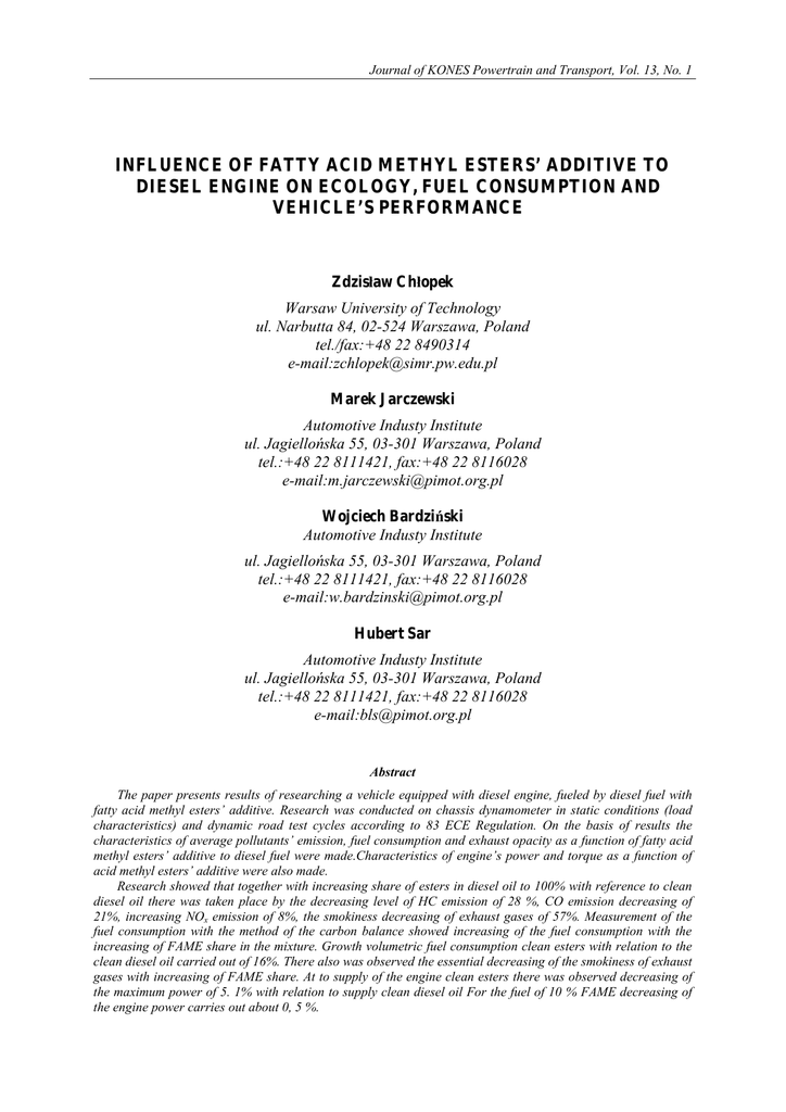 Journal of KONES Powertrain and Transport, Vol. 13, No. 1 INFLUENCE OF FATTY ACID METHYL ESTERS’ ADDITIVE TO DIESEL ENGINE ON ECOLOGY, FUEL CONSUMPTION AND VEHICLE’S PERFORMANCE Zdzisáaw Cháopek Warsaw University of Technology ul. Narbutta 84, 02-524 Warszawa, Poland tel./fax:+48 22 8490314 e-mail:[email protected] Marek Jarczewski Automotive Industy Institute ul. JagielloĔska 55, 03-301 Warszawa, Poland tel.:+48 22 8111421, fax:+48 22 8116028 e-mail:[email protected] Wojciech BardziĔski Automotive Industy Institute ul. JagielloĔska 55, 03-301 Warszawa, Poland tel.:+48 22 8111421, fax:+48 22 8116028 e-mail:[email protected] Hubert Sar Automotive Industy Institute ul. JagielloĔska 55, 03-301 Warszawa, Poland tel.:+48 22 8111421, fax:+48 22 8116028 e-mail:[email protected] Abstract The paper presents results of researching a vehicle equipped with diesel engine, fueled by diesel fuel with fatty acid methyl esters’ additive. Research was conducted on chassis dynamometer in static conditions (load characteristics) and dynamic road test cycles according to 83 ECE Regulation. On the basis of results the characteristics of average pollutants’ emission, fuel consumption and exhaust opacity as a function of fatty acid methyl esters’ additive to diesel fuel were made.Characteristics of engine’s power and torque as a function of acid methyl esters’ additive were also made. Research showed that together with increasing share of esters in diesel oil to 100% with reference to clean diesel oil there was taken place by the decreasing level of HC emission of 28 %, CO emission decreasing of 21%, increasing NOx emission of 8%, the smokiness decreasing of exhaust gases of 57%. Measurement of the fuel consumption with the method of the carbon balance showed increasing of the fuel consumption with the increasing of FAME share in the mixture. Growth volumetric fuel consumption clean esters with relation to the clean diesel oil carried out of 16%. There also was observed the essential decreasing of the smokiness of exhaust gases with increasing of FAME share. At to supply of the engine clean esters there was observed decreasing of the maximum power of 5. 1% with relation to supply clean diesel oil For the fuel of 10 % FAME decreasing of the engine power carries out about 0, 5 %. Z. Cháopek, M. Jarczewski, W. BardziĔski, H. Sar Keywords: car vehicles , compression-ignition engines, alternative fuels, emissions, the fuel consumption WPàYW DODATKU ESTRU METYLOWEGO OLEJU RZEPAKOWEGO FAME DO OLEJU NAPĉDOWEGO NA EKOLOGIĉ, ZUĩYCIE PALIWA ORAZ WàASNOĝCI DYNAMICZNE SAMOCHODU Streszczenie Artykuá prezentuje badania pojazdu zaopatrzonego w silnik diesla, zasilany olejem napĊdowym z dodatkiem estrów metylowych kwasu táuszczowego(FAME). Badania byáy prowadzone na hamowni podwoziowej w warunkach statycznych (charakterystyka obciąĪeniowa) i dynamicznych cyklach testu drogowego stosownie do Przepisów 83 ECE. Na bazie wyników charakterystyka Ğrednich wartoĞci skáadników toksycznych, zuĪycie paliwa i wyglądu spalin zostaáy opracowane charakterystyki mocy silnika i momentu obrotowego w funkcji dodatku estrów metylowych do oleju napĊdowego. Badania wykazaáy, Īe wraz ze wzrostem udziaáu estrów w oleju napĊdowym do 100% w odniesieniu do czystego oleju napĊdowego nastąpiá spadek poziomu emisji HC o 28 %, spadek emisji CO o 21%, wzrost emisji NOx o 8%, spadek zadymienia spalin o 57%. Pomiary zuĪycia paliwa metodą bilansu wĊgla wykazaáy wzrost zuĪycia paliwa ze wzrostem udziaáów FAME w mieszaninie. Wzrost objĊtoĞciowego zuĪycia czystych estrów w stosunku do czystego oleju napĊdowego wyniósá ok. 16%. Zaobserwowano teĪ istotne zmniejszenie zadymienia spalin ze wzrostem udziaáu FAME. Przy zasilaniu silnika czystymi estrami zaobserwowano spadek mocy maksymalnej o 5,1% w stosunku do zasilania czystym olejem napĊdowym, dla paliwa z 10 % dodatkiem FAME spadek mocy silnika wynosi okoáo 0,5 %. Sáowa kluczowe: pojazdy samochodowe, silniki wysokoprĊĪne, paliwa alternatywne, emisja, zuĪycie paliwa 1. WstĊp Celem badaĔ byáo okreĞlenie wpáywu stosowania paliwa pochodzenia roĞlinnego- estrów metylowych oleju rzepakowego (FAME) na poziom emisji spalin, zuĪycia paliwa oraz osiągów dynamicznych samochodu osobowego z silnikiem o zapáonie samoczynnym. Badania prowadzono w warunkach laboratoryjnych na stanowisku hamowni podwoziowej. 2. Zakres badaĔ Zakres badaĔ obejmowaá pomiary mocy oraz pomiary emisji i zuĪycia paliwa realizowane w testach jezdnych wg regulaminów homologacyjnych [3], [5]. Pomiary te byáy wykonane w seriach, dla róĪnych udziaáów objĊtoĞciowych biopaliwa w oleju napedowym, a mianowicie: ¾ ¾ ¾ ¾ ¾ 100 % oleju napĊdowego, 90 % oleju napĊdowego , 10 % estrów (FAME), 80 % oleju napĊdowego , 20 % estrów (FAME), 50 % oleju napĊdowego , 50 % estrów (FAME), 100 % estrów (FAME). Zakres badaĔ byá rozszerzony o serie innych typów testów jezdnych: test autostradowy, test HWFET i test „Stop-and-Go”, a takĪe o wykonanie charakterystyk obciąĪeniowych. Wyniki tych badaĔ zostaáy przedstawione na konferencjach PTNSS [4] i KONES w roku 2005. 3. Obiekt badaĔ i stosowane paliwa Obiektem badaĔ byá samochód CITROËN Berlingo wyposaĪony w silnik wysokoprĊĪny o pojemnoĞci skokowej 1868 cm3 i mocy znamionowej 51 kW. Silnik ten byá wyposaĪony w rotacyjną pompĊ wtryskową. Do badaĔ stosowano nastĊpujące paliwa i ich mieszaniny: 262 INFLUENCE OF FATTY ACID METHYL ESTERS’ ADDITIVE TO DIESEL ENGINE ON ECOLOGY ¾ olej napĊdowy handlowy ON, o skáadzie zgodnym z wymaganiami normy PN-EN 590, ¾ paliwo BIODIESEL F- FAME, produkcji Rafinerii Trzebinia , speániające wymagania normy PN-EN 14214. Wybrane wáaĞciwoĞci obu ww. paliw zamieszczono w Tablicy 1. Tab. 1. Wybrane wáaĞciwoĞci paliw stosowanych w badaniach Tab. 1. Selected properties of fuels used in research WáaĞciwoĞü GĊstoĞü [kg/dm3] LepkoĞü kinetyczna [mm2/s] (2