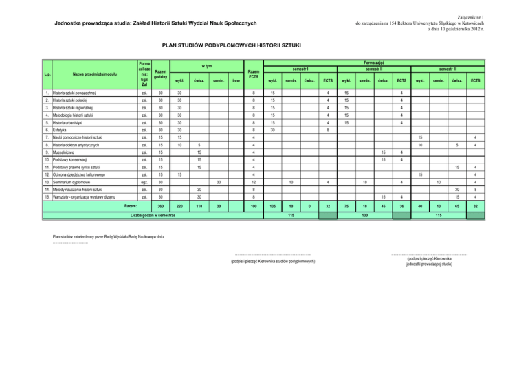 Załącznik nr 1 do zarządzenia nr 154 Rektora Uniwersytetu Śląskiego w Katowicach z dnia 10 października 2012 r. Jednostka prowadząca studia: Zakład Historii Sztuki Wydział Nauk Społecznych PLAN STUDIÓW PODYPLOMOWYCH HISTORII SZTUKI L.p. Forma zalicze Razem nia: godziny Egz/ Zal Nazwa przedmiotu/modułu w tym wykł. ćwicz. semin. inne Razem ECTS Forma zajęć semestr II semestr I wykł. semin. ćwicz. ECTS wykł. semin. ćwicz. semestr III ECTS 1. Historia sztuki powszechnej zal. 30 30 8 15 4 15 4 2. Historia sztuki polskiej zal. 30 30 8 15 4 15 4 3. Historia sztuki regionalnej zal. 30 30 8 15 4 15 4 4. Metodologia historii sztuki zal. 30 30 8 15 4 15 4 5. Historia urbanistyki zal. 30 30 8 15 4 15 4 6. Estetyka zal. 30 30 8 30 8 7. Nauki pomocnicze historii sztuki zal. 15 15 8. Historia doktryn artystycznych zal. 15 10 9. Muzealnictwo zal. 10. Podstawy konserwacji 11. Podstawy prawne rynku sztuki wykł. 4 15 5 4 10 15 15 4 15 4 zal. 15 15 4 15 4 zal. 15 15 4 12. Ochrona dziedzictwa kulturowego zal. 15 13. Seminarium dyplomowe egz. 30 14. Metody nauczania historii sztuki zal. 30 30 8 15. Warsztaty - organizacja wystawy dizajnu zal. 30 30 8 Razem: 360 Liczba godzin w semestrze 15 4 30 220 110 30 ćwicz. 10 4 10 4 4 4 15 4 4 10 4 30 105 10 0 115 32 75 10 130 15 4 45 36 40 10 ………………………………………………………… 8 15 4 65 32 115 Plan studiów zatwierdzony przez Radę Wydziału/Radę Naukową w dniu ………....……………… (podpis i pieczęć Kierownika studiów podyplomowych) ECTS 5 15 12 100 semin. ………………………………………………………… (podpis i pieczęć Kierownika jednostki prowadzącej studia)
