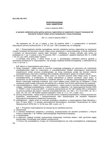 Dz.U.06.142.1017 ROZPORZĄDZENIE RADY MINISTRÓW z dnia 4 sierpnia 2006 r. w sprawie udzielania przez gminy pomocy regionalnej na wspieranie nowych inwestycji lub tworzenie nowych miejsc pracy związanych z nową inwestycją (Dz. U. z dnia 9 sierpnia 2006 r.) Na podstawie art. 70 ust. 3 ustawy z dnia 30 kwietnia 2004 r. o postępowaniu w sprawach dotyczących pomocy publicznej (Dz. U. Nr 123, poz. 1291) zarządza się, co następuje: § 1. 1. Rozporządzenie określa szczegółowe warunki udzielania pomocy regionalnej na wspieranie nowych inwestycji lub tworzenie nowych miejsc pracy związanych z nową inwestycją, w formie zwolnienia z podatku od nieruchomości, zwanej dalej "pomocą", udzielanej w drodze uchwały rady gminy na podstawie art. 7 ust. 3 ustawy z dnia 12 stycznia 1991 r. o podatkach i opłatach lokalnych (Dz. U. z 2006 r. Nr 121, poz. 844), zwanej dalej "ustawą". 2. Uchwała rady gminy, o której mowa w ust. 1, przewidująca udzielanie pomocy zgodnie z warunkami określonymi w rozporządzeniu, nie podlega notyfikacji Komisji Europejskiej, z zastrzeżeniem § 3 ust. 2 i § 9 ust. 3. § 2. Ilekroć w rozporządzeniu jest mowa o: 1) nowej inwestycji - należy przez to rozumieć inwestycję polegającą na utworzeniu lub rozbudowie przedsiębiorstwa bądź na rozpoczęciu w przedsiębiorstwie działań obejmujących dokonywanie zasadniczych zmian procesu produkcyjnego; za nową inwestycję uznaje się również nabycie przedsiębiorstwa, które jest w likwidacji albo zostałoby zlikwidowane, gdyby nie zostało nabyte; 2) tworzeniu nowych miejsc pracy - należy przez to rozumieć przyrost netto miejsc pracy w danym przedsiębiorstwie, w przeliczeniu na osoby zatrudnione w pełnym wymiarze czasu pracy, w porównaniu ze średnim zatrudnieniem z ostatnich pełnych 12 miesięcy poprzedzających miesiąc, w którym rozpoczęto realizację inwestycji, przy czym miejsca pracy uważa się za związane z nową inwestycją, jeżeli zostały utworzone nie później niż w okresie 3 lat od dnia zakończenia tej inwestycji; 3) mikroprzedsiębiorcy, małym i średnim przedsiębiorcy - należy przez to rozumieć mikroprzedsiębiorcę, małego i średniego przedsiębiorcę, o których mowa w załączniku I do rozporządzenia Komisji (WE) nr 70/2001 z dnia 12 stycznia 2001 r. w sprawie zastosowania art. 87 i 88 Traktatu WE w odniesieniu do pomocy państwa dla małych i średnich przedsiębiorstw (Dz. Urz. WE L 10 z 13.01.2001, str. 33, z późn. zm.; Dz. Urz. UE Polskie wydanie specjalne, rozdz. 8, t. 2, s. 141, z późn. zm.); 4) pomocy eksportowej - należy przez to rozumieć pomoc związaną bezpośrednio z ilością wywożonych produktów, ustanowieniem i funkcjonowaniem sieci dystrybucyjnej lub kosztami bieżącymi dotyczącymi prowadzenia działalności wywozowej; 5) podregionach - należy przez to rozumieć podregiony określone w rozporządzeniu Rady Ministrów z dnia 13 lipca 2000 r. w sprawie wprowadzenia Nomenklatury Jednostek Terytorialnych do Celów Statystycznych (NTS) (Dz. U. Nr 58, poz. 685, z późn. zm.1)). § 3. 1. Przepisów rozporządzenia nie stosuje się do udzielania pomocy: 1) eksportowej; 2) w zakresie działalności związanej z produkcją, przetwarzaniem lub obrotem produktami, o których mowa w załączniku 1 do Traktatu ustanawiającego Wspólnotę Europejską; 3) w rybołówstwie; 4) w sektorach: żeglugi morskiej, budownictwa okrętowego, hutnictwa żelaza i stali, górnictwa węgla kamiennego i brunatnego oraz włókien syntetycznych. 2. Pomoc dla przedsiębiorcy innego niż mikroprzedsiębiorca lub mały przedsiębiorca znajdującego się: 1) w trudnej sytuacji ekonomicznej, według kryteriów określonych w przepisach prawa Unii Europejskiej dotyczących udzielania pomocy publicznej2) lub 2) w okresie restrukturyzacji przeprowadzanej z wykorzystaniem pomocy publicznej - podlega notyfikacji Komisji Europejskiej jako pomoc indywidualna, z zastrzeżeniem ust. 3. 3. Pomoc nie podlega notyfikacji Komisji Europejskiej jako pomoc indywidualna, w przypadku gdy przedsiębiorca, o którym mowa w ust. 2, zamierza skorzystać lub korzysta z indywidualnej pomocy na restrukturyzację, jeżeli wraz z notyfikacją projektu pomocy indywidualnej na restrukturyzację informacja o pomocy regionalnej została przekazana Komisji Europejskiej. 4. W przypadku, o którym mowa w ust. 3, pomoc może być udzielona po zatwierdzeniu przez Komisję Europejską pomocy indywidualnej na restrukturyzację. § 4. 1. Do kosztów kwalifikujących się do objęcia pomocą na wspieranie nowych inwestycji zalicza się: 1) cenę nabycia gruntów lub prawa ich wieczystego użytkowania; 2) cenę nabycia albo koszt wytworzenia środków trwałych, takich jak budowle i budynki oraz ich wyposażenie związane z nową inwestycją, w szczególności: a) maszyny i urządzenia, b) narzędzia, przyrządy i aparatura, c) wyposażenie techniczne dla prac biurowych, d) infrastruktura techniczna; 3) cenę nabycia wartości niematerialnych i prawnych polegających na uzyskaniu patentu, nabyciu licencji lub nieopatentowanego know-how, z zastrzeżeniem ust. 2. 2. W przypadku przedsiębiorcy innego niż mikroprzedsiębiorca, mały lub średni przedsiębiorca, koszt określony w ust. 1 pkt 3 uwzględnia się w kosztach inwestycji kwalifikujących się do objęcia pomocą w wysokości nieprzekraczającej 25 % wartości kosztów, o których mowa w ust. 1 pkt 1 i 2. 3. Wartości niematerialne i prawne, o których mowa w ust. 1 pkt 3, powinny spełniać łącznie następujące warunki: 1) będą wykorzystywane wyłącznie przez przedsiębiorcę otrzymującego pomoc regionalną w przedsiębiorstwie zlokalizowanym w podregionie, w którym jest realizowana inwestycja; 2) będą nabyte od osoby trzeciej na warunkach nieodbiegających od normalnych praktyk inwestycyjnych; 3) będą ujęte w aktywach przedsiębiorstwa oraz pozostaną w jego posiadaniu przez okres co najmniej 5 lat; 4) będą podlegać amortyzacji zgodnie z odr
