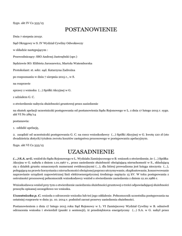 Sygn. akt IV Ca 333/15 POSTANOWIENIE Dnia 7 sierpnia 2015r. Sąd Okręgowy w S. IV Wydział Cywilny Odwoławczy w składzie następującym : Przewodniczący: SSO Andrzej Jastrzębski (spr.) Sędziowie SO: Elżbieta Jaroszewicz, Mariola Watemborska Protokolant: st. sekr. sąd. Katarzyna Zadrożna po rozpoznaniu w dniu 7 sierpnia 2015 r., w S. na rozprawie sprawy z wniosku (...) Spółki Akcyjnej w G. z udziałem G. C. o stwierdzenie nabycia służebności gruntowej przez zasiedzenie na skutek apelacji uczestniczki postępowania od postanowienia Sądu Rejonowego w L. z dnia 17 lutego 2015 r. sygn. akt VI Ns 289/14 postanawia: 1. oddalić apelację, 2. zasądzić od uczestniczki postępowania G. C. na rzecz wnioskodawcy (...) Spółki Akcyjnej w G. kwotę 120 zł (sto dwadzieścia złotych) tytułem zwrotu kosztów zastępstwa procesowego w postępowaniu apelacyjnym. Sygn. akt VI Ca 333/15 UZASADNIENIE (...) S.A. w G. wniósł do Sądu Rejonowego w L. Wydziału Zamiejscowego w B. wniosek o stwierdzenie, że (...) Spółka Akcyjna w G. nabyła z dniem 1.01.1967 r., przez zasiedzenie służebność obciążającą nieruchomość w S., składającą się z działek gruntu oznaczonych numerami ewidencyjnymi (...), dla której prowadzona jest księga nieczysta (...), polegającą na prawie korzystania z nieruchomości obciążonej poprzez utrzymywanie, eksploatowanie, konserwowanie naprawianie urządzeń napowietrznej linii elektroenergetycznej średniego napięcia 15 kV. W toku postępowania z ostrożności procesowej pełnomocnik wnioskodawcy wniósł o stwierdzenie zasiedzenia z dniem 12.10.1986 r. Wnioskodawca wniósł przy tym o stwierdzenie zasiedzenia służebności gruntowej o treści odpowiadającej służebności przesyłu opisanej szczegółowo we wniosku. Uczestniczka p. C. wniosła o odrzecenie wniosku lub też jego oddalenie. Pełnomocnik uczestnika postępowania na ostatniej rozprawie w dniu 31. 10. 2014 r. podniósł zarzut przerwy zasiedzenia służebności. Postanowieniem z dnia 17 lutego 2015 roku Sąd Rejonowy w L. VI Zamiejscowy Wydział Cywilny w B. odmówił odrzucenia wniosku i stwierdził (punkt 2 sentencji), iż przedsiębiorca energetyczny (...) S.A. w G. nabył przez zasiedzenie służebność gruntową o treści odpowiadającej służebności przesyłu, polegającą na prawie do korzystania z nieruchomości obciążonej objętą księgą wieczystą nr (...) (działki ewidencyjne nr (...)), poprzez utrzymanie, konserwację, naprawę i eksploatację znajdujących się na niej urządzeń napowietrznej linii energetycznych średniego napięcia 15 kV (w tym odgałęzienia na działce ewidencyjnej nr (...)), stanowiących własność przedsiębiorcy energetycznego oraz na zezwoleniu mu na wejście i wjazd na nieruchomość obciążoną, w każdej chwili trwania służebności, w celu wykonania niezbędnych robót związanych z utrzymaniem, konserwacją, naprawą i eksploatacją znajdującej się na niej napowietrznej linii energetycznej średniego napięcia 15 kV, w szczególności sprzętem, w tym także ciężkim, w obszarze pasów określonych w opinii biegłego sądowego P. J. (1), najpóżniej z dniem 1 stycznia 2007 r. Nadto Sąd ustalił, iż wnioskodawca i uczestnik postępowania ponoszą we własnym zakresie koszty postępowania związane ze swym udziałem w sprawie (punkt 3 sentencji). Przedmiotowe orzeczenie zostało oparte na następujących ustaleniach. Wnioskodawczyni była do dnia zamknięcia rozprawy właścicielką nieruchomości objętej działkami ewidencyjnymi o numerach: (...), dla której to nieruchomości Sąd Rejonowy w L. prowadzi księgę wieczystą nr (...). Co najmniej od dnia złożenia wniosku o założenie tej księgi wieczystej, tj. od 14. 06. 1967 r. nieruchomość - objęta tymi (...) działkami ewidencyjnymi – do chwili zamknięcia rozprawy stanowiła zawsze przedmiot własności osób fizycznych. Jak dalej wskazał sąd I instancji w okresie powojennym – co jest faktem powszechnie znanym – wprowadzono w Polsce ustrój polityczno-gospodarczy zwany ustrojem socjalistycznym, który funkcjonował do 1989 r., gdy rozpoczęły się reformy o charakterze rynkowym, poczynając od zniesienia szeregu koncesji oraz od dnia 01.02.1989r., od kiedy przedsiębiorstwa państwowe uzyskały zdolność nabywania mienia we własnym imieniu i na własną rzecz. Ustrój ten cechowała przede wszystkim gospodarka oparta na dominującej własności Skarbu Państwa. W tym okresie status przedsiębiorstw uregulowany został w następujący sposób: • w dniu 28 października 1950 r. wszedł w życie dekret z dnia 26 października 1950 r. o przedsiębiorstwach państwowych (Dz.U.1950.49.439 ze zm., tj. Dz. U. z 1960 r. Nr 18, poz. 111), • z dniem 1 października 1981 r. weszła w życie ustawa z dnia z dnia 25 września 1981 r. o przedsiębiorstwach państwowych (Dz.U.1981.24.12 ze zm.). Te akty prawne dotyczyły ogółu przedsiębiorstw państwowych tym energetycznych. Sąd wskazał, że na mocy dekretu z dnia 3 stycznia 1947 roku powołane zostało Ministerstwo Przemysłu i Handlu, które objęło swą działalnością 16 centralnych zarządów przemysłowych działających do końca 1946 roku na prawach departamentów branżowych, a od 1 stycznia 1947 roku przekształconych w przedsiębiorstwo państwowe. Bezpośrednie niższym szczeblem w tej hierarchii były Zjednoczenia. W energetyce Zjednoczenia były wielozakładowymi przedsiębiorstwami państwowymi, posiadającymi osobowość prawną. Zgodnie z ustawą z dnia 4 lipca 1947 roku, zjednoczeniom energetycznym podporządkowano wszystkie zakłady energetyczne położone na terenie danego okręgu energetycznego bez względu na to czyją były własnością, z wyjątkiem zakładów nie zbywających zawodowo energii elektrycznej i zakładów nie związanych z państwową lub okręgową siecią elektryczną. Rozporządzeniem Ministra Przemysłu i Handlu z dnia 20 lipca 1948 roku, obszar państwa podzielon
