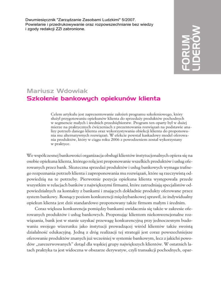 FORUM LIDERÓW Dwumiesięcznik "Zarządzanie Zasobami Ludzkimi" 5/2007. Powielanie i przedrukowywanie oraz rozpowszechnianie bez wiedzy i zgody redakcji ZZl zabronione. Mariusz Wdowiak Szkolenie bankowych opiekunów klienta Forum liderówCelem artyku³u jest zaprezentowanie za³o¿eñ programu szkoleniowego, który s³u¿y³ przygotowaniu opiekunów klienta do sprzeda¿y produktów pochodnych w segmencie ma³ych i rednich przedsiêbiorstw. Program ten oparty by³ w du¿ej mierze na praktycznych æwiczeniach z prezentowania rozwi¹zañ na podstawie analizy potrzeb danego klienta oraz wykorzystywania obiekcji klienta do proponowania mu alternatywnych rozwi¹zañ. W efekcie powsta³ kaskadowy model oferowania produktów, który w ci¹gu roku 2006 z powodzeniem zosta³ wykorzystany w praktyce. We wspó³czesnej bankowoci organizacja obs³ugi klientów instytucjonalnych opiera siê na osobie opiekuna klienta, którego rol¹ jest proponowanie wszelkich produktów i us³ug oferowanych przez bank. Skuteczna sprzeda¿ produktów i us³ug bankowych wymaga trafnego rozpoznania potrzeb klienta i zaproponowania mu rozwi¹zañ, które s¹ rzeczywist¹ odpowiedzi¹ na te potrzeby. Pierwotnie pozycja opiekuna klienta wystêpowa³a przede wszystkim w relacjach banków z najwiêkszymi firmami, które zatrudniaj¹ specjalistów odpowiedzialnych za kontakty z bankami i znaj¹cych dok³adnie produkty oferowane przez system bankowy. Rosn¹cy poziom konkurencji miêdzybankowej sprawi³, ¿e indywidualny opiekun klienta jest dzi standardowo proponowany tak¿e firmom ma³ym i rednim. Coraz wiêksza konkurencja pomiêdzy bankami uwidacznia siê tak¿e w zakresie oferowanych produktów i us³ug bankowych. Proponuj¹c klientom niekonwencjonalne rozwi¹zania, bank jest w stanie uzyskaæ przewagê konkurencyjn¹ przy jednoczesnym budowaniu swojego wizerunku jako instytucji prowadz¹cej wród klientów tak¿e swoist¹ dzia³alnoæ edukacyjn¹. Jedn¹ z dróg realizacji tej strategii jest coraz powszechniejsze oferowanie produktów znanych ju¿ wczeniej w systemie bankowym, lecz z jakich powodów zarezerwowanych dot¹d dla w¹skiej grupy najwiêkszych klientów. W ostatnich latach praktyka ta jest widoczna w obszarze derywatyw, czyli transakcji pochodnych, opar- 102 Forum liderów tych na zmiennoci kursów walutowych lub stóp procentowych. W przypadku wielkich firm zajmuj¹ siê tym ich w³asne piony finansowe, a w przypadku firm mniejszych niezbêdn¹ pomoc zapewniaj¹ w³aciwie przeszkoleni opiekunowie klientów. Jakoæ i zakres szkolenia opiekunów klienta s¹ kluczowymi czynnikami sukcesu w oferowaniu takich rozwi¹zañ. Podstaw¹ jest oczywicie szkolenie produktowe, podczas którego opiekunowie klienta s¹ wyposa¿ani w wiedzê dotycz¹c¹ wszelkich zagadnieñ zwi¹zanych z oferowanymi produktami, ale w przypadku konstruowania rozwi¹zañ nowatorskich lub nieznanych powszechnie bardzo istotny staje siê sposób uwiadomienia klientowi potrzeby uzasadniaj¹cej skorzystanie z takiego rozwi¹zania, czyli zdiagnozowanie szczegó³owej sytuacji klienta, przy jednoczesnym wskazaniu potencjalnych zagro¿eñ mog¹cych wyst¹piæ w przysz³oci. W ten sposób w szkoleniu opiekuna klienta pojawia siê dodatkowy aspekt nabycie umiejêtnoci dynamicznej analizy sytuacji klienta w kontekcie oferowanych produktów bankowych. Uwzglêdniaj¹c powy¿sze, Raiffeisen Bank Polska S.A. wiosn¹ 2006 r. opracowa³ program szkoleniowy dla opiekunów klienta z zakresu produktów pochodnych (derywatyw). Istotnym elementem tego programu by³o praktyczne szkolenie z uwiadamiania klientom mo¿liwoci kryj¹cych siê w oferowanych przez sektor bankowy nowoczesnych rozwi¹zaniach, a nastêpnie z analizowania sytuacji klienta, sytuacji na rynkach walutowych i stóp procentowych oraz z diagnozowania w ich kontekcie potencjalnych potrzeb danego klienta. Prowadz¹cym szkolenie by³ specjalista ds. produktów pochodnych (specjalista produktowy). W odró¿nieniu od klasycznych szkoleñ produktowych, po wyk³adzie z zakresu konkretnego rozwi¹zania nastêpowa³a moderowana dyskusja uczestników na temat praktycznego sensu zastosowania danego produktu, podczas której w odniesieniu do poszczególnych produktów definiowano ich obiektywne zalety i wady. Znajomoæ zalet oferowanego rozwi¹zania jest punktem wyjcia w procesie skutecznej sprzeda¿y szczególnie w przypadku oferowania rozwi¹zañ nowatorskich, gdy nale¿y uwiadomiæ klientowi mo¿liwoæ pojawienia siê okrelonego pozytywnego skutku nabycia danego rozwi¹zania. Znaj¹c zalety oferowanych przez siebie produktów, sprzedawca mo¿e dokonaæ analizy swoich klientów pod k¹tem wra¿liwoci na te zalety, a zatem zbudowaæ listê potencjalnych nabywców, którym powinien zaproponowaæ dane rozwi¹zanie w pierwszej kolejnoci. Z punktu widzenia instytucji komercyjnej oczekiwanym stanem po szkoleniu produktowym jest zbudowanie takiej listy przez ka¿dego uczestnika szkolenia. W opisywanym programie szkoleniowym cel ten zdefiniowano w nieco odmienny sposób: okreliæ uniwersalne cechy (w³aciwoci) klienta, które determinuj¹ wystêpowanie zapotrzebowania na derywatywy. W ten sposób w toku szkolenia wyodrêbniono cztery kategorie klientów statystycznie stanowi¹cych grupê docelow¹ programu sprzeda¿y derywatyw, a wszyscy uczestnicy zostali zobowi¹zani do identyfikacji ka¿dej z tych kategorii we w³asnym portfelu klientów. Okaza³o siê, ¿e cztery wyodrêbnione grupy klientów Forum liderów 103 s¹ wzglêdem siebie doæ mocno zró¿nicowane, dlatego te¿ w odniesieniu do ka¿dej z nich uczestnicy opracowali kluczowe elementy scenariusza pierwszej rozmowy na temat derywatyw, a nastêpnie odgrywali prezentacje zgodnie z za³o¿eniami scenariuszy. Równie istotna jest w sprzeda¿y wiadomoæ wad oferowanych rozwi¹zañ. Ich wystêpowanie implikuje bowiem formu³owanie obiekcji przez klientów, którym przedstawia siê mo¿liwoci zwi¹zane z nowymi produktami. Z punktu widzenia szkolenia szczególnie c