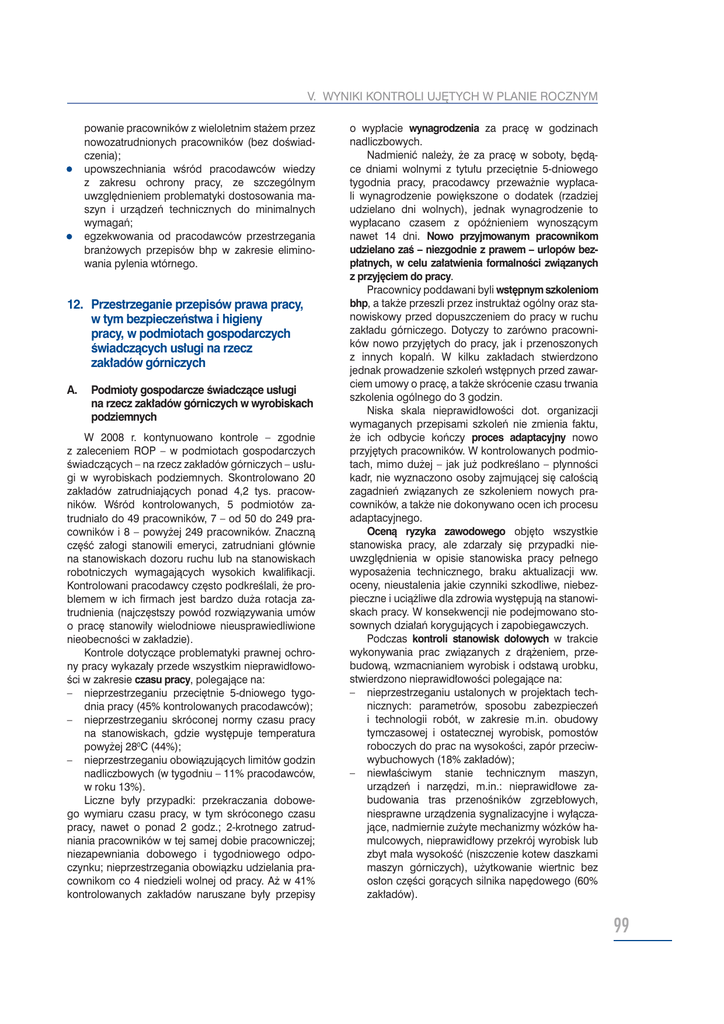 V. WYNIKI KONTROLI UJĘTYCH W PLANIE ROCZNYM powanie pracowników z wieloletnim stażem przez nowozatrudnionych pracowników (bez doświadczenia); upowszechniania wśród pracodawców wiedzy z zakresu ochrony pracy, ze szczególnym uwzględnieniem problematyki dostosowania maszyn i urządzeń technicznych do minimalnych wymagań; egzekwowania od pracodawców przestrzegania branżowych przepisów bhp w zakresie eliminowania pylenia wtórnego. 12. Przestrzeganie przepisów prawa pracy, w tym bezpieczeństwa i higieny pracy, w podmiotach gospodarczych świadczących usługi na rzecz zakładów górniczych A. Podmioty gospodarcze świadczące usługi na rzecz zakładów górniczych w wyrobiskach podziemnych W 2008 r. kontynuowano kontrole – zgodnie z zaleceniem ROP – w podmiotach gospodarczych świadczących – na rzecz zakładów górniczych – usługi w wyrobiskach podziemnych. Skontrolowano 20 zakładów zatrudniających ponad 4,2 tys. pracowników. Wśród kontrolowanych, 5 podmiotów zatrudniało do 49 pracowników, 7 – od 50 do 249 pracowników i 8 – powyżej 249 pracowników. Znaczną część załogi stanowili emeryci, zatrudniani głównie na stanowiskach dozoru ruchu lub na stanowiskach robotniczych wymagających wysokich kwalifikacji. Kontrolowani pracodawcy często podkreślali, że problemem w ich firmach jest bardzo duża rotacja zatrudnienia (najczęstszy powód rozwiązywania umów o pracę stanowiły wielodniowe nieusprawiedliwione nieobecności w zakładzie). Kontrole dotyczące problematyki prawnej ochrony pracy wykazały przede wszystkim nieprawidłowości w zakresie czasu pracy, polegające na: – nieprzestrzeganiu przeciętnie 5-dniowego tygodnia pracy (45% kontrolowanych pracodawców); – nieprzestrzeganiu skróconej normy czasu pracy na stanowiskach, gdzie występuje temperatura powyżej 280C (44%); – nieprzestrzeganiu obowiązujących limitów godzin nadliczbowych (w tygodniu – 11% pracodawców, w roku 13%). Liczne były przypadki: przekraczania dobowego wymiaru czasu pracy, w tym skróconego czasu pracy, nawet o ponad 2 godz.; 2-krotnego zatrudniania pracowników w tej samej dobie pracowniczej; niezapewniania dobowego i tygodniowego odpoczynku; nieprzestrzegania obowiązku udzielania pracownikom co 4 niedzieli wolnej od pracy. Aż w 41% kontrolowanych zakładów naruszane były przepisy o wypłacie wynagrodzenia za pracę w godzinach nadliczbowych. Nadmienić należy, że za pracę w soboty, będące dniami wolnymi z tytułu przeciętnie 5-dniowego tygodnia pracy, pracodawcy przeważnie wypłacali wynagrodzenie powiększone o dodatek (rzadziej udzielano dni wolnych), jednak wynagrodzenie to wypłacano czasem z opóźnieniem wynoszącym nawet 14 dni. Nowo przyjmowanym pracownikom udzielano zaś – niezgodnie z prawem – urlopów bezpłatnych, w celu załatwienia formalności związanych z przyjęciem do pracy. Pracownicy poddawani byli wstępnym szkoleniom bhp, a także przeszli przez instruktaż ogólny oraz stanowiskowy przed dopuszczeniem do pracy w ruchu zakładu górniczego. Dotyczy to zarówno pracowników nowo przyjętych do pracy, jak i przenoszonych z innych kopalń. W kilku zakładach stwierdzono jednak prowadzenie szkoleń wstępnych przed zawarciem umowy o pracę, a także skrócenie czasu trwania szkolenia ogólnego do 3 godzin. Niska skala nieprawidłowości dot. organizacji wymaganych przepisami szkoleń nie zmienia faktu, że ich odbycie kończy proces adaptacyjny nowo przyjętych pracowników. W kontrolowanych podmiotach, mimo dużej – jak już podkreślano – płynności kadr, nie wyznaczono osoby zajmującej się całością zagadnień związanych ze szkoleniem nowych pracowników, a także nie dokonywano ocen ich procesu adaptacyjnego. Oceną ryzyka zawodowego objęto wszystkie stanowiska pracy, ale zdarzały się przypadki nieuwzględnienia w opisie stanowiska pracy pełnego wyposażenia technicznego, braku aktualizacji ww. oceny, nieustalenia jakie czynniki szkodliwe, niebezpieczne i uciążliwe dla zdrowia występują na stanowiskach pracy. W konsekwencji nie podejmowano stosownych działań korygujących i zapobiegawczych. Podczas kontroli stanowisk dołowych w trakcie wykonywania prac związanych z drążeniem, przebudową, wzmacnianiem wyrobisk i odstawą urobku, stwierdzono nieprawidłowości polegające na: – nieprzestrzeganiu ustalonych w projektach technicznych: parametrów, sposobu zabezpieczeń i technologii robót, w zakresie m.in. obudowy tymczasowej i ostatecznej wyrobisk, pomostów roboczych do prac na wysokości, zapór przeciwwybuchowych (18% zakładów); – niewłaściwym stanie technicznym maszyn, urządzeń i narzędzi, m.in.: nieprawidłowe zabudowania tras przenośników zgrzebłowych, niesprawne urządzenia sygnalizacyjne i wyłączające, nadmiernie zużyte mechanizmy wózków hamulcowych, nieprawidłowy przekrój wyrobisk lub zbyt mała wysokość (niszczenie kotew daszkami maszyn górniczych), użytkowanie wiertnic bez osłon części gorących silnika napędowego (60% zakładów). 99 SPRAWOZDANIE GIP Z DZIAŁALNOŚCI PIP W 2008 r. Wykres 46. Zakłady świadczące usługi na rzecz kopalń (w wyrobiskach podziemnych) – naruszenia przepisów spełnienie przez zapory przeciwwybuchowe wymogów określonych w projekcie technicznym wyposażenie stanowisk pracy zgodnie z przepisami bhp rejestr pracowników zatrudnionych w środowisku zagrożonym pyłami szkodliwymi dla zdrowia dojścia do stanowisk pracy wypłata wynagrodzenia za pracę w godzinach nadliczbowych przestrzeganie skróconej normy czasu pracy na stanowiskach gdzie występuje temperatura powyżej 28oC zatrudnianie w przeciętnie pięciodniowym tygodniu czasu pracy % pracodawców naruszających przepisy 0 5 10 15 20 25 30 35 40 45 Źródło: dane PIP. Dużo zastrzeżeń inspektorów dotyczyło braku ładu i porządku na stanowiskach pracy. Ponadto stwierdzano: brak lub wąskie i niestabilne kładki drewniane na przejściu dla ludzi nad rozle