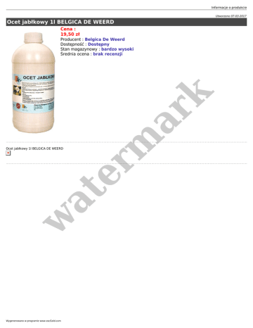 Informacje o produkcie Utworzono 07-03-2017 Ocet jabłkowy 1l BELGICA DE WEERD Cena : 19,50 zł w at Ocet jabłkowy 1l BELGICA DE WEERD er m ar k Producent : Belgica De Weerd Dostępność : Dostępny Stan magazynowy : bardzo wysoki Średnia ocena : brak recenzji Wygenerowano w programie www.oscGold.com