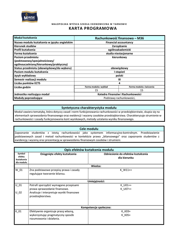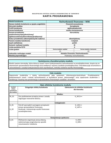 MAŁOP OLSKA WYŻSZ A SZ KOŁA E KONOMICZNA W TARN OW IE KARTA PROGRAMOWA Moduł kształcenia Rachunkowość finansowa – M36 Nazwa modułu kształcenia w języku angielskim Kierunek studiów Profil kształcenia Forma kształcenia Poziom przedmiotu (podstawowy/specjalnościowy/ ogólnouczelniany/kierunkowy/praktyczny) Status przedmiotu (obowiązkowy/do wyboru) Poziom modułu kształcenia Język wykładowy Semestr realizacji modułu Liczba punktów ECTS Liczba godzin Financial accountancy Zarządzanie ogólnoakademicki studia niestacjonarne kierunkowy obowiązkowy I stopień polski III 4 Forma modułu: wykład Forma modułu: ćwiczenia 15 15 Katedra Finansów i Rachunkowości Podstawy rachunkowości, Jednostka realizująca moduł Moduły poprzedzające Syntetyczna charakterystyka modułu Moduł zawiera tematykę, która dotyczy zasad i norm funkcjonowania rachunkowości w przedsiębiorstwie, skupia się na elementach sprawozdania finansowego oraz ewidencji i wyceny zasobów przedsiębiorstwa. Charakteryzuje strumienie w rachunkowości i zasady funkcjonowania kont wynikowych, metody ustalania wyniku finansowego. Cele modułu Zapoznanie studentów z istotą rachunkowości jako systemem informacyjno-kontrolnym. Przedstawienie podstawowych zasad i metod rachunkowości w kontekście prawa „bilansowego” oraz zapoznanie studentów z ewidencją i wyceną oraz prezentacją w sprawozdaniu finansowym zasobów i strumieni. Opis efektów kształcenia modułu Symbol efektu kształcenia dla modułu Osiągnięte efekty kształcenia Odniesienie do efektów kształcenia dla kierunku Wiedza: W_01 Zna podstawowe przepisy prawa i zasady regulujące tworzenie bilansu. U_01 Potrafi sporządzić wymagane przepisami prawa sprawozdanie finansowe. Analizuje i interpretuje wyniki finansowe przedsiębiorstwa. K_W11++ Umiejętności: U_02 K_U01++ K_U07++ Kompetencje społeczne: K_01 Efektywnie organizuje pracę własną, wykorzystując pragmatyczny sposób rozumowania i działania. K_K03+ K_K05+ Treści kształcenia modułu 1. 2. 3. Forma modułu: wykład Podstawowe informacje o systemie rachunkowości 1. 1.1. Istota i przedmiot rachunkowości jako systemu 2. ewidencyjnego 1.2. Nadrzędne zasady rachunkowości 1.3. Możliwe formy prowadzenia ewidencji działalności gospodarczej 1.4. Specyfika rachunkowości banków i ubezpieczalni Sprawozdawczość finansowa 2.1. Bilans 2.2. Rachunek zysków i strat 2.3. Rachunek przepływów pieniężnych 2.4. Zestawienie zmian w kapitale własnym 2.5. Informacje dodatkowe Majątek i kapitał w jednostkach gospodarczych 3. 3.1. Struktura i podstawowe informacje o aktywach jednostki 3.1.1. Koncepcje grupowania aktywów 3.1.2. Aktywa trwałe 3.1.3. Aktywa obrotowe 3.2. Struktura i podstawowe informacje o pasywach jednostki 3.2.1. Koncepcje grupowania pasywów 3.2.2. Kapitały własne 3.2.3. Rezerwy 3.2.4. Zobowiązania krótkoterminowe 3.2.5. Zobowiązania długoterminowe 3.2.6. Rozliczenia międzyokresowe kosztów i przychody przyszłych okresów Literatura podstawowa Literatura uzupełniająca Forma modułu: ćwiczenia Metoda bilansowa oraz sporządzanie bilansów Ewidencja podstawowych zasobów i kapitałów w rachunkowości 2.1. Wprowadzenie do ewidencji podatków pośrednich 2.2. Rzeczowe składniki aktywów trwałych 2.3. Wartości niematerialne i prawne 2.4. Lokaty finansowe 2.5. Zapasy (metody wyceny LiFo, FiFo, średnia cena ważona) 2.6. Kapitały własne 2.7. Zobowiązania z tytułu dostaw i usług 2.8. Zobowiązania publiczno-prawne 2.9. Kredyty bankowe i pożyczki 2.10. Rezerwy na zobowiązania Strumienie w rachunkowości oraz zasady funkcjonowania kont wynikowych 3.1. Istota i rodzaje kont wynikowych 3.2. Ewidencja i rozliczanie kosztów (układ rodzajowy i/lub funkcjonalny) 3.3. Ewidencja przychodów 3.4. Ewidencja wyników nadzwyczajnych 3.5. Sposoby ustalania wyniku finansowego 1. Aleszczyk J., Rachunkowość finansowa od podstaw. Wydawnictwo Zysk i S-ka, Poznań 2011, 2. Cebrowska T., Rachunkowość finansowa i podatkowa. Wydawnictwo Naukowe PWN, Warszawa 2011, 3. Messner Z. (red.), Rachunkowość finansowa z uwzględnieniem MSSF. Warszawa: PWN, Warszawa 2011, 4. Międzynarodowe Standardy Sprawozdawczości Finansowej (MSSF/MSR,). Stowarzyszenie Księgowych w Polsce. Zarząd Główny. Centralny Ośrodek Szkolenia Zawodowego, Warszawa 2009, 5. Gmytrasiewicz M., Rachunkowość finansowa, Difin, Warszawa 2006, 6. Olchowicz I., Rachunkowość finansowa w przykładach: wg ustawy o rachunkowości i MSR. Difin, Warszawa 2005, 1. Walińska E. (red.), Rachunkowość finansowa: ujęcie sprawozdawcze i ewidencyjne. Oficyna a Wolters Kluwer business, Warszawa 2010, 2. Dobija M. (pod red.), Organizacja rachunkowości, Wyd. AE w Krakowie, Kraków 1999 Metody dydaktyczne Prelekcje wspomagane prezentacjami multimedialnymi, prace w grupach, Case Study, dyskusje, wspólne rozwiązywanie przypadków sytuacyjnych.