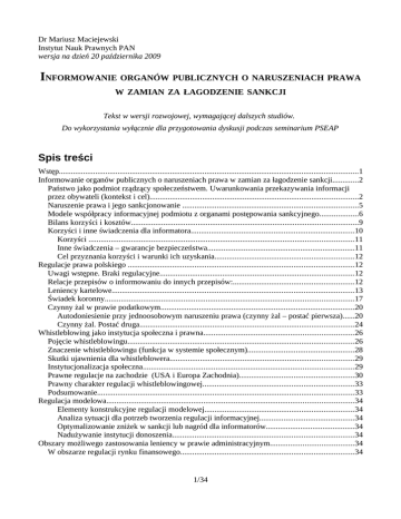 Dr Mariusz Maciejewski Instytut Nauk Prawnych PAN wersja na dzień 20 października 2009 INFORMOWANIE ORGANÓW PUBLICZNYCH O NARUSZENIACH PRAWA W ZAMIAN ZA ŁAGODZENIE SANKCJI Tekst w wersji rozwojowej, wymagającej dalszych studiów. Do wykorzystania wyłącznie dla przygotowania dyskusji podczas seminarium PSEAP Spis treści Wstęp....................................................................................................................................................1 Informowanie organów publicznych o naruszeniach prawa w zamian za łagodzenie sankcji.............2 Państwo jako podmiot rządzący społeczeństwem. Uwarunkowania przekazywania informacji przez obywateli (kontekst i cel).......................................................................................................2 Naruszenie prawa i jego sankcjonowanie .......................................................................................5 Modele współpracy informacyjnej podmiotu z organami postępowania sankcyjnego...................6 Bilans korzyści i kosztów................................................................................................................9 Korzyści i inne świadczenia dla informatora.................................................................................10 Korzyści ...................................................................................................................................11 Inne świadczenia – gwarancje bezpieczeństwa.........................................................................11 Cel przyznania korzyści i warunki ich uzyskania.....................................................................12 Regulacje prawa polskiego ................................................................................................................12 Uwagi wstępne. Braki regulacyjne................................................................................................12 Relacje przepisów o informowaniu do innych przepisów:............................................................12 Leniency kartelowe........................................................................................................................13 Świadek koronny...........................................................................................................................17 Czynny żal w prawie podatkowym................................................................................................20 Autodoniesienie przy jednoosobowym naruszeniu prawa (czynny żal – postać pierwsza)......20 Czynny żal. Postać druga..........................................................................................................24 Whistleblowing jako instytucja społeczna i prawna..........................................................................26 Pojęcie whistleblowingu................................................................................................................26 Znaczenie whistleblowingu (funkcja w systemie społecznym).....................................................28 Skutki ujawnienia dla whistleblowera...........................................................................................29 Instytucjonalizacja społeczna........................................................................................................29 Prawne regulacje na zachodzie (USA i Europa Zachodnia).........................................................30 Prawny charakter regulacji whistleblowingowej...........................................................................33 Podsumowanie...............................................................................................................................33 Regulacja modelowa..........................................................................................................................34 Elementy konstrukcyjne regulacji modelowej..........................................................................34 Analiza sytuacji dla potrzeb tworzenia regulacji informacyjnej...............................................34 Optymalizowanie zniżek w sankcji lub nagród dla informatorów............................................34 Nadużywanie instytucji donoszenia..........................................................................................34 Obszary możliwego zastosowania leniency w prawie administracyjnym.........................................34 W obszarze regulacji rynku finansowego......................................................................................34 1/34 Wstęp Niniejsze tekst stanowi syntetyczne opracowanie zjawiska przekazywania informacji przez obywateli do organów państwa w celu wykorzystania ich w szeroko rozumianym procesie sankcjonowania prawa. Celem tego opracowania jest przegląd znaczenia przekazywania informacji z punktu widzenia systemu społecznego i funkcji realizowanych w ten sposób, następnie przeanalizowanie modeli rozwiązań w polskich instytucjach prawnych regulujących zjawisko donoszenia, a w końcu przedstawienie mapy możliwych rozwiązań funkcjonalnych, a co za tym idzie, także legislacyjnych. Perspektywa przyjęta w niniejszym opracowaniu jest wyłącznie perspektywą efektywności funkcjonowania państwa i efektywności funkcjonowania systemu społecznego według założonych w tym systemie reguł. W minimalnym zakresie odnoszę się do kwestii etycznych. W badaniach wykorzystana została metoda syntezy regulacji prawnych, stąd w tekście mogą pojawiać się niezbyt precyzyjne uogólnienia. Niestety, jest to koszt stosowania tej metody, gdyż z natury rzeczy, uogólnienie będzie mniej precyzyjne niż uogólniane instytucje. Jednakże ze względu na końcowy cel pracy – przedstawienie możliwych rozwiązań modelowych – jest to jedyna możliwa do zastosowania metoda. Omówienia poszczególnych instytucji prawnych mają charakter syntetyczny i są uczynione w celu ustalenia wspó