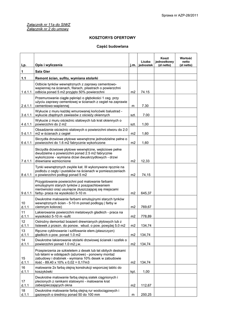 Sprawa nr AZP-28/2011 Załącznik nr 11a do SIWZ Załącznik nr 2 do umowy KOSZTORYS OFERTOWY Część budowlana Koszt Liczba jednostkowy j.m. jednostek (zł netto) Lp. Opis i wyliczenia 1 Sala Gier 1.1 Remont ścian, sufitu, wymiana stolarki 1 d.1.1 Odbicie tynków wewnętrznych z zaprawy cementowowapiennej na ścianach, filarach, pilastrach o powierzchni odbicia ponad 5 m2 przyjęto 50% powierzchni m2 74.15 2 d.1.1 Przemurowanie ciągłe pęknięć o głębokości 1 ceg. przy użyciu zaprawy cementowej w ścianach z cegieł na zaprawie cementowo-wapiennej m 7.30 3 d.1.1 Wykucie z muru każdej wmurowanej końcówki balustrad wykucie zbędnych zawiasów z ościeży okiennych szt. 7.00 4 d.1.1 Wykucie z muru ościeżnic stalowych lub krat okiennych o powierzchni do 2 m2 szt. 1,00 5 d.1.1 Obsadzenie ościeżnic stalowych o powierzchni otworu do 2.0 m2 w ścianach z cegieł m2 1,60 6 d.1.1 Skrzydła drzwiowe płytowe wewnętrzne jednodzielne pełne o powierzchni do 1.6 m2 fabrycznie wykończone m2 1,60 7 d.1.1 Skrzydła drzwiowe płytowe wewnętrzne, wejściowe pełne dwudzielne o powierzchni ponad 2.5 m2 fabrycznie wykończone - wymiana drzwi dwuskrzydłowych - drzwi drewniane wzmocnione m2 12,33 8 d.1.1 Tynki wewnętrznych zwykłe kat. III wykonywane ręcznie na podłożu z cegły i pustaków na ścianach w pomieszczeniach o powierzchni podłogi ponad 5 m2 m2 74,15 9 d.1.1 Przygotowanie powierzchni pod malowanie farbami emulsyjnymi starych tynków z poszpachlowaniem nierówności oraz usunięcie złuszczającej się miejscami farby- praca na wysokości 5-10 m m2 645,37 10 d.1.1 Dwukrotne malowanie farbami emulsyjnymi starych tynków wewnętrznych ścian - 5-10 m ponad podłogą ( farby w ciemnym kolorze) m2 769,67 11 d.1.1 Lakierowanie powierzchni metalowych gładkich - praca na wysokości 5-10 m -sufit m2 778,89 12 d.1.1 Ostrożny demontaż boazerii drewnianych płytowych lub z listewek z przezn. do ponow. wbud. o pow. powyżej 5.0 m2 m2 134,74 13 d.1.1 Ręczne cyklinowanie i szlifowanie elem.(płaszczyzn) gładkich o pow. ponad 1.0 m2 m2 134,74 14 d.1.1 Dwukrotne lakierowanie stolarki drzwiowej ścianek i szafek o powierzchni ponad 1.0 m2 j.w. m2 134,74 15 d.1.1 Przepierzenia ze szkieletem z desek lub łat obitych deskami lub łatami w odstępach (ażurowe) - ponowny montaż zabudowy i drabinek - wymiana 10% desek w zabudowie ilość - 89,40 x 10% x 0,02 = 0,17m3 m2 134,74 16 d.1.1 malowanie 2x farbą olejną konstrukcji wsporczej tablic do koszykówki kpl. 1,00 17 d.1.1 Dwukrotne malowanie farbą olejną siatek ciągnionych i plecionych z ramkami stalowymi - malowanie krat zabezpieczających okna m2 112,67 18 d.1.1 Dwukrotne malowanie farbą olejną rur wodociągowych i gazowych o średnicy ponad 50 do 100 mm m 250,25 Wartość netto (zł netto) Sprawa nr AZP-28/2011 19 d.1.1 20 d.1.1 21 d.1.1 22 d.1.1 montaż uchwytów w ścianie murowanej do wieszania siatek szt. 30,00 montaż obudowy nagłośnienia sali (wg ST poz. 2.3) szt. 1,00 Rusztowania ramowe warszawskie jednokolumnowe wysokości do 8 m kol. 1,00 Czas pracy rusztowań grupy 1 (poz.:1,8,9,11,16,17) Element razem 1.1 1.2 23 d.1.2 Remont posadzek Rozebranie posadzek z klepek parkietowych m2 200,00 Ślepa podłoga z desek o grubości 25 mm na legarach ułożonych krzyżowo- wymiana desek pod parkietem przyjęto 30% powierzchni parkietu przewidzianego do rozbiórki m2 60,00 Uzupełnienie posadzki o powierzchni do 5 m2 w jednym miejscu z deszczułek dębowych lub jesionowych o grubości 22 mm mocowanych na gwoździe m2 200,00 Wymiana pojedynczych deszczułek z drewna liściastego szt. 230,00 27 d.1.2 Mechaniczne szlifowanie starych posadzek z deszczułek o powierzchni ponad 8 m2 z demontażem i ponownym montażem listew przyściennych m2 648,80 28 d.1.2 Dwukrotne malowanie farbą olejną lub ftalową podłóg drewnianych - lakierowanie parkietu 2x -capon m2 648,80 29 d.1.2 Dwukrotne malowanie farbą olejną lub ftalową podłóg drewnianych - lakierowanie parkietu 3x -lakier twardy do sal sportowych m2 648,80 Dwukrotne malowanie farbą olejną lub ftalową drewnianych cokołów o wysokości do 20cm - lakierowanie m 94,00 wymiana tartanu na bieżni m 93,22 malowanie linii boisk kpl 1,0 malowanie logo AWF szt. 1,00 24 d.1.2 25 d.1.2 26 d.1.2 30 d.1.2 31 d.1.2 32 d.1.2 33 d.1.2 Element razem 1.2 Element razem 1 2. Balkon 34 d.2 Rozebranie posadzek wraz z cokolikami m2 54,92 35 d.2 Malowanie pędzlem farbami do gruntowania chlorokauczukowymi konstrukcji szkieletowych m2 10,00 36 d.2 Wymiana listew przyściennych z drewna liściastego wymiana desek czołowych na balkonie szer. 45 cm m 32,62 m2 54,92 38 d.2 Izolacje cieplne i przeciwdźwiękowe z płyt wiórowocementowych poziome na sucho z płyt OSB gr 18mm Obudowa belek i podciągów płytami gipsowo-kartonowymi na rusztach metalowych pojedynczych jednowarstwowo 5001 - zabudowa spodu balkonu - zabudowa bez wełny mineralnej m2 54,95 39 d.2 Dwukrotne malowanie farbami emulsyjnymi powierzchni wewnętrznych - podłoży gipsowych z gruntowaniem m2 54,95 40 d.2 Posadzki z wykładzin z tworzyw sztucznych z warstwą izolacyjną rulonowe - tarket z wywinięciem na ścianę 15cm m2 59,83 41 d.2 polimeryzacja wykładziny tarket m2 59,83 42 d.2 Posadzki z tworzyw sztucznych listwy przyścienne drewniane- od strony balustrady m 32,62 43 d.2 Dwukrotne malowanie farbą olejną krat i balustrad z prętów ozdobnych m2 35,88 37 d.2 Załącznik nr 11a do SIWZ Załącznik nr 2 do umowy 2 Sprawa nr AZP-28/2011 44 d.2 Dwukrotne malowanie farbą olejną uprzednio malowanej stolarki drzwiowej, ścianek i szafek o powierzchni ponad 1.0 m2 - ościeżnice łącznie z ćwierćwałkami m2 1,60 Element razem 2 3. Korytarz 45 d.3 Dwukrotne malowanie farbami emulsyjnymi starych tynków wewnętrznych sufitów m2 39,03 46 d.3 Dwukrotne malowanie farbami emulsyjnymi starych tynków wewnętrznych ścian m2 33,71 47 d.3 Dwukrotne malowanie farbami olejnymi starych tynków wewnętrznych ścian bez szpachlowania m2 10,50 4