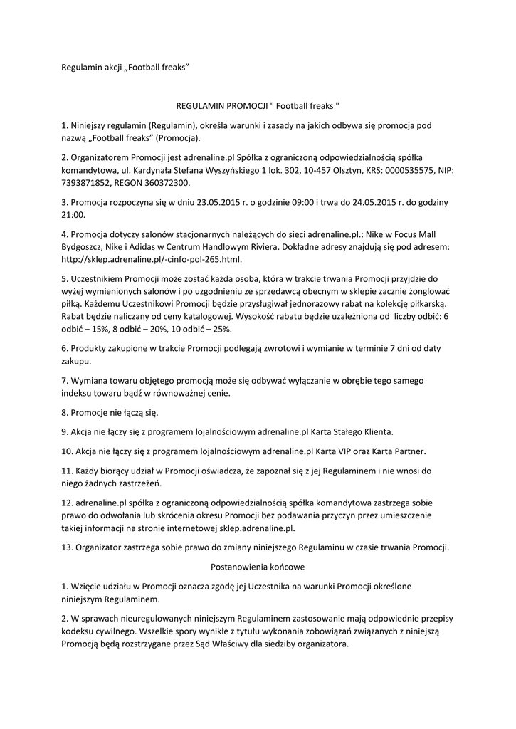 Regulamin akcji „Football freaks” REGULAMIN PROMOCJI " Football freaks " 1. Niniejszy regulamin (Regulamin), określa warunki i zasady na jakich odbywa się promocja pod nazwą „Football freaks” (Promocja). 2. Organizatorem Promocji jest adrenaline.pl Spółka z ograniczoną odpowiedzialnością spółka komandytowa, ul. Kardynała Stefana Wyszyńskiego 1 lok. 302, 10-457 Olsztyn, KRS: 0000535575, NIP: 7393871852, REGON 360372300. 3. Promocja rozpoczyna się w dniu 23.05.2015 r. o godzinie 09:00 i trwa do 24.05.2015 r. do godziny 21:00. 4. Promocja dotyczy salonów stacjonarnych należących do sieci adrenaline.pl.: Nike w Focus Mall Bydgoszcz, Nike i Adidas w Centrum Handlowym Riviera. Dokładne adresy znajdują się pod adresem: http://sklep.adrenaline.pl/-cinfo-pol-265.html. 5. Uczestnikiem Promocji może zostać każda osoba, która w trakcie trwania Promocji przyjdzie do wyżej wymienionych salonów i po uzgodnieniu ze sprzedawcą obecnym w sklepie zacznie żonglować piłką. Każdemu Uczestnikowi Promocji będzie przysługiwał jednorazowy rabat na kolekcję piłkarską. Rabat będzie naliczany od ceny katalogowej. Wysokość rabatu będzie uzależniona od liczby odbić: 6 odbić – 15%, 8 odbić – 20%, 10 odbić – 25%. 6. Produkty zakupione w trakcie Promocji podlegają zwrotowi i wymianie w terminie 7 dni od daty zakupu. 7. Wymiana towaru objętego promocją może się odbywać wyłączanie w obrębie tego samego indeksu towaru bądź w równoważnej cenie. 8. Promocje nie łączą się. 9. Akcja nie łączy się z programem lojalnościowym adrenaline.pl Karta Stałego Klienta. 10. Akcja nie łączy się z programem lojalnościowym adrenaline.pl Karta VIP oraz Karta Partner. 11. Każdy biorący udział w Promocji oświadcza, że zapoznał się z jej Regulaminem i nie wnosi do niego żadnych zastrzeżeń. 12. adrenaline.pl spółka z ograniczoną odpowiedzialnością spółka komandytowa zastrzega sobie prawo do odwołania lub skrócenia okresu Promocji bez podawania przyczyn przez umieszczenie takiej informacji na stronie internetowej sklep.adrenaline.pl. 13. Organizator zastrzega sobie prawo do zmiany niniejszego Regulaminu w czasie trwania Promocji. Postanowienia końcowe 1. Wzięcie udziału w Promocji oznacza zgodę jej Uczestnika na warunki Promocji określone niniejszym Regulaminem. 2. W sprawach nieuregulowanych niniejszym Regulaminem zastosowanie mają odpowiednie przepisy kodeksu cywilnego. Wszelkie spory wynikłe z tytułu wykonania zobowiązań związanych z niniejszą Promocją będą rozstrzygane przez Sąd Właściwy dla siedziby organizatora. 3. Regulamin Promocji, będzie dostępny przez czas trwania Promocji na stronie www.adrenaline.pl , oraz u Organizatora. 4. Promocja, której warunki zostały określone w niniejszym Regulaminie, nie jest grą losową, loterią fantową, zakładem wzajemnym ani loterią promocyjną, których wynik zależy od przypadku w rozumieniu art. 2 ustawy z dnia 29 lipca 1992 o grach losowych i zakładach wzajemnych (Dz. U. z 2004 r., Nr 4, poz. 27, z późniejszymi zmianami). 5. Wiążącą moc prawną mają wyłącznie postanowienia niniejszego Regulaminu. 6. Reklamacje związane z przeprowadzeniem Promocji można przesyłać listownie na adres adrenaline.pl spółka z ograniczoną odpowiedzialnością spółka komandytowa, ul. Kardynała Stefana Wyszyńskiego 1 lok. 302, 10- 457 Olsztyn. Zgłoszenie reklamacji powinno zawierać dokładny opis reklamacji oraz dane Uczestnika niezbędne do udzielenia mu odpowiedzi. 7. Reklamacje będą rozpatrywane przez Organizatora w terminie 14 dni kalendarzowych od daty ich otrzymania. Organizator rozpatrując reklamację stosować będzie postanowienia niniejszego Regulaminu. O decyzji Organizatora Uczestnik zostanie powiadomiony emailem (o ile będzie podany) albo listem zwykłym.
