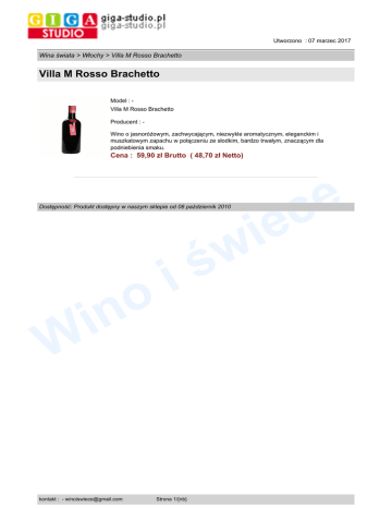 Utworzono : 07 marzec 2017 Wina świata > Włochy > Villa M Rosso Brachetto Villa M Rosso Brachetto Model : Villa M Rosso Brachetto Producent : Wino o jasnoróżowym, zachwycającym, niezwykle aromatycznym, eleganckim i muszkatowym zapachu w połączeniu ze słodkim, bardzo trwałym, znaczącym dla podniebienia smaku. Cena : 59,90 zł Brutto ( 48,70 zł Netto) W i o in kontakt : - [email protected] Strona 1/{nb} e c e i w ś Dostępność: Produkt dostępny w naszym sklepie od 08 październik 2010
