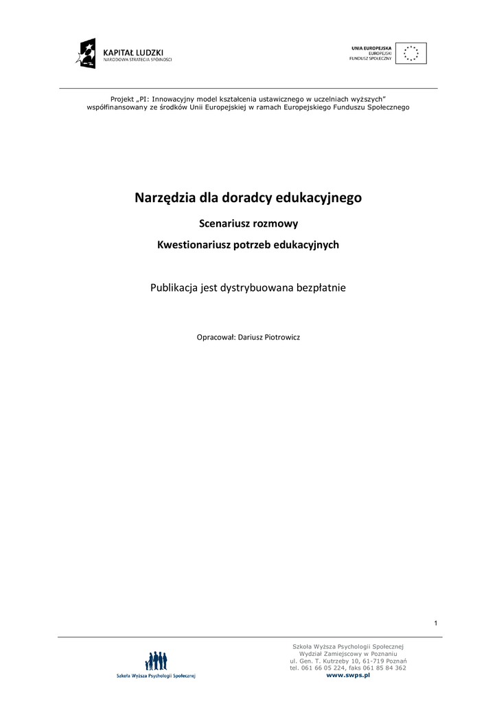 Projekt „PI: Innowacyjny model kształcenia ustawicznego w uczelniach wyższych” współfinansowany ze środków Unii Europejskiej w ramach Europejskiego Funduszu Społecznego Narzędzia dla doradcy edukacyjnego Scenariusz rozmowy Kwestionariusz potrzeb edukacyjnych Publikacja jest dystrybuowana bezpłatnie Opracował: Dariusz Piotrowicz 1 Szkoła Wyższa Psychologii Społecznej Wydział Zamiejscowy w Poznaniu ul. Gen. T. Kutrzeby 10, 61-719 Poznań tel. 061 66 05 224, faks 061 85 84 362 www.swps.pl Projekt „PI: Innowacyjny model kształcenia ustawicznego w uczelniach wyższych” współfinansowany ze środków Unii Europejskiej w ramach Europejskiego Funduszu Społecznego 1. Wstęp, przedstawienie się doradcy edukacyjnego oraz określenie celu rozmowy: Np.„ Dzieo dobry, nazywam się Jan Kowalski i pomogę Panu dobrad zajęcia, które najlepiej spełnią Pana potrzeby” 2. Nawiązanie relacji – zaangażowanie do rozmowy poprzez pytania otwarte: Np. Pierwszy raz jest Pan u nas na uczelni? 3. Poznanie potrzeb– na postawie kwestionariusza i/lub poprzez pytania (stopniowo coraz bardziej ingerujące): Wie Pan już konkretnie jakich zajęd Pan szuka? o Jeśli TAK, doradca prosi o opowiedzenie o swoich planach edukacyjnych i przechodzi do pytania 4 (o ile nie uzyskał już odpowiedzi na pytania z tego obszaru). o Jeśli NIE zadaje pytania: 3.1. Czy chce Pan poszerzyd wiedzę w konkretnym temacie, zawodzie czy zależy Panu na rozwoju osobistym? W jakiej dziedzinie? o Jeśli kandydatowi zależy tylko na rozwoju osobistym lub nie umie określid: 3.1.1 Czy umie Pan określid tematy, które chciałby Pan lepiej poznad? /obszary, w których chciałby Pan się rozwinąd?/zdolności, które chciałby Pan nabyd? o Jeśli kandydat Nie potrafi określid: 3.1.2 Czy może Pan określid cel, w którego realizacji maja pomóc zajęcia tutaj, np. zdobycie lepszej pracy/wybudowanie domu/lepsze samopoczucie itp.? 2 Szkoła Wyższa Psychologii Społecznej Wydział Zamiejscowy w Poznaniu ul. Gen. T. Kutrzeby 10, 61-719 Poznań tel. 061 66 05 224, faks 061 85 84 362 www.swps.pl Projekt „PI: Innowacyjny model kształcenia ustawicznego w uczelniach wyższych” współfinansowany ze środków Unii Europejskiej w ramach Europejskiego Funduszu Społecznego 3.2. Czy są jeszcze jakieś tematy, które wyjątkowo Pana interesują? (Jeśli kandydat nie rozumie intencji pytania należy doprecyzowad: np. Zdarza się nam, że menedżerowie kooczący studia związane z zawodem są często hobbystycznie zainteresowani psychologią kryminalną lub emisją głosu. Czy Pana także interesują jakieś inne tematy, niezwiązane bezpośrednio z dziedziną o której mówiliśmy?) 3.3. Czy zależy Panu na ukooczeniu studiów podyplomowych czy na pojedynczych szkoleniach? o Jeśli kandydatowi zależy na ukooczeniu studiów: 3.3.1. Czy posiada Pan tytuł licencjata, inżyniera lub magistra? Jeśli kandydat NIE posiada tytułu licencjata, inżyniera lub magistra Studia podyplomowe ukooczyd może tylko osoba posiadająca wyżej wymieniony tytuł. Możemy zrealizowad te same zajęcia jako szkolenia – otrzyma Pan wtedy zaświadczenia o ukooczeniu każdego ze szkoleo zamiast świadectwa ukooczenia studiów podyplomowych. 3.3.2. Czy chciałby Pan stworzyd indywidualny tok studiów podyplomowych, czyli wybrad wszystkie zajęcia i obronid pracę dyplomową czy raczej woli Pan realizowad gotowy program i dobrad tylko kilka fakultetów? 3.4. Jakie oczekiwania wiąże Pan z ukooczeniem studiów/szkoleo? 4. Poznanie doświadczeo: 4.1 Czy może Pan krótko opowiedzied jakie ma Pan doświadczenie zawodowe/ w tej dziedzinie? 4.2. Czy ukooczył Pan już studia podyplomowe lub szkolenia w tej dziedzinie? 3 Szkoła Wyższa Psychologii Społecznej Wydział Zamiejscowy w Poznaniu ul. Gen. T. Kutrzeby 10, 61-719 Poznań tel. 061 66 05 224, faks 061 85 84 362 www.swps.pl Projekt „PI: Innowacyjny model kształcenia ustawicznego w uczelniach wyższych” współfinansowany ze środków Unii Europejskiej w ramach Europejskiego Funduszu Społecznego 4.3. Na skali od 1 do 5 jak ocenia Pan swoje umiejętności praktyczne w tej dziedzinie? Jak Pan sądzi, jakie umiejętności powinien Pan jeszcze rozwinąd? 4.4. Czy Pana zdaniem wiedza teoretyczna jest w tej dziedzinie potrzebna? Na skali od 1 do 5 jak ocenia Pan swoją wiedzę teoretyczną w tej dziedzinie? 5. Poznanie możliwości: 5.1. Ile czasu w miesiącu może Pan poświęcid na zajęcia na uczelni? 5.2. Jakie dni w tygodniu najbardziej Panu odpowiadają? 6. Klaryfikacja potrzeb, doświadczeo, możliwości. Czy uważa Pan/i że jest jeszcze coś istotnego, o czym nie mówiliśmy, a co może mied znaczenie przy wyborze zajęd dla Pana/i ? 7. Podsumowanie tej części rozmowy: Jeśli dobrze Pana/ią zrozumiałem potrzebuje Pan/i szkoleo/studiów z dziedziny……., raczej teoretycznych/praktycznych, o podstawowym/średnim/wysokim poziomie zaawansowania. Może Pan poświęcid na naukę… ……….czasu. 8. Dobór kursów: Przejdźmy teraz do platformy, która pokaże nam wszystkie możliwe kursy, spełniające Pana potrzeby. 4 Szkoła Wyższa Psychologii Społecznej Wydział Zamiejscowy w Poznaniu ul. Gen. T. Kutrzeby 10, 61-719 Poznań tel. 061 66 05 224, faks 061 85 84 362 www.swps.pl Projekt „PI: Innowacyjny model kształcenia ustawicznego w uczelniach wyższych” współfinansowany ze środków Unii Europejskiej w ramach Europejskiego Funduszu Społecznego Data ………………………… Miejscowośd ……………………………………. KWESTIONARIUSZ POTRZEB EDUKACYJNYCH Imię i nazwisko: …………………………………………………………………………………………………………………….. Data urodzenia: …………………………………………Dane kontaktowe (adres, telefon, adres e-mail): ……………………………………………………………………………………………………………………………