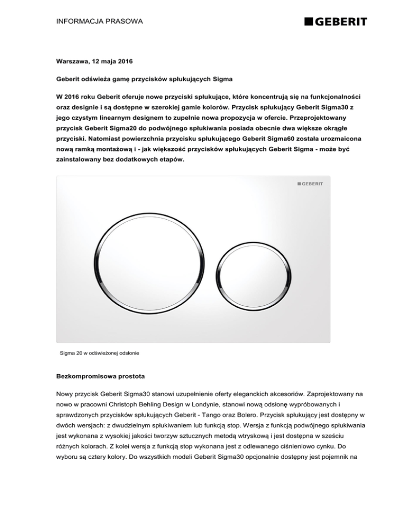 INFORMACJA PRASOWA Warszawa, 12 maja 2016 Geberit odświeża gamę przycisków spłukujących Sigma W 2016 roku Geberit oferuje nowe przyciski spłukujące, które koncentrują się na funkcjonalności oraz designie i są dostępne w szerokiej gamie kolorów. Przycisk spłukujący Geberit Sigma30 z jego czystym linearnym designem to zupełnie nowa propozycja w ofercie. Przeprojektowany przycisk Geberit Sigma20 do podwójnego spłukiwania posiada obecnie dwa większe okrągłe przyciski. Natomiast powierzchnia przycisku spłukującego Geberit Sigma60 została urozmaicona nową ramką montażową i - jak większość przycisków spłukujących Geberit Sigma - może być zainstalowany bez dodatkowych etapów. Sigma 20 w odświeżonej odsłonie Bezkompromisowa prostota Nowy przycisk Geberit Sigma30 stanowi uzupełnienie oferty eleganckich akcesoriów. Zaprojektowany na nowo w pracowni Christoph Behling Design w Londynie, stanowi nową odsłonę wypróbowanych i sprawdzonych przycisków spłukujących Geberit - Tango oraz Bolero. Przycisk spłukujący jest dostępny w dwóch wersjach: z dwudzielnym spłukiwaniem lub funkcją stop. Wersja z funkcją podwójnego spłukiwania jest wykonana z wysokiej jakości tworzyw sztucznych metodą wtryskową i jest dostępna w sześciu różnych kolorach. Z kolei wersja z funkcją stop wykonana jest z odlewanego ciśnieniowo cynku. Do wyboru są cztery kolory. Do wszystkich modeli Geberit Sigma30 opcjonalnie dostępny jest pojemnik na INFORMACJA PRASOWA kostki do spłuczki. Transportuje on kostki do stałej pozycji poniżej powierzchni wody w zbiorniku. Geberit Sigma30 zastępuje dwa przyciski spłukujące Tango oraz Bolero, których produkcja zostanie zakończona wiosną 2016 roku. Dobrze wyważone Przycisk spłukujący Geberit Sigma20 jest wyposażony w dwa okrągłe przyciski o różnych rozmiarach do podwójnego spłukiwania. Aby ułatwić użytkowanie projektanci stworzyli dwa okrągłe, lekko wypukłe przyciski, które są znacznie większe niż w poprzedniej wersji. Przycisk spłukujący Geberit Sigma20 wykonany jest z wysokiej jakości tworzyw sztucznych metodą wtryskową i jest dostępny w sześciu różnych kolorach - od białego złota do matowo-chromowych przycisków. Ponadto Geberit oferuje również wersję wykonaną ze szczotkowanej stali nierdzewnej. Opcjonalnie przycisk spłukujący może być także wyposażony w pojemnik na kostki do spłuczki. Równa powierzchnia i perfekcyjnie zmodernizowane rozwiązanie Przycisk spłukujący Geberit Sigma60 jest zlicowany z powierzchnią ściany. Aby jeszcze bardziej ułatwić jego instalację, Geberit całkowicie zmienił ramkę montażową. Teraz przycisk może być zainstalowany w taki sam sposób, jak pozostałe produkty z serii Sigma. Przycisk spłukujący jest dostępny w różnych wersjach: powierzchnia przycisku może być wykonana ze szkła lub metalu. Oferta obejmuje cztery kolory (czarny, biały, umbra, szczotkowana stal nierdzewna). Opis zdjęcia Geberit Sigma30 Zaprojektowany przez Christoph Behling Design, przycisk spłukujący Geberit Sigma30 jest nowym produktem w rodzinie Sigma. Przycisk jest dostępny w dwóch wersjach: z dwudzielnym spłukiwaniem lub z funkcją stop. Wersja podwójnego spłukiwania jest wykonana z wysokiej jakości tworzyw sztucznych metodą wtryskową (dostępna w sześciu różnych kolorach). Wersja z funkcją stop wykonana jest z odlewanego ciśnieniowo cynku. 2 INFORMACJA PRASOWA Geberit Sigma20 Przycisk spłukujący Geberit Sigma20 został przeprojektowany i wyposażony w dwa okrągłe, lekko wypukłe przyciski znacznie większe niż wcześniej, dzięki czemu jeszcze łatwiej obsługują dwudzielne spłukiwanie. Geberit Sigma60 Od 2016 roku, powierzchnia przycisku spłukującego Geberit Sigma60 będzie mieć nową ramę montażową, która sprawia, że produkt instalowany jest w sposób analogiczny do innych przycisków z serii Sigma Informacje o Grupie Geberit Grupa Geberit to europejski lider w produkcji zaawansowanej technologii sanitarnej. Od momentu jej powstania w roku 1874 jest pionierem w tym sektorze, nieprzerwanie ustanawiając nowe trendy swoimi wszechstronnymi rozwiązaniami. Geberit posiada swoje przedstawicielstwa w ponad 40 krajach w Europie i na świecie, skupia w swoich zasobach 35 zakładów produkcyjnych. Największe zakłady znajdują się w Szwajcarii, Niemczech i Austrii. Siedziba główna znajduje się w Rapperswil-Jona w Szwajcarii, a sama firma jest notowana na Szwajcarskiej Giełdzie Papierów Wartościowych w Zurychu od 1999 r. Grupa Geberit wygenerowała sprzedaż w wysokości 2,6 mld franków szwajcarskich zatrudniając ponad 12.000 pracowników. Zakres produktów obejmuje linię systemów sanitarnych (systemy instalacyjne, spłuczki, baterie umywalkowe, systemy spłukiwania, syfony, toalety myjące), wyposażenie łazienek (ceramikę sanitarną, meble łazienkowe, kabiny i wanny) oraz systemy rurowe (systemy wodociągowe i systemy kanalizacyjne). Kontakt dla mediów 38PR & Content Communication Martyna Solińska, Tel. 502 690 101, [email protected] Agnieszka Cieślarek, Tel. 511 666 088, [email protected] 3