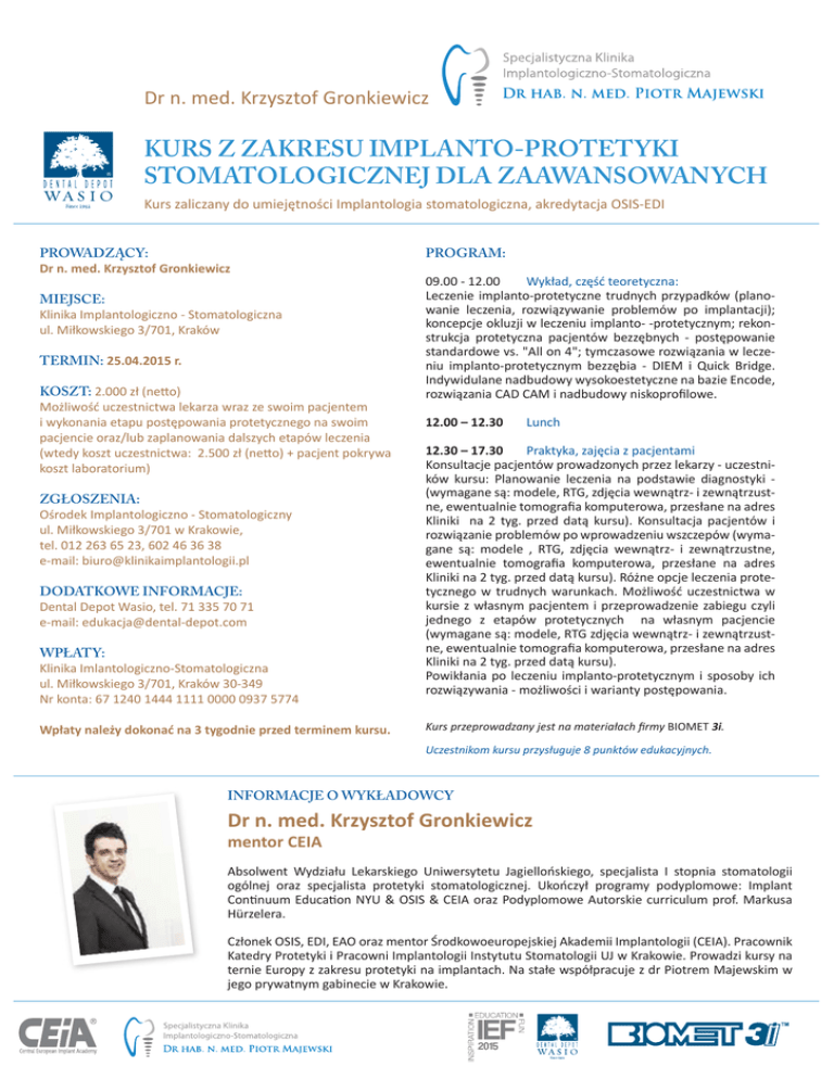 Dr n. med. Krzysztof Gronkiewicz KURS Z ZAKRESU IMPLANTO-PROTETYKI STOMATOLOGICZNEJ DLA ZAAWANSOWANYCH PROWADZĄCY: Dr n. med. Krzysztof Gronkiewicz PROGRAM: MIEJSCE: Klinika Implantologiczno - Stomatologiczna - TERMIN: 25.04.2015 r. - KOSZT: - i na iw - ZGŁOSZENIA: - DODATKOWE INFORMACJE: WPŁATY: Klinika Imlantologiczno-Stomatologiczna 3i. INFORMACJE O WYKŁADOWCY Dr n. med. Krzysztof Gronkiewicz mentor CEIA I stopnia stomatologii Hürzelera.