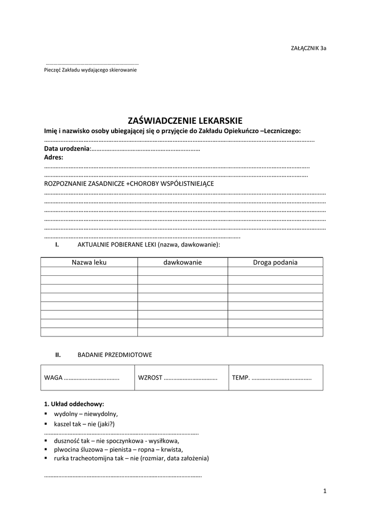 ZAŁĄCZNIK 3a ……………………………………………………………… Pieczęć Zakładu wydającego skierowanie ZAŚWIADCZENIE LEKARSKIE Imię i nazwisko osoby ubiegającej się o przyjęcie do Zakładu Opiekuńczo –Leczniczego: ……………………………………………………………………………………………………………………………………………….. Data urodzenia:………………………………………………………… Adres: …………………………………………………………………………………………………………………………………………….. ……………………………………………………………………………………………………………………………………………. ROZPOZNANIE ZASADNICZE +CHOROBY WSPÓŁISTNIEJĄCE ……………………………………………………………………………………………………………………………………………………… ……………………………………………………………………………………………………………………………………………………… ……………………………………………………………………………………………………………………………………………………… ……………………………………………………………………………………………………………………………………………………… ……………………………………………………………………………………………………………………………………………………… ……………………………………………………………………………………………………….. I. AKTUALNIE POBIERANE LEKI (nazwa, dawkowanie): Nazwa leku II. dawkowanie Droga podania BADANIE PRZEDMIOTOWE WAGA …………………………….. WZROST ……………………………. TEMP. ……………………………….. 1. Układ oddechowy: wydolny – niewydolny, kaszel tak – nie (jaki?) …………………………………………………………………………………….. duszność tak – nie spoczynkowa - wysiłkowa, plwocina śluzowa – pienista – ropna – krwista, rurka tracheotomijna tak – nie (rozmiar, data założenia) ………………………………………………………………………………………. 1 2. Układ krążenia: wydolny –niewydolny (stopień wg NYHA) ………………………………………………………….., TĘTNO/MIN. ……………………………….. RR ………………………………….. SINICA tak / nie obwodowa/ centralna obrzęki (umiejscowienie)……………………………………………………………………………………………………………………… zaburzenia rytmu serca tak -nie (jeśli tak, to jakie?)……………………………………………………………………………………………………………………………………. stymulator serca tak – nie (typ, rok założenia, przyczyna)…………………………………………………………………………………………………………………………….. omdlenia tak – nie (jeśli tak, podać przyczynę)……………………………………………………………………………………………………………………………... 3. Układ pokarmowy: ewentualne schorzenia ……………………………………………………………………………………………………………………………………… stomie ............................................................................................................................................ nietolerancje pokarmowe ………………………………………………………………………………………………………………………………………. biegunki, zaparcia tak – nie, rodzaj diety ………………………………………………………………………………………………………………………………………. 4. Układ moczowo – płciowy wielomocz/skąpomocz/bezmocz/norma, przerost gruczołu krokowego tak – nie, nietrzymanie moczu tak –nie, zakażenie dróg moczowych tak – nie, upławy tak –nie (jeśli tak – podać przyczynę i rodzaj wydzieliny)………………………………………………………………………………………………………………………………. 5. Układ ruchu: ruchomość w stawach pełna – ograniczona, osteoporoza tak –nie, złamania kości tak –nie: 2 podać umiejscowienie i datę urazu …………………………………………………………………………………………………………………………………….. dotychczasowe postępowanie ……………………………………………………………………………………………………………………………………………… sposób dalszego postępowania ……………………………………………………………………………………………………………………………………………… uruchomienie gipsem tak – nie, jeśli tak – podać zakres ……………………………………………………………………………………………………………………………………… 6. Układ nerwowy i narządy zmysłów: świadomość pełna/ ograniczona/ chory nieprzytomny, kontakt słowny pełny/ afazja, kontakt logiczny pełny/ brak kontaktu logicznego sen – prawidłowy/ odwrócenie pór doby wzrok- prawidłowy/ niedowidzenie/ ślepota/ jaskra słuch-prawidłowy/niedosłyszenie/ głuchota/ aparat słuchowy niedowłady/ porażenia(umiejscowienie)…………………