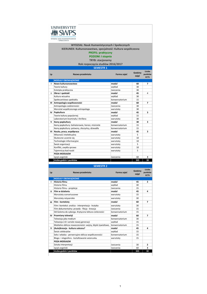 WYDZIAŁ: Nauk Humanistycznych i Społecznych KIERUNEK: Kulturoznawstwo, specjalność: Kultura współczesna PROFIL: praktyczny POZIOM: I stopnia TRYB: stacjonarny Rok rozpoczęcia studiów 2016/2017 SEMESTR 1 Liczba Lp Nazwa przedmiotu Forma zajeć Godziny punktów zajęć ECTS I II III IV V VI MODUŁY OBOWIĄZKOWE Nowe kulturoznawstwo Teorie kultury Estetyka praktyczna Obraz i spektakl Kultura wizualna Społeczeństwo spektaklu Antropologia współczesności Antropologia codzienności Warsztat współczesnego antropologa Popkultura Teorie kultury popularnej Laboratorium kryminału i thrillera Ikony popkultury Ikony popkultury: bohaterowie, herosi, mściciele Ikony popkultury: potwory, złoczyńcy, dziwadła Nauka, praca, współpraca Własność intelektualna Skuteczne uczenie się Technologie informacyjne Świat organizacji Konflikt, zwykła sprawa Tajemniczy kod nauki POZA MODUŁEM Język angielski Liczba godzin i punktów moduł wykład ćwiczenia moduł wykład konwersatorium moduł ćwiczenia warsztaty moduł wykład warsztaty moduł konwersatorium konwersatorium moduł warsztaty warsztaty warsztaty warsztaty warsztaty warsztaty 60 30 30 45 30 15 60 30 30 45 15 30 30 15 15 45 5 10 10 5 10 5 7 ćwiczenia 60 345 3 30 4 7 3 3 3 SEMESTR 2 Liczba Lp Nazwa przedmiotu Forma zajeć Godziny punktów zajęć ECTS MODUŁY OBOWIĄZKOWE I Historia filmu Historia filmu Historia filmu - projekcje II Film w działaniu Warsztaty scenariuszowe moduł wykład ćwiczenia moduł warsztaty 45 30 15 45 15 Warsztaty reżyserskie warsztaty 30 III Film - konteksty Film i kontekst: analiza - interpretacja - krytyka Film dokumentalny: prawda - fikcja - kreacja Od Golema do cyborga. Krytyczna lektura cielesności moduł 60 warsztaty ćwiczenia konwersatorium 30 15 15 IV Przemiany telewizji Telewizja jako medium Telewizja 2.0 i seriale nowej generacji Medialne oblicza nowoczesności: wojny, klęski żywiołowe, katastrofy naturalne - kultura sukcesu? V (Auto)kreacja Świat celebrytów Seks i władza - perwersyjne oblicza współczesności Blogo- i vlogosfera - kształtowanie wizerunku POZA MODUŁEM Sztuka interpretacji Język angielski Liczba godzin i punktów moduł konwersatorium wykład konwersatorium moduł wykład konwersatorium warsztaty 60 30 15 15 45 15 15 15 7 ćwiczenia ćwiczenia 30 60 345 2 3 30 1 3 4 7 4 SEMESTR 3 Liczba Lp Nazwa przedmiotu Forma zajeć Godziny punktów zajęć ECTS MODUŁY OBOWIĄZKOWE I Antropologia i archeologia mediów Antropologia mediów Archeologia mediów II Media 2.0 Nowe media Transmedia Badanie mediów III Kultura 2.0 Zarządzanie wiedzą Prawo autorskie Wolna kultura/Kultura nadzoru Nowe instytucje kultury IV Warsztat badawczy Analiza i weryfikacja źródeł do badań kultury Metody i strategie prowadzenia badań Opracowywanie i prezentacja wyników badań Badania marketingowe i społeczne POZA MODUŁEM Język angielski Wychowanie fizyczne Liczba godzin i punktów moduł warsztaty wykład moduł ćwiczenia warsztaty warsztaty moduł warsztaty ćwiczenia ćwiczenia warsztaty moduł ćwiczenia ćwiczenia warsztaty ćwiczenia 30 15 15 45 15 15 15 60 15 15 15 15 60 15 15 15 15 3 ćwiczenia ćwiczenia 60 30 285 3 1 29 6 8 8 SEMESTR 4 Liczba Lp Nazwa przedmiotu Forma zajeć Godziny punktów zajęć ECTS MODUŁY OBOWIĄZKOWE I Ekonomika kultury Ekonomika kultury Zarządzanie i marketing w instytucjach kultury II Animacja kultury Budowanie zespołu i metody pracy projektowej Organizacja wydarzeń kulturalnych Pozyskiwanie grantów III Gry komputerowe Teoria i historia gier komputerowych Projektowanie doświadczenia uzytkownika w grach Gry społecznościowe i analiza growa POZA MODUŁEM Pisanie tekstów naukowych i popularnonaukowych Coaching Teorie i zwroty w XX-wiecznej humanistyce Język angielski Liczba godzin i punktów moduł wykład ćwiczenia moduł warsztaty warsztaty wykład moduł wykład warsztaty 60 45 15 60 15 30 15 45 15 15 konwersatorium 15 warsztaty ćwiczenia konwersatorium ćwiczenia 30 30 30 60 315 2 7 7 5 3 3 3 3 31 SEMESTR 5 Liczba Lp Nazwa przedmiotu Forma zajeć Godziny punktów zajęć ECTS I MODUŁY OBOWIĄZKOWE Sztuka współczesna Sztuki wizualne na przełomie XX i XXI wieku Nowoczesna architektura II Sztuka współczesna II Literatura piękna XX i XXI wieku Teatr współczesny Muzyka współczesna III Świat sztuki Krytyka artystyczna Warsztaty kuratorskie Rynek sztuki IV Marketing Copywriting Kreowanie marek kulturowych Projektowanie i identyfikacja wizualna Media i marketing POZA MODUŁEM Wyzwania humanistyki XXI wieku Seminarium licencjackie I moduł ćwiczenia ćwiczenia moduł konwersatorium konwersatorium konwersatorium moduł warsztaty warsztaty konwersatorium moduł warsztaty ćwiczenia ćwiczenia ćwiczenia 45 30 15 90 30 30 30 60 30 15 15 75 15 15 15 30 4 konwersatorium 30 3 seminarium licencjackie 30 6 330 32 Liczba godzin i punktów 7 6 6 SEMESTR 6 Liczba Lp Nazwa przedmiotu Forma zajeć Godziny punktów zajęć ECTS MODUŁY OBOWIĄZKOWE Wielokulturowość Transkulturowy wymiar współczesnego świata Reporter w ponowoczesnym świecie II Komunikacja międzykulturowa Komunikacja międzykulturowa Tożsamość kulturowa III Kultura polityki Dyskursy polityczne Polityka kulturalna POZA MODUŁEM Fakultet I Seminarium licencjackie II moduł wykład warsztaty moduł konwersatorium konwersatorium moduł ćwiczenia ćwiczenia 60 30 30 60 30 30 60 30 30 7 fakultet seminarium licencjackie 30 3 30 6 240 28 Liczba godzin i punktów 7 5 Godziny Liczba punktów zajęć ECTS Liczba godzin i punktów na wszystkich latach 1860 3 180