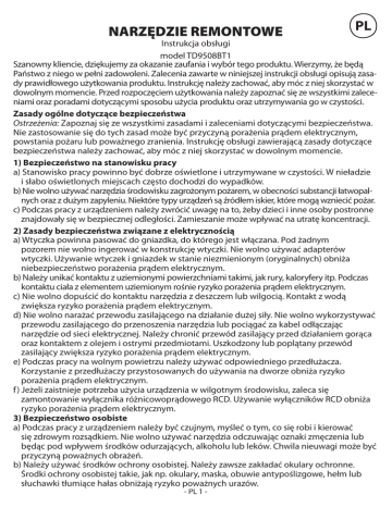 NARZĘDZIE REMONTOWE PL Instrukcja obsługi model TD9508BT1 Szanowny kliencie, dziękujemy za okazanie zaufania i wybór tego produktu. Wierzymy, że będą Państwo z niego w pełni zadowoleni. Zalecenia zawarte w niniejszej instrukcji obsługi opisują zasady prawidłowego użytkowania produktu. Instrukcję należy zachować, aby móc z niej skorzystać w dowolnym momencie. Przed rozpoczęciem użytkowania należy zapoznać się ze wszystkimi zaleceniami oraz poradami dotyczącymi sposobu użycia produktu oraz utrzymywania go w czystości. Zasady ogólne dotyczące bezpieczeństwa Ostrzeżenia: Zapoznaj się ze wszystkimi zasadami i zaleceniami dotyczącymi bezpieczeństwa. Nie zastosowanie się do tych zasad może być przyczyną porażenia prądem elektrycznym, powstania pożaru lub poważnego zranienia. Instrukcję obsługi zawierającą zasady dotyczące bezpieczeństwa należy zachować, aby móc z niej skorzystać w dowolnym momencie. 1) Bezpieczeństwo na stanowisku pracy a) Stanowisko pracy powinno być dobrze oświetlone i utrzymywane w czystości. W nieładzie i słabo oświetlonych miejscach często dochodzi do wypadków. b) Nie wolno używać narzędzia środowisku zagrożonym pożarem, w obecności substancji łatwopalnych oraz z dużym zapyleniu. Niektóre typy urządzeń są źródłem iskier, które mogą wzniecić pożar. c) Podczas pracy z urządzeniem należy zwrócić uwagę na to, żeby dzieci i inne osoby postronne znajdowały się w bezpiecznej odległości. Zamieszanie może wpływać na utratę koncentracji. 2) Zasady bezpieczeństwa związane z elektrycznością a) Wtyczka powinna pasować do gniazdka, do którego jest włączana. Pod żadnym pozorem nie wolno ingerować w konstrukcję wtyczki. Nie wolno używać adapterów wtyczki. Używanie wtyczek i gniazdek w stanie niezmienionym (oryginalnych) obniża niebezpieczeństwo porażenia prądem elektrycznym. b) Należy unikać kontaktu z uziemionymi powierzchniami takimi, jak rury, kaloryfery itp. Podczas kontaktu ciała z elementem uziemionym rośnie ryzyko porażenia prądem elektrycznym. c) Nie wolno dopuścić do kontaktu narzędzia z deszczem lub wilgocią. Kontakt z wodą zwiększa ryzyko porażenia prądem elektrycznym. d) Nie wolno narażać przewodu zasilającego na działanie dużej siły. Nie wolno wykorzystywać przewodu zasilającego do przenoszenia narzędzia lub pociągać za kabel odłączając narzędzie od sieci elektrycznej. Należy chronić przewód zasilający przed działaniem gorąca oraz kontaktem z olejem i ostrymi przedmiotami. Uszkodzony lub poplątany przewód zasilający zwiększa ryzyko porażenia prądem elektrycznym. e) Podczas pracy na wolnym powietrzu należy używać odpowiedniego przedłużacza. Korzystanie z przedłużaczy przystosowanych do używania na dworze obniża ryzyko porażenia prądem elektrycznym. f ) Jeżeli zaistnieje potrzeba użycia urządzenia w wilgotnym środowisku, zaleca się zamontowanie wyłącznika różnicowoprądowego RCD. Używanie wyłączników RCD obniża ryzyko porażenia prądem elektrycznym. 3) Bezpieczeństwo osobiste a) Podczas pracy z urządzeniem należy być czujnym, myśleć o tym, co się robi i kierować się zdrowym rozsądkiem. Nie wolno używać narzędzia odczuwając oznaki zmęczenia lub będąc pod wpływem środków odurzających, alkoholu lub leków. Chwila nieuwagi może być przyczyną poważnych obrażeń. b) Należy używać środków ochrony osobistej. Należy zawsze zakładać okulary ochronne. Środki ochrony osobistej takie, jak np. okulary, maska, obuwie antypoślizgowe, hełm lub słuchawki tłumiące hałas obniżają ryzyko poważnych urazów. - PL 1 - c) Zapobieganie przypadkowemu uruchomieniu. Przed podłączeniem narzędzia do sieci elektrycznej należy upewnić się, że wyłącznik znajduje się pozycji OFF. d) Nie należy przeceniać swoich sił. Należy zawsze przyjąć stabilną pozycję oraz utrzymywać równowagę. Zapewnia to lepszą kontrolę nad urządzeniem w nieoczekiwanych sytuacjach. e) Należy prawidłowo się ubrać. Podczas pracy z narzędziem nie wolno mieć na sobie luźnego ubrania oraz biżuterii. Włosy, ubranie i rękawice należy trzymać w bezpiecznej odległości od poruszających się elementów urządzenia. Luźne ubranie, biżuteria lub długie włosy mogą być wciągnięte przez poruszające się elementy. f ) Jeżeli narzędzie posiada dodatkowy sprzęt do odsysania kurzu, należy się upewnić, że jest on prawidłowo zamontowany i podłączony. Używanie tego typu sprzętu minimalizuje niedogodności związane z zapyleniem otoczenia. 4) Zasada działania i czyszczenie a) Działanie urządzenia opiera się na zasadzie bardzo szybkich, krótkich drgań. W związku z tym ważnym jest, żeby obrabiany materiał dobrze zamocowany. a) Nie wolno zbyt mocno dociskać narzędzia. Należy używać odpowiedniej siły. Urządzenie będzie wykonywać swoją pracę lepiej, gdy operator będzie oddziaływał na nie z odpowiednią siła. Podczas pracy należy urządzenie trzymać tak, żeby nie zakrywać otworów wentylacyjnych. c) Nie wolno używać urządzenia z uszkodzonym wyłącznikiem. Urządzenie, którego nie można zatrzymać przy pomocy wyłącznika może być niebezpiecznym i powinno być naprawione. d) Przed rozpoczęciem wymiany nakładek, czyszczenia, wykonywania czynności konserwacyjnych oraz przed odłożeniem na miejsce przechowywania należy odłączyć narzędzie od sieci elektrycznej. Ten krok zapobiegawczy obniża ryzyko nagłego załączenia się urządzenia. e) Urządzenie należy przechowywać w miejscu niedostępnym dla dzieci. Nie wolno pozwolić posługiwać się narzędziem osobom, które nie zaznajomiły się z zasadami jego eksploatacji. Urządzenie będąc w rękach osoby nie posiadającej doświadczenia w jego eksploatacji może stanowić niebezpieczeństwo. f) Czynności przed rozpoczęciem pracy. Każdorazowo przed użyciem należy sprawdzić, czy nie poluzowa