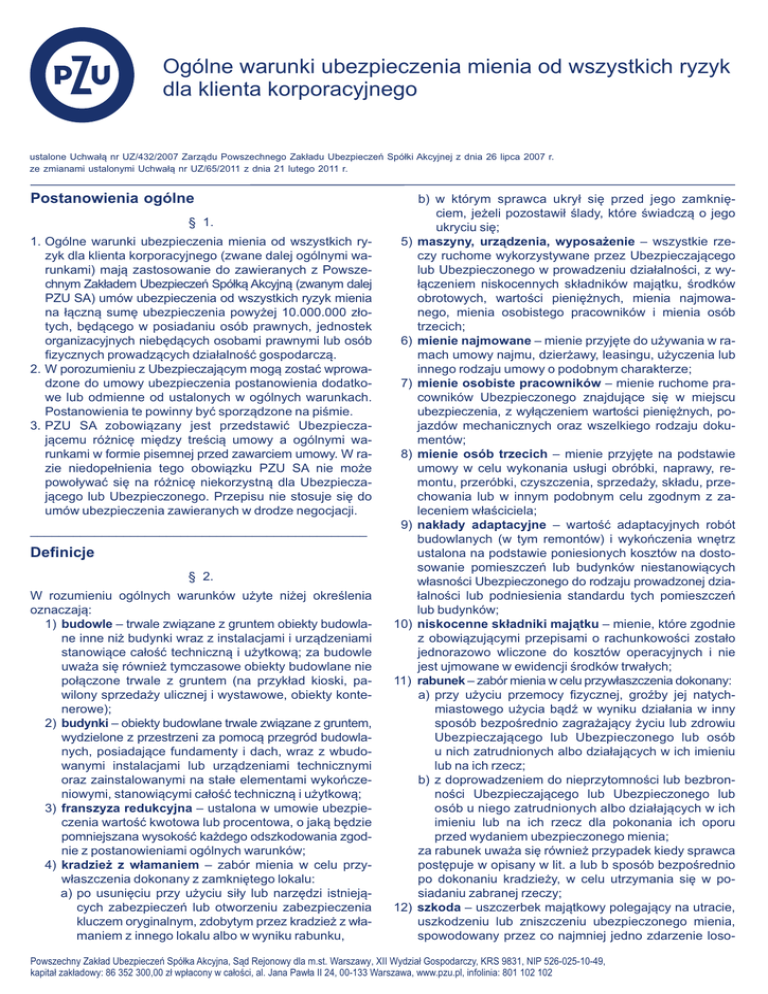 Ogólne warunki ubezpieczenia mienia od wszystkich ryzyk dla klienta korporacyjnego ustalone Uchwałą nr UZ/432/2007 Zarządu Powszechnego Zakładu Ubezpieczeń Spółki Akcyjnej z dnia 26 lipca 2007 r. ze zmianami ustalonymi Uchwałą nr UZ/65/2011 z dnia 21 lutego 2011 r. Postanowienia ogólne § 1. 1. Ogólne warunki ubezpieczenia mienia od wszystkich ryzyk dla klienta korporacyjnego (zwane dalej ogólnymi warunkami) mają zastosowanie do zawieranych z Powszechnym Zakładem Ubezpieczeń Spółką Akcyjną (zwanym dalej PZU SA) umów ubezpieczenia od wszystkich ryzyk mienia na łączną sumę ubezpieczenia powyżej 10.000.000 złotych, będącego w posiadaniu osób prawnych, jednostek organizacyjnych niebędących osobami prawnymi lub osób fizycznych prowadzących działalność gospodarczą. 2. W porozumieniu z Ubezpieczającym mogą zostać wprowadzone do umowy ubezpieczenia postanowienia dodatkowe lub odmienne od ustalonych w ogólnych warunkach. Postanowienia te powinny być sporządzone na piśmie. 3. PZU SA zobowiązany jest przedstawić Ubezpieczającemu różnicę między treścią umowy a ogólnymi warunkami w formie pisemnej przed zawarciem umowy. W razie niedopełnienia tego obowiązku PZU SA nie może powoływać się na różnicę niekorzystną dla Ubezpieczającego lub Ubezpieczonego. Przepisu nie stosuje się do umów ubezpieczenia zawieranych w drodze negocjacji. _______________________________________________ 5) 6) 7) 8) 9) Definicje § 2. W rozumieniu ogólnych warunków użyte niżej określenia oznaczają: 1) budowle – trwale związane z gruntem obiekty budowlane inne niż budynki wraz z instalacjami i urządzeniami stanowiące całość techniczną i użytkową; za budowle uważa się również tymczasowe obiekty budowlane nie połączone trwale z gruntem (na przykład kioski, pawilony sprzedaży ulicznej i wystawowe, obiekty kontenerowe); 2) budynki – obiekty budowlane trwale związane z gruntem, wydzielone z przestrzeni za pomocą przegród budowlanych, posiadające fundamenty i dach, wraz z wbudowanymi instalacjami lub urządzeniami technicznymi oraz zainstalowanymi na stałe elementami wykończeniowymi, stanowiącymi całość techniczną i użytkową; 3) franszyza redukcyjna – ustalona w umowie ubezpieczenia wartość kwotowa lub procentowa, o jaką będzie pomniejszana wysokość każdego odszkodowania zgodnie z postanowieniami ogólnych warunków; 4) kradzież z włamaniem – zabór mienia w celu przywłaszczenia dokonany z zamkniętego lokalu: a) po usunięciu przy użyciu siły lub narzędzi istniejących zabezpieczeń lub otworzeniu zabezpieczenia kluczem oryginalnym, zdobytym przez kradzież z włamaniem z innego lokalu albo w wyniku rabunku, 10) 11) 12) b) w którym sprawca ukrył się przed jego zamknięciem, jeżeli pozostawił ślady, które świadczą o jego ukryciu się; maszyny, urządzenia, wyposażenie – wszystkie rzeczy ruchome wykorzystywane przez Ubezpieczającego lub Ubezpieczonego w prowadzeniu działalności, z wyłączeniem niskocennych składników majątku, środków obrotowych, wartości pieniężnych, mienia najmowanego, mienia osobistego pracowników i mienia osób trzecich; mienie najmowane – mienie przyjęte do używania w ramach umowy najmu, dzierżawy, leasingu, użyczenia lub innego rodzaju umowy o podobnym charakterze; mienie osobiste pracowników – mienie ruchome pracowników Ubezpieczonego znajdujące się w miejscu ubezpieczenia, z wyłączeniem wartości pieniężnych, pojazdów mechanicznych oraz wszelkiego rodzaju dokumentów; mienie osób trzecich – mienie przyjęte na podstawie umowy w celu wykonania usługi obróbki, naprawy, remontu, przeróbki, czyszczenia, sprzedaży, składu, przechowania lub w innym podobnym celu zgodnym z zaleceniem właściciela; nakłady adaptacyjne – wartość adaptacyjnych robót budowlanych (w tym remontów) i wykończenia wnętrz ustalona na podstawie poniesionych kosztów na dostosowanie pomieszczeń lub budynków niestanowiących własności Ubezpieczonego do rodzaju prowadzonej działalności lub podniesienia standardu tych pomieszczeń lub budynków; niskocenne składniki majątku – mienie, które zgodnie z obowiązującymi przepisami o rachunkowości zostało jednorazowo wliczone do kosztów operacyjnych i nie jest ujmowane w ewidencji środków trwałych; rabunek – zabór mienia w celu przywłaszczenia dokonany: a) przy użyciu przemocy fizycznej, groźby jej natychmiastowego użycia bądź w wyniku działania w inny sposób bezpośrednio zagrażający życiu lub zdrowiu Ubezpieczającego lub Ubezpieczonego lub osób u nich zatrudnionych albo działających w ich imieniu lub na ich rzecz; b) z doprowadzeniem do nieprzytomności lub bezbronności Ubezpieczającego lub Ubezpieczonego lub osób u niego zatrudnionych albo działających w ich imieniu lub na ich rzecz dla pokonania ich oporu przed wydaniem ubezpieczonego mienia; za rabunek uważa się również przypadek kiedy sprawca postępuje w opisany w lit. a lub b sposób bezpośrednio po dokonaniu kradzieży, w celu utrzymania się w posiadaniu zabranej rzeczy; szkoda – uszczerbek majątkowy polegający na utracie, uszkodzeniu lub zniszczeniu ubezpieczonego mienia, spowodowany przez co najmniej jedno zdarzenie loso- Powszechny Zakład Ubezpieczeń Spółka Akcyjna, Sąd Rejonowy dla m.st. Warszawy, XII Wydział Gospodarczy, KRS 9831, NIP 526-025-10-49, kapitał zakładowy: 86 352 300,00 zł wpłacony w całości, al. Jana Pawła II 24, 00-133 Warszawa, www.pzu.pl, infolinia: 801 102 102 13) 14) 15) 16) 17) 18) 19) 20) 2 we; nie obejmuje następstw szkody, między innymi takich jak utracone korzyści lub zwiększone koszty działalności powstałe w wyniku szkody, utrata wartości rynkowej, kary umowne, sądowe lub administracyjne, grzywny oraz jakiekolwiek inne kary lub środki karne o charakterze odszkodowawczym przewidziane przez stosowne przepisy prawa, koszty procesu, koszty administracyjne; środki obro
