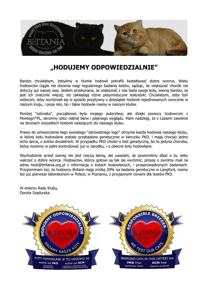 „HODUJEMY ODPOWIEDZIALNIE” Bardzo chciałabym, żebyśmy w tłumie hodowli potrafili kształtować dobre wzorce. Wielu hodowców ciągle nie docenia wagi regularnego badania kotów, sądząc, że większość chorób nie dotyczy już naszej rasy. Jestem przekonana, że większość z nas bada swoje koty, wierzę bardzo, że jest ich znacznie więcej, niż zakładają różne pesymistyczne statystyki. Chciałabym, żeby byli widoczni, żeby wyróżniali się w sposób pozytywny z dziesiątek hodowli rejestrowanych corocznie w naszym kraju, i poza nim, bo i takie hodowle mamy w naszym klubie. Poniżej "odznaka", początkowo była mojego autorstwa, ale dzięki pomocy hodowcom z Montegri*PL, skromny szkic nabrał barw i pięknego wyglądu. Mam nadzieję, że z czasem zawiśnie na stronach wszystkich hodowli należących do naszego klubu. Prawo do umieszczenia tego swoistego "zdrowotnego logo" otrzyma każda hodowla naszego klubu, w której koty hodowlane zostały przebadane genetycznie w kierunku PKD, i mają chociaż jedno echo serca, u kotów dwuletnich. W przypadku PKD chodzi o test genetyczny, bo to jedyna choroba, którą możemy w pełni kontrolować już w zarodku, i o obecne koty hodowlane. Wychodzenie przed szereg nie jest rzeczą łatwą, ale uważam, że powinniśmy dbać o to, żeby walczyć o dobre wzorce. Hodowców, którzy gotowi są tak się wyróżnić, proszę o zwrotny mail na adres [email protected] z informacją o kotach hodowlanych, i przeprowadzonych badaniach. Przypominam też, że hodowcy Britanii mają zniżkę 20% na badania genetyczne w Langford, mamy też już pierwsze laboratorium w Polsce, w Poznaniu, z przyjaznymi cenami dla testów PKD. W imieniu Rady Klubu, Dorota Szadurska