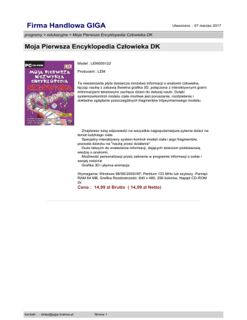 Firma Handlowa GIGA Utworzono : 07 marzec 2017 programy > edukacyjne > Moja Pierwsza Encyklopedia Człowieka DK Moja Pierwsza Encyklopedia Człowieka DK Model : LEM000122 Producent : LEM Ta niesamowita płyta dostarcza mnóstwo informacji o anatomii człowieka, łącząc naukę z zabawą Świetna grafika 3D, połączona z interaktywnymi grami iinformacjami tekstowymi zachęca dzieci do dalszej nauki. Dzięki systemowikontroli modelu ciała możliwe jest poruszanie, rozdzielania i dokładne oglądanie poszczególnych fragmentów trójwymiarowego modelu. Znajdziesz tutaj odpowiedzi na wszystkie najpopularniejsze pytania dzieci na temat ludzkiego ciała Specjalny interaktywny system kontroli modeli ciała i jego fragmentów, pozwala dziecku na "naukę przez działania" Dużo łatwych do znalezienia informacji, dających dzieciom podstawową wiedzę o anatomii. Możliwość personalizacji przez zebranie w programie informacji o sobie i swojej rodzinie Grafika 3D i płynna animacja Wymagania: Windows 98/SE/2000/XP, Pentium 133 MHz lub szybszy, Pamięć RAM 64 MB, Grafika Rozdzielczość: 640 x 480, 256 kolorów, Napęd CD-ROM 2x Cena : 14,99 zł Brutto ( 14,99 zł Netto) kontakt : - [email protected] Strona 1