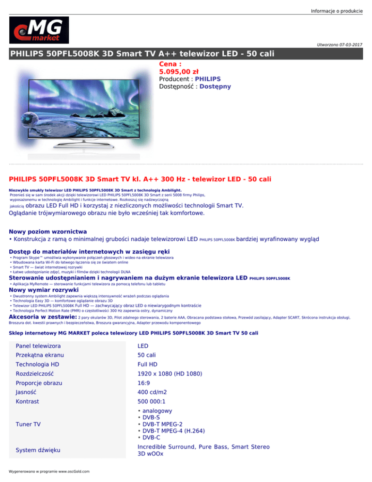 Informacje o produkcie Utworzono 07-03-2017 PHILIPS 50PFL5008K 3D Smart TV A++ telewizor LED - 50 cali Cena : 5.095,00 zł Producent : PHILIPS Dostępność : Dostępny PHILIPS 50PFL5008K 3D Smart TV kl. A++ 300 Hz - telewizor LED - 50 cali Niezwykle smukły telewizor LED PHILIPS 50PFL5008K 3D Smart z technologią Ambilight. Przenieś się w sam środek akcji dzięki telewizorowi LED PHILIPS 50PFL5008K 3D Smart z serii 5008 firmy Philips, wyposażonemu w technologię Ambilight i funkcje internetowe. Rozkoszuj się nadzwyczajną jakością obrazu LED Full HD i korzystaj z niezliczonych możliwości technologii Smart TV. Oglądanie trójwymiarowego obrazu nie było wcześniej tak komfortowe. Nowy poziom wzornictwa • Konstrukcja z ramą o minimalnej grubości nadaje telewizorowi LED PHILIPS 50PFL5008K bardziej wyrafinowany wygląd Dostęp do materiałów internetowych w zasięgu ręki • Program Skype™ umożliwia wykonywanie połączeń głosowych i wideo na ekranie telewizora • Wbudowana karta Wi-Fi do łatwego łączenia się ze światem online • Smart TV — świat internetowej rozrywki • Łatwe udostępnianie zdjęć, muzyki i filmów dzięki technologii DLNA Sterowanie udostępnianiem i nagrywaniem na dużym ekranie telewizora LED PHILIPS 50PFL5008K • Aplikacja MyRemote — sterowanie funkcjami telewizora za pomocą telefonu lub tabletu Nowy wymiar rozrywki • Dwustronny system Ambilight zapewnia większą intensywność wrażeń podczas oglądania • Technologia Easy 3D — komfortowe oglądanie obrazu 3D • Telewizor LED PHILIPS 50PFL5008K Full HD — zachwycający obraz LED o niewiarygodnym kontraście • Technologia Perfect Motion Rate (PMR) o częstotliwości 300 Hz zapewnia ostry, dynamiczny Akcesoria w zestawie: 2 pary okularów 3D, Pilot zdalnego sterowania, 2 baterie AAA, Obracana podstawa stołowa, Przewód zasilający, Adapter SCART, Skrócona instrukcja obsługi, Broszura dot. kwestii prawnych i bezpieczeństwa, Broszura gwarancyjna, Adapter przewodu komponentowego Sklep internetowy MG MARKET poleca telewizory LED PHILIPS 50PFL5008K 3D Smart TV 50 cali Panel telewizora LED Przekątna ekranu 50 cali Technologia HD Full HD Rozdzielczość 1920 x 1080 (HD 1080) Proporcje obrazu 16:9 Jasność 400 cd/m2 Kontrast 500 000:1 Tuner TV • analogowy • DVB-S • DVB-T MPEG-2 • DVB-T MPEG-4 (H.264) • DVB-C System dźwięku Incredible Surround, Pure Bass, Smart Stereo 3D wOOx Wygenerowano w programie www.oscGold.com Moc głośników 20 W Telegazeta (pamięć) 1000 stron Wbudowany dysk twardy Brak Złącza HDMI 3 Złącza Component 1 Złącza SCART 1 Pozostałe złącza we/wy telewizora LED PHILIPS 50PFL5008K Liczba złącz USB: 2 Antena IEC75, Common Interface Plus (CI+), Ethernet-LAN RJ-45, Cyfrowe wyjście audio (optyczne), Wejście audio L/P, Wyjście na słuchawki, Złącze usługi Montaż na ścianie VESA 400 x 400 Pobór mocy 52 W Wymiary telewizora LED PHILIPS 50PFL5008K Wymiary zestawu (szer. x wys. x gł.): 1126 x 673 x 34,4 mm Wymiary zestawu z podstawą (szer. x wys. x gł.): Waga telewizora LED 17.7 kg Pozostałe parametry telewizora LED PHILIPS 50PFL5008K Temperatura otoczenia: 5°C–35°C Klasa energetyczna: A++ Etykieta energetyczna UE: 52 W Roczne zużycie energii: 72 kWh Pobór mocy w trybie gotowości: < 0,3 W Funkcje oszczędzania energii: Zegar automatycznego wyłączania, Tryb EcoMode, Czujnik światła, Wyłączanie obrazu (dla radia) Inteligentna obsługa Interakcja z użytkownikiem: SimplyShare, Klient MultiRoom*, Certyfikat Wi-Fi Miracast* Program: Wstrzymanie odtwarzania programu, Nagrywanie USB* Łatwa instalacja: Automatyczne wykrywanie urządzeń firmy Philips, Kreator połączeń z urządzeniami, Kreator instalacji sieci, Kreator ustawień Łatwa obsługa: Sterowanie jednym przyciskiem Home, Ekranowa instrukcja obsługi Aktualizacje oprogramowania urządzenia: Kreator aktualizacji oprogramowania, Aktualizowanie oprogramowania przez USB, Aktualizacja oprogramowania sprzętowego w Internecie Ustawienia formatu ekranu: Automatyczne wypełnianie, Automatyczne powiększenie, Format filmowy 16:9, Duże powiększenie, Nieskalowany, Panoramiczny Wskaźnik siły sygnału Gwarancja producenta - 24 miesiące.