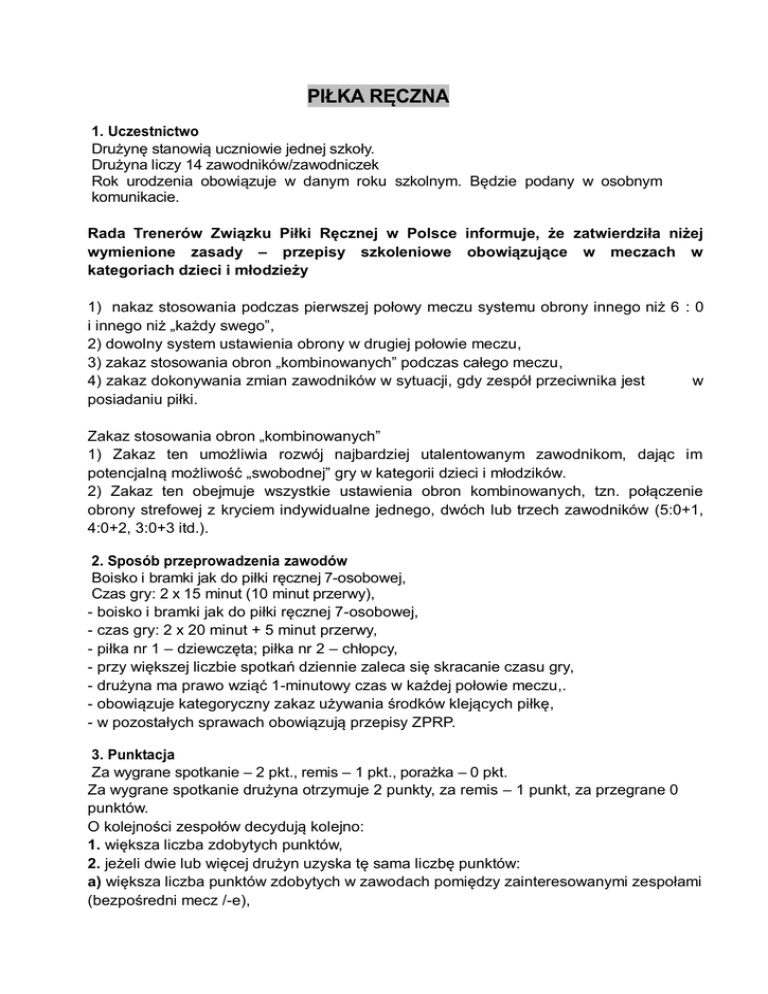 PIŁKA RĘCZNA 1. Uczestnictwo Drużynę stanowią uczniowie jednej szkoły. Drużyna liczy 14 zawodników/zawodniczek Rok urodzenia obowiązuje w danym roku szkolnym. Będzie podany w osobnym komunikacie. Rada Trenerów Związku Piłki Ręcznej w Polsce informuje, że zatwierdziła niżej wymienione zasady – przepisy szkoleniowe obowiązujące w meczach w kategoriach dzieci i młodzieży 1) nakaz stosowania podczas pierwszej połowy meczu systemu obrony innego niż 6 : 0 i innego niż „każdy swego”, 2) dowolny system ustawienia obrony w drugiej połowie meczu, 3) zakaz stosowania obron „kombinowanych” podczas całego meczu, 4) zakaz dokonywania zmian zawodników w sytuacji, gdy zespół przeciwnika jest w posiadaniu piłki. Zakaz stosowania obron „kombinowanych” 1) Zakaz ten umożliwia rozwój najbardziej utalentowanym zawodnikom, dając im potencjalną możliwość „swobodnej” gry w kategorii dzieci i młodzików. 2) Zakaz ten obejmuje wszystkie ustawienia obron kombinowanych, tzn. połączenie obrony strefowej z kryciem indywidualne jednego, dwóch lub trzech zawodników (5:0+1, 4:0+2, 3:0+3 itd.). 2. Sposób przeprowadzenia zawodów Boisko i bramki jak do piłki ręcznej 7-osobowej, Czas gry: 2 x 15 minut (10 minut przerwy), - boisko i bramki jak do piłki ręcznej 7-osobowej, - czas gry: 2 x 20 minut + 5 minut przerwy, - piłka nr 1 – dziewczęta; piłka nr 2 – chłopcy, - przy większej liczbie spotkań dziennie zaleca się skracanie czasu gry, - drużyna ma prawo wziąć 1-minutowy czas w każdej połowie meczu,. - obowiązuje kategoryczny zakaz używania środków klejących piłkę, - w pozostałych sprawach obowiązują przepisy ZPRP. 3. Punktacja Za wygrane spotkanie – 2 pkt., remis – 1 pkt., porażka – 0 pkt. Za wygrane spotkanie drużyna otrzymuje 2 punkty, za remis – 1 punkt, za przegrane 0 punktów. O kolejności zespołów decydują kolejno: 1. większa liczba zdobytych punktów, 2. jeżeli dwie lub więcej drużyn uzyska tę sama liczbę punktów: a) większa liczba punktów zdobytych w zawodach pomiędzy zainteresowanymi zespołami (bezpośredni mecz /-e), b) korzystniejsza różnica bramek z zawodów pomiędzy zainteresowanymi zespołami, c) większa liczba zdobytych bramek z zawodów pomiędzy zainteresowanymi zespołami, d) korzystniejsza różnica bramek w całym turnieju, e) większa liczba zdobytych bramek w całym turnieju. 4. Miejsce i termin Będą podawane w terminarzu rozgrywek w danym roku szkolnym na stronie www.szsopolskie.pl