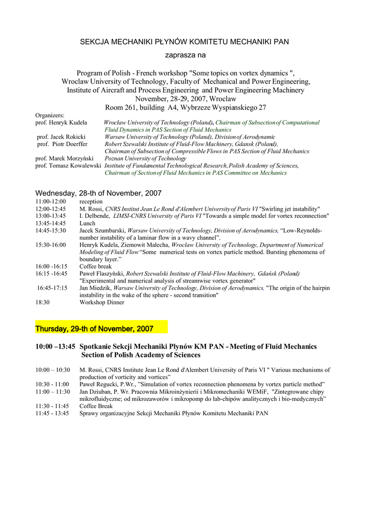 SEKCJA MECHANIKI PŁYNÓW KOMITETU MECHANIKI PAN zaprasza na Program of Polish - French workshop "Some topics on vortex dynamics ", Wroclaw University of Technology, Faculty of Mechanical and Power Engineering, Institute of Aircraft and Process Engineering and Power Engineering Machinery November, 28-29, 2007, Wroclaw Room 261, building A4, Wybrzeze Wyspianskiego 27 Organizers: prof. Henryk Kudela Wrocław University of Technology (Poland), Chairman of Subsection of Computational Fluid Dynamics in PAS Section of Fluid Mechanics prof. Jacek Rokicki Warsaw University of Technology (Poland), Division of Aerodynamic prof. Piotr Doerffer Robert Szewalski Institute of Fluid-Flow Machinery, Gdansk (Poland), Chairman of Subsection of Compressible Flows in PAS Section of Fluid Mechanics prof. Marek Morzyński Poznan University of Technology prof. Tomasz Kowalewski Institute of Fundamental Technological Research, Polish Academy of Sciences, Chairman of Section of Fluid Mechanics in PAS Committee on Mechanics Wednesday, 28-th of November, 2007 11:00-12:00 12:00-12:45 13:00-13:45 13:45-14:45 14:45-15:30 15:30-16:00 16:00 -16:15 16:15 -16:45 16:45-17:15 18:30 reception M. Rossi, CNRS Institut Jean Le Rond d'Alembert University of Paris VI "Swirling jet instability" I. Delbende, LIMSI-CNRS University of Paris VI "Towards a simple model for vortex reconnection" Lunch Jacek Szumbarski, Warsaw University of Technology, Division of Aerodynamics, “Low-Reynoldsnumber instability of a laminar flow in a wavy channel”. Henryk Kudela, Ziemowit Malecha, Wroclaw University of Technology, Department of Numerical Modeling of Fluid Flow “Some numerical tests on vortex particle method. Bursting phenomena of boundary layer.” Coffee break Paweł Flaszyński, Robert Szewalski Institute of Fluid-Flow Machinery, Gdańsk (Poland) "Experimental and numerical analysis of streamwise vortex generator" Jan Miedzik, Warsaw University of Technology, Division of Aerodynamics, "The origin of the hairpin instability in the wake of the sphere - second transition" Workshop Dinner Thursday, 29-th of November, 2007 10:00 –13:45 Spotkanie Sekcji Mechaniki Płynów KM PAN - Meeting of Fluid Mechanics Section of Polish Academy of Sciences 10:00 – 10:30 10:30 - 11:00 11:00 – 11:30 11:30 - 11:45 11:45 - 13:45 M. Rossi, CNRS Institute Jean Le Rond d'Alembert University of Paris VI " Various mechanisms of production of vorticity and vortices” Paweł Regucki, P.Wr., ”Simulation of vortex reconnection phenomena by vortex particle method” Jan Dziuban, P. Wr. Pracownia Mikroinżynierii i Mikromechaniki WEMiF, "Zintegrowane chipy mikrofluidyczne; od mikrozaworów i mikropomp do lab-chipów analitycznych i bio-medycznych” Coffee Break Sprawy organizacyjne Sekcji Mechaniki Płynów Komitetu Mechaniki PAN