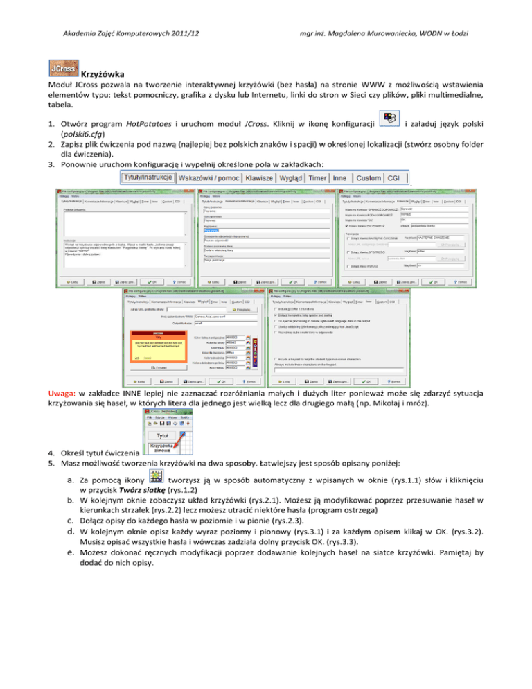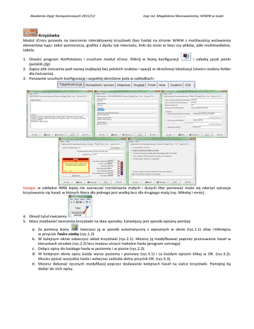 Akademia Zajęć Komputerowych 2011/12 mgr inż. Magdalena Murowaniecka, WODN w Łodzi Krzyżówka Moduł JCross pozwala na tworzenie interaktywnej krzyżówki (bez hasła) na stronie WWW z możliwością wstawienia elementów typu: tekst pomocniczy, grafika z dysku lub Internetu, linki do stron w Sieci czy plików, pliki multimedialne, tabela. 1. Otwórz program HotPotatoes i uruchom moduł JCross. Kliknij w ikonę konfiguracji i załaduj język polski (polski6.cfg) 2. Zapisz plik dwiczenia pod nazwą (najlepiej bez polskich znaków i spacji) w określonej lokalizacji (stwórz osobny folder dla dwiczenia). 3. Ponownie uruchom konfigurację i wypełnij określone pola w zakładkach: . Uwaga: w zakładce INNE lepiej nie zaznaczad rozróżniania małych i dużych liter ponieważ może się zdarzyd sytuacja krzyżowania się haseł, w których litera dla jednego jest wielką lecz dla drugiego małą (np. Mikołaj i mróz). 4. Określ tytuł dwiczenia 5. Masz możliwośd tworzenia krzyżówki na dwa sposoby. Łatwiejszy jest sposób opisany poniżej: a. Za pomocą ikony b. c. d. e. tworzysz ją w sposób automatyczny z wpisanych w oknie (rys.1.1) słów i kliknięciu w przycisk Twórz siatkę (rys.1.2) W kolejnym oknie zobaczysz układ krzyżówki (rys.2.1). Możesz ją modyfikowad poprzez przesuwanie haseł w kierunkach strzałek (rys.2.2) lecz możesz utracid niektóre hasła (program ostrzega) Dołącz opisy do każdego hasła w poziomie i w pionie (rys.2.3). W kolejnym oknie opisz każdy wyraz poziomy i pionowy (rys.3.1) i za każdym opisem klikaj w OK. (rys.3.2). Musisz opisad wszystkie hasła i wówczas zadziała dolny przycisk OK. (rys.3.3). Możesz dokonad ręcznych modyfikacji poprzez dodawanie kolejnych haseł na siatce krzyżówki. Pamiętaj by dodad do nich opisy. Akademia Zajęć Komputerowych 2011/12 mgr inż. Magdalena Murowaniecka, WODN w Łodzi f. Zapisz projekt i wygeneruj stronę WWW. Obejrzyj ją w przeglądarce i ewentualnie dokonaj modyfikacji (rys.1). Możesz wstawid dodatkowo tekst pomocniczy a w nim umieścid elementy takie jak: grafika, tabela, linki czy multimedia. Tych elementów nie wstawisz jednak do obszaru, w którym mieści się krzyżówka (rys.2). Możesz też tworzyd własny układ krzyżówki poprzez wpisywanie haseł w pola siatki, a potem dodad opisy.