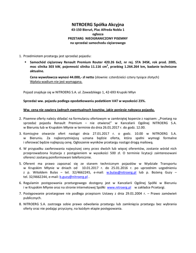 NITROERG Spółka Akcyjna 43-150 Bieruń, Plac Alfreda Nobla 1 ogłasza PRZETARG NIEOGRANICZONY PISEMNY na sprzedaż samochodu ciężarowego 1. Przedmiotem przetargu jest sprzedaż pojazdu: Samochód ciężarowy Renault Premium Router 420.26 6x2, nr rej. STA 34SK, rok prod. 2005, moc silnika 303 kW, pojemność silnika 11.116 cm3, przebieg 1.264.264 km, badanie techniczne aktualne. Cena wywoławcza wynosi 44.000,- zł netto (słownie: czterdzieści cztery tysiące złotych) Wpłata wadium nie jest wymagana. Pojazd znajduje się w NITROERG S.A. ul. Zawadzkiego 1, 42-693 Krupski Młyn Sprzedaż ww. pojazdu podlega opodatkowaniu podatkiem VAT w wysokości 23%. Ww. cena nie zawiera żadnych ewentualnych kosztów, jakie poniesie nabywca pojazdu. 2. Pisemne oferty należy składać na formularzu ofertowym w zamkniętej kopercie z napisem: „Przetarg na sprzedaż pojazdu Renault Premium – nie otwierać” w Kancelarii Ogólnej NITROERG S.A. w Bieruniu lub w Krupskim Młynie w terminie do dnia 26.01.2017 r. do godz. 12.00. 3. Komisyjne otwarcie ofert nastąpi dnia 27.01.2017 r. o godz. 10.00 w NITROERG S.A. w Bieruniu. Za najkorzystniejszą uznana będzie oferta, która spełni wymogi formalne i oferować będzie najlepszą cenę. Ogłoszenie wyników przetargu nastąpi drogą mailową. 4. W przypadku zaoferowania najwyższej ceny przez dwóch lub więcej oferentów, zostanie wśród nich przeprowadzona licytacja z postąpieniem w wysokości 500 zł. O terminie licytacji zainteresowani oferenci zostaną poinformowani telefonicznie. 5. Oferent ma prawo zapoznać się ze stanem technicznym pojazdów w Wydziale Transportu w Krupskim Młynie w dniach od 10.01.2017 r. do 25.01.2016 r. po uprzednim uzgodnieniu z p. Witoldem Bulas – tel. 32/4662245, e-mail: [email protected] lub p. Bożeną Guzy – tel. 32/4662244, e-mail: [email protected] . 6. Regulamin postępowania przetargowego dostępny jest w Kancelarii Ogólnej Spółki w Bieruniu i w Krupskim Młynie oraz na stronie internetowej Spółki www.nitroerg.pl w zakładce Przetargi. 7. Postępowanie przetargowe nie podlega przepisom Ustawy z dnia 29.01.2004 r. – Prawo zamówień publicznych. 8. NITROERG S.A. zastrzega sobie prawo odwołania przetargu lub zamknięcia przetargu bez wybrania oferty oraz nie podając przyczyny, na każdym etapie postępowania.