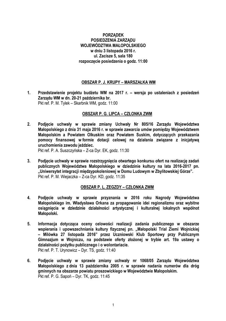 PORZĄDEK POSIEDZENIA ZARZĄDU WOJEWÓDZTWA MAŁOPOLSKIEGO w dniu 3 listopada 2016 r. ul. Zacisze 5, sala 180 rozpoczęcie posiedzenia o godz. 11:00 OBSZAR P. J. KRUPY – MARSZAŁKA WM 1. Przedstawienie projektu budżetu WM na 2017 r. – wersja po ustaleniach z posiedzeń Zarządu WM w dn. 20-21 października br. Pkt ref. P. M. Tylek – Skarbnik WM, godz. 11:00 OBSZAR P. G. LIPCA – CZŁONKA ZWM 2. Podjęcie uchwały w sprawie zmiany Uchwały Nr 805/16 Zarządu Województwa Małopolskiego z dnia 31 maja 2016 r. w sprawie zawarcia umów pomiędzy Województwem Małopolskim a Powiatem Olkuskim oraz Powiatem Suskim, dotyczących przekazania pomocy finansowej w formie dotacji celowej na działania związane z inicjatywą uruchomienia zawodu jeździec. Pkt ref. P. A. Suszczyńska – Z-ca Dyr. EK, godz. 11:30 3. Podjęcie uchwały w sprawie rozstrzygnięcia otwartego konkursu ofert na realizację zadań publicznych Województwa Małopolskiego w dziedzinie kultury na lata 2016-2017 pn. „Uniwersytet integracji międzypokoleniowej w Domu Ludowym w Zbylitowskiej Górze”. Pkt ref. P. M. Wiejaczka – Z-ca Dyr. KD, godz. 11:35 OBSZAR P. L. ZEGZDY – CZŁONKA ZWM 4. Podjęcie uchwały w sprawie przyznania w 2016 roku Nagrody Województwa Małopolskiego im. Władysława Orkana za propagowanie idei regionalizmu oraz wybitne osiągnięcia w dziedzinie działalności artystycznej i kulturalnej lokalnych wspólnot Małopolski. 5. Informacja dotycząca oceny celowości realizacji zadania publicznego w obszarze wspierania i upowszechniania kultury fizycznej pn. „Małopolski Trial Ziemi Wojnickiej – Milówka 27 listopada 2016” przez Uczniowski Klub Sportowy przy Publicznym Gimnazjum w Wojniczu, na podstawie oferty złożonej w trybie art. 19a ustawy o działalności pożytku publicznego i o wolontariacie. Pkt ref. P. T. Urynowicz – Dyr. TS, godz. 11:40 6. Podjęcie uchwały w sprawie zmiany uchwały nr 1068/05 Zarządu Województwa Małopolskiego z dnia 13 października 2005 r. w sprawie nadania numerów dla dróg gminnych na obszarze powiatu proszowickiego w Województwie Małopolskim. Pkt ref. P. G. Sapoń – Dyr. TK, godz. 11:45 1 7. 8. 9. Podjęcie uchwały w sprawie zmiany uchwały nr 1076/05 Zarządu Województwa Małopolskiego z dnia 13 października 2005 r. w sprawie nadania numerów dla dróg gminnych na obszarze powiatu myślenickiego w Województwie Małopolskim. Podjęcie uchwały w sprawie zmiany uchwały nr 1071/05 Zarządu Województwa Małopolskiego z dnia 13 października 2005 r. w sprawie nadania numerów dla dróg gminnych na obszarze powiatu bocheńskiego w Województwie Małopolskim. Podjęcie uchwały w sprawie zmiany uchwały nr 1079/05 Zarządu Województwa Małopolskiego z dnia 13 października 2005 r. w sprawie nadania numerów dla dróg gminnych na obszarze powiatu gorlickiego w Województwie Małopolskim. 10. Podjęcie uchwały w sprawie zawarcia porozumienia oraz umowy pomiędzy Województwem Małopolskim, a Gminą Brzeźnica dotyczących współpracy przy realizacji zadania p.n. „Budowa tras rowerowych w Małopolsce – Zadanie nr 1. Wiślana Trasa Rowerowa (WTR) - odcinek II: od Gminy Brzeszcze do Gminy Skawina”. Pkt ref. P. M. Maj – p.o. Dyr. ZDW w Krakowie, godz. 11:50 11. Podjęcie uchwały w sprawie zawarcia umowy partnerskiej pomiędzy Województwem Małopolskim, a Powiatem Krakowskim dotyczącej współpracy przy realizacji zadania p.n. „Budowa tras rowerowych w Małopolsce – Zadanie nr 1. Wiślana Trasa Rowerowa (WTR)”. 12. Podjęcie uchwały w sprawie zawarcia porozumienia pomiędzy Zarządem Województwa Małopolskiego a Burmistrzem Miasta i Gminy Zakliczyn w sprawie przekazania zarządzania drogą wojewódzką nr 980 na odcinku 050 od km 1+ 540,60 do km 1+872,30 w trybie art. 19 ust. 4 ustawy z dnia 21 marca 1985 r. o 1+drogach publicznych. 13. Podjęcie uchwały w sprawie zawarcia aneksu nr 1 do umowy nr X/3/ZDW/15 z dnia 10 marca 2015 r. pomiędzy Województwem Małopolskim, a Powiatem Miechowskim oraz Miastem i Gminą Miechów dotyczącej wspólnej realizacji zadania inwestycyjnego p.n. „Północne obejście Miechowa w ciągu DW 783”. 14. Podjęcie uchwały w sprawie zawarcia aneksu nr 2 do umowy nr X/147/ZDW/14 z dnia 12 listopada 2014 r. pomiędzy Województwem Małopolskim, a Powiatem Bocheńskim oraz Gminą Miastem Bochnia dotyczącej wspólnej realizacji zadania inwestycyjnego p.n. „Połączenie drogowe węzła autostradowego A4 – Bochnia z drogą krajową nr 94”. 15. Przyjęcie materiałów na XXX Sesję Sejmiku WM w dn. 21 listopada br.: Podjęcie uchwały sprawie zmiany Uchwały nr XXII/320/16 Sejmiku Województwa Małopolskiego z dnia 25 kwietnia 2016 r. w sprawie udzielenia pomocy finansowej na rzecz Gminy Gromnik. 16. Przyjęcie materiałów na XXX Sesję Sejmiku WM w dn. 21 listopada br.: Podjęcie uchwały w sprawie zmiany Uchwały Sejmiku Województwa Małopolskiego nr XX/266/16 z dnia 29 lutego 2016 r. w sprawie powierzenia Miastu i Gminie Uzdrowiskowej Muszyna zadania własnego Województwa p.n. „Budowa Zintegrowanej Sieci Tras Rowerowych EuroVelo11 – odcinek południowy wzdłuż Doliny Popradu”. 17. Podjęcie uchwały w sprawie przyjęcia Regulaminu konkursu dla naboru wniosków o dofinansowanie projektów ze środków Regionalnego Programu Operacyjnego Województwa Małopolskiego na lata 2014-2020 w ramach 8. Osi Priorytetowej Rynek pracy, Działania 2 8.6 Wsparcie na rzecz wydłużenia aktywności zawodowej, Poddziałania 8.6.1 Realizacja programów przekwalifikowania pracowników i wsparcie dla pracodawców. Pkt ref. P. A. Paluchowska – Z-ca Dyr. WUP w Krakowie, godz. 12:00 18. Podjęcie uchwały w sprawie zatwierdzenia listy ocenionych projektów oraz wyboru projektów do dofinansowania w ramach konkursu nr RPMP.09.02.02-IP.01-12-035/16 w ramach Regionalnego Programu Operacyjnego Województwa Małopolskiego na lata 2014 – 2020 w ramach 9 Osi Priorytetowej Region spójny społecznie, Działanie 