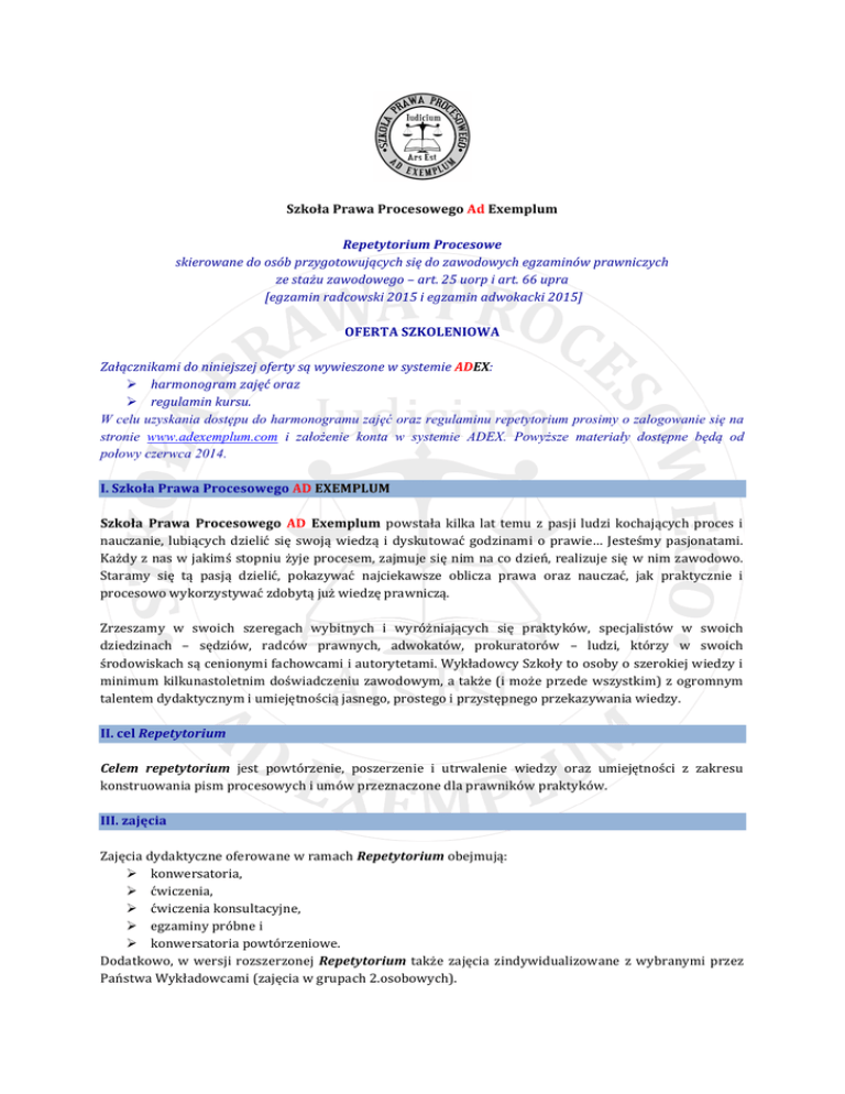 Szkoła Prawa Procesowego Ad Exemplum Repetytorium Procesowe skierowane do osób przygotowujących się do zawodowych egzaminów prawniczych ze stażu zawodowego – art. 25 uorp i art. 66 upra [egzamin radcowski 2015 i egzamin adwokacki 2015] OFERTA SZKOLENIOWA Załącznikami do niniejszej oferty są wywieszone w systemie ADEX: ! harmonogram zajęć oraz ! regulamin kursu. W celu uzyskania dostępu do harmonogramu zajęć oraz regulaminu repetytorium prosimy o zalogowanie się na stronie www.adexemplum.com i założenie konta w systemie ADEX. Powyższe materiały dostępne będą od połowy czerwca 2014. I. Szkoła Prawa Procesowego AD EXEMPLUM Szkoła Prawa Procesowego AD Exemplum powstała kilka lat temu z pasji ludzi kochających proces i nauczanie, lubiących dzielić się swoją wiedzą i dyskutować godzinami o prawie… Jesteśmy pasjonatami. Każdy z nas w jakimś stopniu żyje procesem, zajmuje się nim na co dzień, realizuje się w nim zawodowo. Staramy się tą pasją dzielić, pokazywać najciekawsze oblicza prawa oraz nauczać, jak praktycznie i procesowo wykorzystywać zdobytą już wiedzę prawniczą. Zrzeszamy w swoich szeregach wybitnych i wyróżniających się praktyków, specjalistów w swoich dziedzinach – sędziów, radców prawnych, adwokatów, prokuratorów – ludzi, którzy w swoich środowiskach są cenionymi fachowcami i autorytetami. Wykładowcy Szkoły to osoby o szerokiej wiedzy i minimum kilkunastoletnim doświadczeniu zawodowym, a także (i może przede wszystkim) z ogromnym talentem dydaktycznym i umiejętnością jasnego, prostego i przystępnego przekazywania wiedzy. II. cel Repetytorium Celem repetytorium jest powtórzenie, poszerzenie i utrwalenie wiedzy oraz umiejętności z zakresu konstruowania pism procesowych i umów przeznaczone dla prawników praktyków. III. zajęcia Zajęcia dydaktyczne oferowane w ramach Repetytorium obejmują: ! konwersatoria, ! ćwiczenia, ! ćwiczenia konsultacyjne, ! egzaminy próbne i ! konwersatoria powtórzeniowe. Dodatkowo, w wersji rozszerzonej Repetytorium także zajęcia zindywidualizowane z wybranymi przez Państwa Wykładowcami (zajęcia w grupach 2.osobowych). Przedstawiony podział zajęć jest synergią naszego doświadczenia, wypracowanego na jego podstawie systemu nauczania i technik utrwalania wiedzy. IV. WYKŁADOWCY Wykładowcami na Repetytorium są wyłącznie praktycy mający kilkunastoletnie doświadczenie zawodowe [na ogół 10-‐20 letnie] oraz umiejętności dydaktyczne. Wszyscy Wykładowcy są czynni zawodowo i na co dzień wykonują czynności procesowe bądź konstruują umowy. Znacząca część Wykładowców ma doświadczenie egzaminacyjne obejmujące tak egzaminy ministerialne, jak i wcześniejsze egzaminy korporacyjne oraz wiedzę w zakresie zasad konstruowania i rozwiązywania casusów. Wśród Wykładowców są Sędziowie Sądów Apelacyjnych, Okręgowych i Rejonowych, Prokuratorzy Prokuratur Okręgowych, doświadczeni radcowie prawni i adwokaci, starsi radcowie i radcowie Prokuratorii Generalnej Skarbu Państwa, partnerzy spółek prawniczych, a także doktorzy nauk prawnych. Od początku założenia Szkoły Kadra Wykładowców rozrosła się do grona około 60 osób, przy czym zajęcia na przedmiotowych kursach prowadzą najbardziej doświadczonych i najwybitniejsi z Wykładowców Szkoły. V. organizacja zajęć Kursy odbędą się w okresie sierpień/wrzesień 2014 – marzec 2015, w pięciu blokach zajęciowych. Proponowane poniżej terminy zajęć obejmują okres do wakacji letnich (dokładna rozpiska zajęć znajduje się w harmonogramie). Po przerwie wakacyjnej zaś, zastrzegamy możliwość zmiany proponowanych terminów zajęć, z uwagi na terminy Państwa kolokwiów i innych zobowiązań edukacyjnych. Pierwszym blokiem są konwersatoria pozwalające na przybliżenie Państwu zasad konstruowania poszczególnych pism procesowych i umów, czyli przekazanie wszystkich informacji, które będą niezbędne (i wymagane) w dalszej części kursu do samodzielnego rozwiązywania casusów i konstruowania na ich podstawie pism procesowych. Proces edukacyjny w zakresie tej tematyki pogłębiany jest casusami domowymi służącymi przećwiczeniu i utrwaleniu poszczególnych zasad. Zajęcia te proponujemy w poszczególne dni tygodnia w godzinach 18:00 – 21:00 (22:00). Zajęcia ćwiczeń konsultacyjnych (drugi blok), to zajęcia na których omawiane są z Państwem casusy domowe zadawane po konwersatoriach. Omówieniu podlegają zarówno same casusy, jak i przygotowane przez Państwa rozwiązania. Ocenie i analizie poddawane są konstrukcje Państwa zarzutów, wniosków i klauzul oraz komparycji umownych. Dodatkowo w systemie ADEX wywieszane są prawidłowe rozwiązania z sugerowaną treścią zarzutów i wniosków bądź treścią klauzul umownych. Zajęcia te proponujemy w poszczególne dni tygodnia w godzinach 18:00 – 21:00, w weekendy 10:00-‐13:00 bądź 17:00-‐20:00. Zajęcia ćwiczeniowe (trzeci blok), które służą utrwaleniu prawidłowych zasad konstruowania pism procesowych poprzez konstruowanie tych pism w oparciu o casusy domowe (casusy na aktach sądowych). Przygotowane przez Państwa prace domowe (pisma) podlegają wnikliwemu, indywidualnemu sprawdzeniu na piśmie i są Państwu odsyłane wraz z komentarzami i uwagami. Dodatkowo także w systemie ADEX wywieszane są prawidłowe rozwiązania z sugerowaną treścią zarzutów i wniosków, bądź treścią umowy. Rozwiązanie casusów stanowi także przedmiot zajęć ćwiczeniowych, w czasie których omawiane są zarówno błędy popełnione przez sąd, oceniana jest ich waga apelacyjna i merytoryczne rozwiązanie casusu. Zajęcia te proponujemy w poszczególne dni tygodnia w godzinach 18:00 – 21:00, w weekendy 10:00-‐13:00 bądź 17:00-‐20:00. Zajęcia w tygodniu odbywają się na pograniczu Śródmieścia i Woli, w weekendy na Saskiej Kępie (okolice Ronda Waszyngtona). Blok czwarty stanowią egzaminy próbne, kt