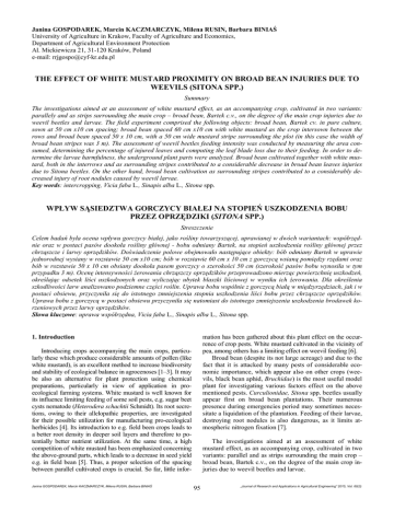 Janina GOSPODAREK, Marcin KACZMARCZYK, Milena RUSIN, Barbara BINIAŚ University of Agriculture in Krakow, Faculty of Agriculture and Economics, Department of Agricultural Environment Protection Al. Mickiewicza 21, 31-120 Kraków, Poland e-mail: [email protected] THE EFFECT OF WHITE MUSTARD PROXIMITY ON BROAD BEAN INJURIES DUE TO WEEVILS (SITONA SPP.) Summary The investigations aimed at an assessment of white mustard effect, as an accompanying crop, cultivated in two variants: parallely and as strips surrounding the main crop – broad bean, Bartek c.v., on the degree of the main crop injuries due to weevil beetles and larvae. The field experiment comprised the following objects: broad bean, Bartek cv. in pure culture, sown at 50 cm x10 cm spacing; broad bean spaced 60 cm x10 cm with white mustard as the crop intersown between the rows and broad bean spaced 50 x 10 cm, with a 50 cm wide mustard stripe surrounding the plot (in this case the width of broad bean stripes was 3 m). The assessment of weevil beetles feeding intensity was conducted by measuring the area consumed, determining the percentage of injured leaves and computing the leaf blade loss due to their feeding. In order to determine the larvae harmfulness, the underground plant parts were analyzed. Broad bean cultivated together with white mustard, both in the interrows and as surrounding stripes contributed to a considerable decrease in broad bean leaves injuries due to Sitona beetles. On the other hand, broad bean cultivation as surrounding stripes contributed to a considerably decreased injury of root nodules caused by weevil larvae. Key words: intercropping, Vicia faba L., Sinapis alba L., Sitona spp. WPŁYW SĄSIEDZTWA GORCZYCY BIAŁEJ NA STOPIEŃ USZKODZENIA BOBU PRZEZ OPRZĘDZIKI (SITONA SPP.) Streszczenie Celem badań była ocena wpływu gorczycy białej, jako rośliny towarzyszącej, uprawianej w dwóch wariantach: współrzędnie oraz w postaci pasów dookoła rośliny głównej - bobu odmiany Bartek, na stopień uszkodzenia rośliny głównej przez chrząszcze i larwy oprzędzików. Doświadczenie polowe obejmowało następujące obiekty: bób odmiany Bartek w uprawie jednorodnej wysiany w rozstawie 50 cm x10 cm; bób w rozstawie 60 cm x 10 cm z gorczycą wsianą pomiędzy rzędami oraz bób w rozstawie 50 x 10 cm obsiany dookoła pasem gorczycy o szerokości 50 cm (szerokość pasów bobu wynosiła w tym przypadku 3 m). Ocenę intensywności żerowania chrząszczy oprzędzików przeprowadzono mierząc powierzchnię uszkodzeń, określając odsetek liści uszkodzonych oraz wyliczając ubytek blaszki liściowej w wyniku ich żerowania. Dla określenia szkodliwości larw analizowano podziemne części roślin. Uprawa bobu wspólnie z gorczycą białą w międzyrzędziach, jak i w postaci obsiewu, przyczyniła się do istotnego zmniejszenia stopnia uszkodzenia liści bobu przez chrząszcze oprzędzików. Uprawa bobu z gorczycą w postaci obsiewu przyczyniła się natomiast do istotnego zmniejszenia uszkodzenia brodawek korzeniowych przez larwy oprzędzików. Słowa kluczowe: uprawa współrzędna, Vicia faba L., Sinapis alba L., Sitona spp. mation has been gathered about this plant effect on the occurrence of crop pests. White mustard cultivated in the vicinity of pea, among others has a limiting effect on weevil feeding [6]. Broad bean (despite its not large acreage) and due to the fact that it is attacked by many pests of considerable economic importance, which appear also on other crops (weevils, black bean aphid, Bruchidae) is the most useful model plant for investigating various factors effect on the above mentioned pests. Curculionidae, Sitona spp. beetles usually appear first on broad bean plantations. Their numerous presence during emergencies period may sometimes necessitate a liquidation of the plantation. Feeding of their larvae, destroying root nodules is also dangerous, as it limits atmospheric nitrogen fixation [7]. 1. Introduction Introducing crops accompanying the main crops, particularly these which produce considerable amounts of pollen (like white mustard), is an excellent method to increase biodiversity and stability of ecological balance in agrocenoses [1–3]. It may be also an alternative for plant protection using chemical preparations, particularly in view of application in proecological farming systems. White mustard is well known for its influence limiting feeding of some soil pests, e.g. sugar beet cysts nematode (Heterodera schachtii Schmidt). Its root secretions, owing to their allelopathic properties, are investigated for their possible utilization for manufacturing pro-ecological herbicides [4]. Its introduction to e.g. field been crops leads to a better root density in deeper soil layers and therefore to potentially better nutrient utilization. At the same time, a high competition of white mustard has been emphasized concerning the above-ground parts, which leads to a decrease in seed yield e.g. in field bean [5]. Thus, a proper selection of the spacing between parallel cultivated crops is crucial. So far, little inforJanina GOSPODAREK, Marcin KACZMARCZYK, Milena RUSIN, Barbara BINIAŚ The investigations aimed at an assessment of white mustard effect, as an accompanying crop, cultivated in two variants: parallel and as strips surrounding the main crop – broad bean, Bartek c.v., on the degree of the main crop injuries due to weevil beetles and larvae. 95 „Journal of Research and Applications in Agricultural Engineering” 2015, Vol. 60(3) ing over time and with the appearance of subsequent leaves. It should be emphasized that registered number of injured leaves was quite low. Previous investigations indicated considerable divergences in the number of leaves injured by weevil beetles among various investigated seasons (from 20% to even 80%) [8]. The reason for low intensity of Sitona harmfulness in the presented experiment might have been also quite rare appearance of bean crops (and th