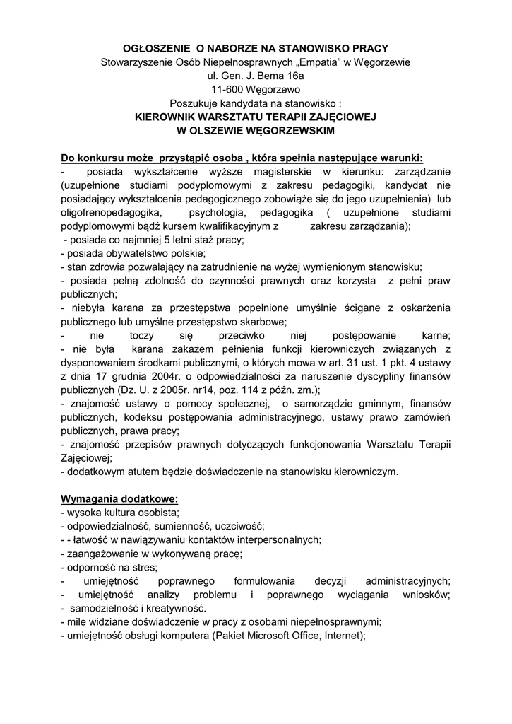 OGŁOSZENIE O NABORZE NA STANOWISKO PRACY Stowarzyszenie Osób Niepełnosprawnych „Empatia” w Węgorzewie ul. Gen. J. Bema 16a 11-600 Węgorzewo Poszukuje kandydata na stanowisko : KIEROWNIK WARSZTATU TERAPII ZAJĘCIOWEJ W OLSZEWIE WĘGORZEWSKIM Do konkursu może przystąpić osoba , która spełnia następujące warunki: posiada wykształcenie wyższe magisterskie w kierunku: zarządzanie (uzupełnione studiami podyplomowymi z zakresu pedagogiki, kandydat nie posiadający wykształcenia pedagogicznego zobowiąże się do jego uzupełnienia) lub oligofrenopedagogika, psychologia, pedagogika ( uzupełnione studiami podyplomowymi bądź kursem kwalifikacyjnym z zakresu zarządzania); - posiada co najmniej 5 letni staż pracy; - posiada obywatelstwo polskie; - stan zdrowia pozwalający na zatrudnienie na wyżej wymienionym stanowisku; - posiada pełną zdolność do czynności prawnych oraz korzysta z pełni praw publicznych; - niebyła karana za przestępstwa popełnione umyślnie ścigane z oskarżenia publicznego lub umyślne przestępstwo skarbowe; nie toczy się przeciwko niej postępowanie karne; - nie była karana zakazem pełnienia funkcji kierowniczych związanych z dysponowaniem środkami publicznymi, o których mowa w art. 31 ust. 1 pkt. 4 ustawy z dnia 17 grudnia 2004r. o odpowiedzialności za naruszenie dyscypliny finansów publicznych (Dz. U. z 2005r. nr14, poz. 114 z późn. zm.); - znajomość ustawy o pomocy społecznej, o samorządzie gminnym, finansów publicznych, kodeksu postępowania administracyjnego, ustawy prawo zamówień publicznych, prawa pracy; - znajomość przepisów prawnych dotyczących funkcjonowania Warsztatu Terapii Zajęciowej; - dodatkowym atutem będzie doświadczenie na stanowisku kierowniczym. Wymagania dodatkowe: - wysoka kultura osobista; - odpowiedzialność, sumienność, uczciwość; - - łatwość w nawiązywaniu kontaktów interpersonalnych; - zaangażowanie w wykonywaną pracę; - odporność na stres; umiejętność poprawnego formułowania decyzji administracyjnych; - umiejętność analizy problemu i poprawnego wyciągania wniosków; - samodzielność i kreatywność. - mile widziane doświadczenie w pracy z osobami niepełnosprawnymi; - umiejętność obsługi komputera (Pakiet Microsoft Office, Internet); Do głównych zadań osoby zatrudnionej na tym stanowisku będzie należało: - kierowanie, programowanie i nadzorowanie działalności WTZ zgodnie z zgodnie z rozporządzeniem Ministra Gospodarki, Pracy i Polityki Społecznej z dnia 25 marca 2004r. w sprawie Warsztatów Terapii Zajęciowej; - ścisła współpraca z Zarządem Stowarzyszenia; - sporządzanie sprawozdań z realizacji zadań warsztatu terapii zajęciowej; - przygotowywanie planów pracy WTZ oraz kontrola nad ich realizacją; - współpraca z Powiatowym Centrum Pomocy Rodzinie w Węgorzewie oraz władzami samorządowymi (powiat, gmina Węgorzewo, Budry); - współpraca z rodzicami i opiekunami uczestników WTZ; - kontrolowanie dokumentacji finansowej prowadzonej przez księgową; - przygotowywanie projektu wydatków WTZ na przyszły rok (preliminarz); - kontrola bieżących wydatków zgodnie z preliminarzem ; - racjonalne gospodarowanie powierzonym majątkiem; - dbałość o powierzone mienie; - opracowanie i prowadzenie bieżącej dokumentacji ; - koordynowanie pracy podległego personelu; - nadzór i kontrola nad dokumentacją prowadzoną przez personel; - planowanie urlopów wypoczynkowych; - utrzymanie bezpiecznych i higienicznych warunków pracy w WTZ. Wymagane dokumenty: - życiorys z przebiegiem pracy zawodowej; - list motywacyjny; - przedstawienie koncepcji funkcjonowania WTZ ( w osobnej kopercie); - zaświadczenie o niekaralności; - kopie dokumentów potwierdzających wymagany staż pracy na ww. stanowisku; - kopie dokumentów potwierdzających posiadane wykształcenie; - kopie dokumentów potwierdzające dodatkowe kwalifikacje; - zaświadczenie lekarskie o braku przeciwwskazań zdrowotnych do wykonywania pracy na ww. stanowisku; - podpisane pisemne oświadczenie kandydata o pełnej zdolności do czynności prawnych i korzystaniu z pełni praw publicznych; - podpisaną klauzulę „Wyrażam zgodę na przetwarzanie moich danych osobowych zawartych w ofercie pracy dla potrzeb niezbędnych do realizacji procesu rekrutacji (zgodnie z ustawą z dnia 29.08.1997r. o ochronie danych osobowych, Dz. U. nr 133 poz. 883 z późn. zm.).” Składanie ofert: Oferty należy składać w zwrotnym i dopiskiem zamkniętych kopertach z podanym adresem „ Konkurs na stanowisko Kierownika WTZ” terminie od: 08.06.2015r. do 26.06.2015r.: - osobiście w siedzibie Stowarzyszenia: Stowarzyszenie Osób Niepełnosprawnych „Empatia”, ul. Gen. J. Bema 16a, 11-600 Węgorzewo od poniedziałku do środy w godzinach 900 - 1200, od czwartku do piątku w godzinach 1200 - 1600 . - tradycyjną pocztą (list polecony) na adres: Stowarzyszenie Osób Niepełnosprawnych „Empatia”, ul. Gen. J. Bema 16a, 11-600 Węgorzewo. W przypadku ofert wysłanych pocztą decyduje data stempla pocztowego. - poczta elektroniczną w formie scanów, na adres: [email protected]. Aplikacje, które wpłyną po upływie określonego terminu, z wyłączeniem ofert nadsyłanych pocztą, nie zostaną rozpatrzone. Osoby, które spełnią wymogi formalne zostaną powiadomione telefonicznie o terminie rozmowy kwalifikacyjnej. Lista osób , które zakwalifikowały się do II etapu umieszczona zostanie w Biuletynie Informacji Publicznej Starostwa Powiatowego w Węgorzewie, na tablicy ogłoszeń Starostwa Powiatowego oraz na stronie www.wtzolszewo.pl