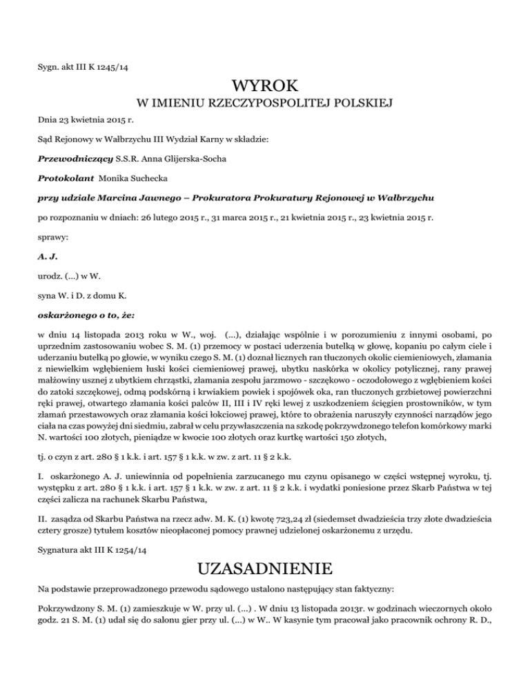 Sygn. akt III K 1245/14 WYROK W IMIENIU RZECZYPOSPOLITEJ POLSKIEJ Dnia 23 kwietnia 2015 r. Sąd Rejonowy w Wałbrzychu III Wydział Karny w składzie: Przewodniczący S.S.R. Anna Glijerska-Socha Protokolant Monika Suchecka przy udziale Marcina Jawnego – Prokuratora Prokuratury Rejonowej w Wałbrzychu po rozpoznaniu w dniach: 26 lutego 2015 r., 31 marca 2015 r., 21 kwietnia 2015 r., 23 kwietnia 2015 r. sprawy: A. J. urodz. (...) w W. syna W. i D. z domu K. oskarżonego o to, że: w dniu 14 listopada 2013 roku w W., woj. (...), działając wspólnie i w porozumieniu z innymi osobami, po uprzednim zastosowaniu wobec S. M. (1) przemocy w postaci uderzenia butelką w głowę, kopaniu po całym ciele i uderzaniu butelką po głowie, w wyniku czego S. M. (1) doznał licznych ran tłuczonych okolic ciemieniowych, złamania z niewielkim wgłębieniem łuski kości ciemieniowej prawej, ubytku naskórka w okolicy potylicznej, rany prawej małżowiny usznej z ubytkiem chrząstki, złamania zespołu jarzmowo - szczękowo - oczodołowego z wgłębieniem kości do zatoki szczękowej, odmą podskórną i krwiakiem powiek i spojówek oka, ran tłuczonych grzbietowej powierzchni ręki prawej, otwartego złamania kości palców II, III i IV ręki lewej z uszkodzeniem ścięgien prostowników, w tym złamań przestawowych oraz złamania kości łokciowej prawej, które to obrażenia naruszyły czynności narządów jego ciała na czas powyżej dni siedmiu, zabrał w celu przywłaszczenia na szkodę pokrzywdzonego telefon komórkowy marki N. wartości 100 złotych, pieniądze w kwocie 100 złotych oraz kurtkę wartości 150 złotych, tj. o czyn z art. 280 § 1 k.k. i art. 157 § 1 k.k. w zw. z art. 11 § 2 k.k. I. oskarżonego A. J. uniewinnia od popełnienia zarzucanego mu czynu opisanego w części wstępnej wyroku, tj. występku z art. 280 § 1 k.k. i art. 157 § 1 k.k. w zw. z art. 11 § 2 k.k. i wydatki poniesione przez Skarb Państwa w tej części zalicza na rachunek Skarbu Państwa, II. zasądza od Skarbu Państwa na rzecz adw. M. K. (1) kwotę 723,24 zł (siedemset dwadzieścia trzy złote dwadzieścia cztery grosze) tytułem kosztów nieopłaconej pomocy prawnej udzielonej oskarżonemu z urzędu. Sygnatura akt III K 1254/14 UZASADNIENIE Na podstawie przeprowadzonego przewodu sądowego ustalono następujący stan faktyczny: Pokrzywdzony S. M. (1) zamieszkuje w W. przy ul. (...) . W dniu 13 listopada 2013r. w godzinach wieczornych około godz. 21 S. M. (1) udał się do salonu gier przy ul. (...) w W.. W kasynie tym pracował jako pracownik ochrony R. D., który znał pokrzywdzonego z widzenia jako stałego klienta kasyna. Około godz. 1.00 do kasyna wszedł oskarżony A. J., którego R. D. także znał z widzenia, jako , że oskarżony także bywał w tym lokalu. Oskarżony wszedł do kasyna wraz z dwoma nieustalonymi mężczyznami. Jednego z nich o imieniu K. oskarżony znał z widzenia. Oskarżony A. J. tego dnia wieczorem spotkał K. oraz innego nieustalonego mężczyznę na ulicy (...) w W. i wraz z nimi udał się do kasyna. Oskarżony A. J. ubrany był w ciemną bluzę z kapturem , drugi z mężczyzn był średniego wzrostu ubrany był w ciemną skórzaną kurkę a jego zachowanie wskazywało, że znajduje się w stanie upojenia alkoholowego. Trzeci z mężczyzn był wysoki o barczystej sylwetce ubrany w kurtkę koloru biało -niebieskiego z charakterystyczną fryzurą o wygolonych bokach i postawionych włosach. Oskarżony A. J. grał na automacie około pół godziny dopóki nie skończyły mu się pieniądze. W tym czasie pokrzywdzony S. M. (1) także grał. Mężczyzna z charakterystyczną fryzurą zaglądał do pokrzywdzonego i pytał go czy dużo wygrał, podchodził także do ochroniarza i prowokował go szukając zaczepki. Oskarżony A. J. go uspokajał. Drugi z mężczyzn stał z boku i chwiał się. Oskarżony wraz z dwoma nieustalonymi mężczyznami pili wódkę zapakowaną w papierową torebkę . Oskarżony siedział przy maszynie obok pokrzywdzonego i pytał go „czy maszyna daje czy nie daje”. Przed godziną 3.00 nad ranem pokrzywdzony S. M. (1) opuścił salon gier i udał się w kierunku miejsca zamieszkania. W tym czasie mężczyzna z charakterystyczną fryzurą cały czas zaczepiał ochroniarza. Po opuszczeniu lokalu przez pokrzywdzonego oskarżony wraz z pozostałymi mężczyznami także wyszedł z salonu gier . Dowód: zeznania świadka R. D./k- 16-18, 314, 527-528, 960/ zeznania świadka S. M. (1) /k- 6-7, 56-57, 302, 525-526, 928/ wyjaśnienia oskarżonego A. J. /k- 41-42, 67-68, 523-524, 528 ,926-927/ W pobliżu salonu gier przy ul. (...) usytuowany jest market (...), gdzie zamontowana jest kamera monitoringu. O godz. 2.13 w oku tej kamery pojawiły się dwie postacie idące ulicą (...) w kierunku ul. (...) jedna z nich ubrana na ciemno , druga w ciemnych spodniach i jasnej kurtce . O czasie 2.37 w oku kamery widoczne są idące od strony ul. (...) w kierunku ulicy (...) dwie osoby, które odpowiadają wyglądem osobom poruszającym się wcześniej w przeciwnym kierunku. O czasie 2.58.21 widoczna jest w oku kamery osoba poruszająca się od lewej do prawej strony idąca po przeciwnej stronie marketu (...) ubrana w jasną kurtkę , ciemne spodnie i jasne buty. Na pasku kamery o czasie 2.59.20 na chodniku przy markecie (...) idą dwie osoby, jedna z nich ubrana na ciemno, druga ubrana w ciemną górę i jaśniejsze spodnie. O czasie 2.59.37 od lewej do prawej strony widoczne jest poruszająca się chodnikiem postać ubrana w jasne spodniach i kurtce o dolnej części ciemniejszej niż u góry . O czasie 3.04.38 w prawej części kadru pojawiają się dwie osoby idące szybkim krokiem , jedna z nich niesie jasny przedmiot . O godz. 3.05.05 widoczna jest w oku kamery idąca od prawej do lewej strony postać ubrana w jasne spodnie i dwukolorowa odzież górną. Jakość monitoringu nie pozwala na rozpoznanie twarzy a jedynie wskazuje na postaci i odcień ich ubrań. Dow