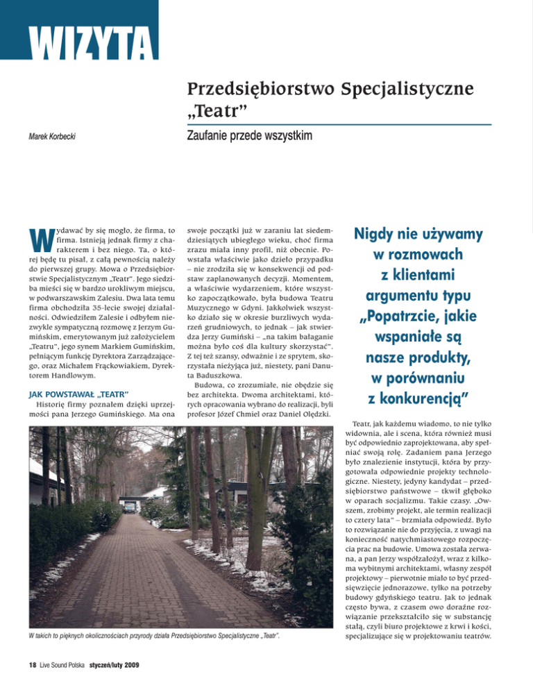 WIZYTA Przedsiębiorstwo Specjalistyczne „Teatr” Marek Korbecki Zaufanie przede wszystkim ydawać by się mogło, że firma, to firma. Istnieją jednak firmy z charakterem i bez niego. Ta, o której będę tu pisał, z całą pewnością należy do pierwszej grupy. Mowa o Przedsiębiorstwie Specjalistycznym „Teatr”. Jego siedziba mieści się w bardzo urokliwym miejscu, w podwarszawskim Zalesiu. Dwa lata temu firma obchodziła 35-lecie swojej działalności. Odwiedziłem Zalesie i odbyłem niezwykle sympatyczną rozmowę z Jerzym Gumińskim, emerytowanym już założycielem „Teatru”, jego synem Markiem Gumińskim, pełniącym funkcję Dyrektora Zarządzającego, oraz Michałem Frąckowiakiem, Dyrektorem Handlowym. swoje początki już w zaraniu lat siedemdziesiątych ubiegłego wieku, choć firma zrazu miała inny profil, niż obecnie. Powstała właściwie jako dzieło przypadku – nie zrodziła się w konsekwencji od podstaw zaplanowanych decyzji. Momentem, a właściwie wydarzeniem, które wszystko zapoczątkowało, była budowa Teatru Muzycznego w Gdyni. Jakkolwiek wszystko działo się w okresie burzliwych wydarzeń grudniowych, to jednak – jak stwierdza Jerzy Gumiński – „na takim bałaganie można było coś dla kultury skorzystać”. Z tej też szansy, odważnie i ze sprytem, skorzystała nieżyjąca już, niestety, pani Danuta Baduszkowa. Budowa, co zrozumiałe, nie obędzie się bez architekta. Dwoma architektami, których opracowania wybrano do realizacji, byli profesor Józef Chmiel oraz Daniel Olędzki. W JAK POWSTAWAŁ „TEATR” Historię firmy poznałem dzięki uprzejmości pana Jerzego Gumińskiego. Ma ona W takich to pięknych okolicznościach przyrody działa Przedsiębiorstwo Specjalistyczne „Teatr”. 18 Live Sound Polska styczeń/luty 2009 Nigdy nie używamy w rozmowach z klientami argumentu typu „Popatrzcie, jakie wspaniałe są nasze produkty, w porównaniu z konkurencją” Teatr, jak każdemu wiadomo, to nie tylko widownia, ale i scena, która również musi być odpowiednio zaprojektowana, aby spełniać swoją rolę. Zadaniem pana Jerzego było znalezienie instytucji, która by przygotowała odpowiednie projekty technologiczne. Niestety, jedyny kandydat – przedsiębiorstwo państwowe – tkwił głęboko w oparach socjalizmu. Takie czasy. „Owszem, zrobimy projekt, ale termin realizacji to cztery lata” – brzmiała odpowiedź. Było to rozwiązanie nie do przyjęcia, z uwagi na konieczność natychmiastowego rozpoczęcia prac na budowie. Umowa została zerwana, a pan Jerzy współzałożył, wraz z kilkoma wybitnymi architektami, własny zespół projektowy – pierwotnie miało to być przedsięwzięcie jednorazowe, tylko na potrzeby budowy gdyńskiego teatru. Jak to jednak często bywa, z czasem owo doraźne rozwiązanie przekształciło się w substancję stałą, czyli biuro projektowe z krwi i kości, specjalizujące się w projektowaniu teatrów. Teatr zajął jedno z większych stanowisk na targach Music Media 2008 – bo też i miał co pokazać. Panu Jerzemu udało się zaprosić do współpracy najwybitniejszych podówczas architektów i specjalistów w zakresie technologii teatru. Po zrealizowaniu projektu w Gdyni, nastąpiły kolejne. Jednak z racji realiów polityczno-gospodarczo-ustrojowych biuro nie mogło funkcjonować jako inicjatywa prywatna. W związku z tym „przyklejało się” do różnorakich instytucji państwowych i spółdzielczych. W końcu, po kilku latach tej „tułaczki”, a jeszcze przed zmianą ustroju politycznego – ściślej rzecz biorąc w roku 1988 – biuro projektowe zostało sprywatyzowane. W ten właśnie sposób narodziło się Przedsiębiorstwo Projektowo-Realizacyjne „Teatr”. Tablica z tą właśnie nazwą po dziś dzień pozostaje wmurowana przy bramie wjazdowej na teren firmy. Warto też abyście wiedzieli, drodzy Czytelnicy, że pan Jerzy Gumiński jest autorem Książki autorstwa pana Jerzego Gumińskiego. dwóch niezwykle interesujących książek, poświęconych technologii teatru – „Przemijają lata, zostają teatry” oraz „Porozmawiajmy o technologii teatru”. Jakkolwiek nie każdego tematyka ta musi interesować, to jednak mając okazję do obcowania z tymi wydawnictwami, warto choćby je przejrzeć. Książki wydane są bardzo efektownie, na papierze dobrej jakości i zawierają mnóstwo zdjęć oraz pouczających schematów, czy rysunków. Obie można zamówić, co szczerze polecam, bezpośrednio u wydawcy. DZIEŃ DZISIEJSZY TEATRU O klasie firmy świadczy nie tylko długa lista zrealizowanych inwestycji, ale i bardzo obszerna lista dostawców – Antari, Ayrton, DTS, Eiki, Eurolite, Futurelight, Pathway, SGM, Spotlight, Strand Lighting, Swefog, Lycian, Vari*Lite i Wybron. Ale nie o to tu chodzi. Na dzień dzisiejszy Przedsiębiorstwo Specjalistyczne „Teatr” to jedna z najsolidniejszych firm działających w branży oświetleniowej. Piszę to nie bez kozery. Utwierdziła mnie w tym rozmowa z Markiem Gumińskim i Michałem Frąckowiakiem. Właściwie, trudno jest osadzić Teatr w ściśle ustalonym miejscu naszego skomercjalizowanego świata. Przede wszystkim z racji filozofii, jaką Teatr przyjął – nie sprzedaje swojego asortymentu każdemu. Może to brzmieć nieco dziwnie, ale tak właśnie jest. Nie chodzi o to, że Teatr kogokolwiek dyskryminuje, czy ma jakieś swoje widzimisię, ale wynika to z pewnej, czysto racjonalnej zasady. Choć w ofercie Teatru znaleźć można nie tylko sprzęt renomowanych marek, których jest autoryzowanym dystrybutorem, ale także WIZYTA (w znacznie mniejszym asortymencie) „galanterię” chińską, o zacięciu zdecydowanie dyskotekowym, rozchodzącą się szczególnie dobrze zwłaszcza pod koniec roku, to jednak firma nastawia się przede wszystkim na obsługę firm instalacyjnych oraz odbiorców hurtowych. Ale też nie wszystkich – głównie takich, którzy również w jakimś stopniu świadczą usługi związane 