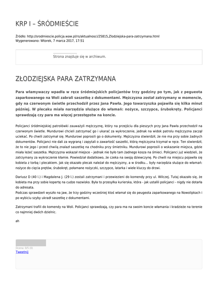 KRP I – ŚRÓDMIEŚCIE Źródło: http://srodmiescie.policja.waw.pl/rs/aktualnosci/25815,Zlodziejska-para-zatrzymana.html Wygenerowano: Wtorek, 7 marca 2017, 17:51 Strona znajduje się w archiwum. ZŁODZIEJSKA PARA ZATRZYMANA Para włamywaczy wpadła w ręce śródmiejskich policjantów trzy godziny po tym, jak z pegueota zaparkowanego na Woli zabrali saszetkę z dokumentami. Mężczyzna został zatrzymany w momencie, gdy na czerwonym świetle przechodził przez Jana Pawła. Jego towarzyszka pojawiła się kilka minut później. W plecaku miała narzędzia służące do włamań: nożyce, szczypce, śrubokręty. Policjanci sprawdzają czy para ma więcej przestępstw na koncie. Policjanci śródmiejskiej patrolówki zauważyli mężczyznę, który na przejściu dla pieszych przy Jana Pawła przechodził na czerwonym świetle. Mundurowi chcieli zatrzymać go i ukarać za wykroczenie, jednak na widok patrolu mężczyzna zaczął uciekać. Po chwili zatrzymał się. Mundurowi poprosili go o dokumenty. Mężczyzna stwierdził, że nie ma przy sobie żadnych dokumentów. Policjanci nie dali za wygraną i zapytali o zawartość saszetki, którą mężczyzna trzymał w ręce. Ten stwierdził, że to nie jego i przed chwilą znalazł saszetkę na chodniku przy śmietniku. Mundurowi poprosili o wskazanie miejsca, gdzie miała leżeć saszetka. Mężczyzna wskazał miejsce – jednak nie było tam żadnego kosza na śmieci. Policjanci już wiedzieli, że zatrzymany za wykroczenie kłamie. Powiedział dodatkowo, że czeka na swoją dziewczynę. Po chwili na miejscu pojawiła się kobieta z torbą i plecakiem. Jak się okazało plecak należał do mężczyzny, a w środku… były narzędzia służące do włamań: nożyce do cięcia prętów, śrubokręt, połamane nożyczki, szczypce, latarka i wiele kluczy do drzwi. Dariusz D (40 l.) i Magdalena J. (29 l.) zostali zatrzymani i przewiezieni do komendy przy ul. Wilczej. Tutaj okazało się, że kobieta ma przy sobie kopertę na cudze nazwisko. Była to przesyłka kurierska, która - jak ustalili policjanci - nigdy nie dotarła do adresata. Podczas sprawdzeń wyszło na jaw, że trzy godziny wcześniej ktoś włamał się do peugeota zaparkowanego na Nowolipkach i po wybiciu szyby ukradł saszetkę z dokumentami. Zatrzymani trafili do komendy na Woli. Policjanci sprawdzają, czy para ma na swoim koncie włamania i kradzieże na terenie co najmniej dwóch dzielnic. ah Ocena: 0/5 (0) Tweetnij