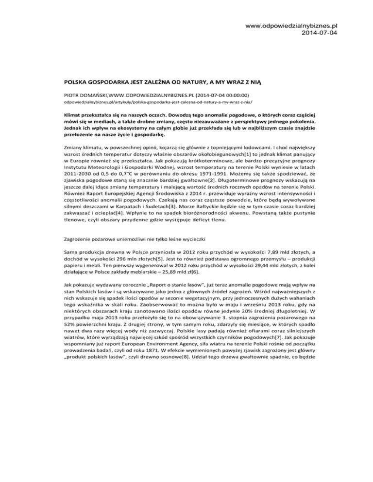 www.odpowiedzialnybiznes.pl 2014-07-04 POLSKA GOSPODARKA JEST ZALEŻNA OD NATURY, A MY WRAZ Z NIĄ PIOTR DOMAŃSKI,WWW.ODPOWIEDZIALNYBIZNES.PL (2014-07-04 00:00:00) odpowiedzialnybiznes.pl/artykuly/polska-gospodarka-jest-zalezna-od-natury-a-my-wraz-z-nia/ Klimat przekształca się na naszych oczach. Dowodzą tego anomalie pogodowe, o których coraz częściej mówi się w mediach, a także drobne zmiany, często niezauważane z perspektywy jednego pokolenia. Jednak ich wpływ na ekosystemy na całym globie już przekłada się lub w najbliższym czasie znajdzie przełożenie na nasze życie i gospodarkę. Zmiany klimatu, w powszechnej opinii, kojarzą się głównie z topniejącymi lodowcami. I choć największy wzrost średnich temperatur dotyczy właśnie obszarów okołobiegunowych[1] to jednak klimat panujący w Europie również się przekształca. Jak pokazują krótkoterminowe, ale bardzo precyzyjne prognozy Instytutu Meteorologii i Gospodarki Wodnej, wzrost temperatury na terenie Polski wyniesie w latach 2011-2030 od 0,5 do 0,7°C w porównaniu do okresu 1971-1991. Możemy się także spodziewać, że zjawiska pogodowe staną się znacznie bardziej gwałtowne[2]. Długoterminowe prognozy wskazują na jeszcze dalej idące zmiany temperatury i malejącą wartość średnich rocznych opadów na terenie Polski. Również Raport Europejskiej Agencji Środowiska z 2014 r. przewiduje wyraźny wzrost intensywności i częstotliwości anomalii pogodowych. Czekają nas coraz częstsze powodzie, które będą wywoływane silnymi deszczami w Karpatach i Sudetach[3]. Morze Bałtyckie będzie się w tym czasie coraz bardziej zakwaszać i ocieplać[4]. Wpłynie to na spadek bioróżnorodności akwenu. Powstaną także pustynie tlenowe, czyli obszary przydenne gdzie występuje deficyt tlenu. Zagrożenie pożarowe uniemożliwi nie tylko leśne wycieczki Sama produkcja drewna w Polsce przyniosła w 2012 roku przychód w wysokości 7,89 mld złotych, a dochód w wysokości 296 mln złotych[5]. Jest to również podstawa ogromnego przemysłu – produkcji papieru i mebli. Ten pierwszy wygenerował w 2012 roku przychód w wysokości 29,44 mld złotych, z kolei działające w Polsce zakłady meblarskie – 25,89 mld zł[6]. Jak pokazuje wydawany corocznie „Raport o stanie lasów”, już teraz anomalie pogodowe mają wpływ na stan Polskich lasów i są wskazywane jako jedno z głównych źródeł zagrożeń. Wśród najważniejszych z nich wskazuje się spadek ilości opadów w sezonie wegetacyjnym, przy jednoczesnych dużych wahaniach tego wskaźnika w skali roku. Zaobserwować to można było w maju i wrześniu 2013 roku, gdy na niektórych obszarach kraju zanotowano ilości opadów równe jedynie 20% średniej długoletniej. W przypadku maja 2013 roku przełożyło się to na obowiązywanie 3. stopnia zagrożenia pożarowego na 52% powierzchni kraju. Z drugiej strony, w tym samym roku, zdarzyły się miesiące, w których spadło nawet dwa razy więcej wody niż zazwyczaj. Polskie lasy padają również ofiarami coraz silniejszych wiatrów, które wyrządzają najwięcej szkód spośród wszystkich czynników pogodowych[7]. Jak pokazuje wspomniany już raport European Environment Agency, siła wiatru na terenie Polski rośnie od początku prowadzenia badań, czyli od roku 1871. W efekcie wymienionych powyżej zjawisk zagrożony jest główny „produkt polskich lasów”, czyli drewno sosnowe[8]. Udział tego drzewa gwałtownie spadnie, co będzie www.odpowiedzialnybiznes.pl 2014-07-04 wynikiem coraz mniej korzystnych warunków klimatycznych i wyparcia go przez bardziej ciepłolubne gatunki liściaste[9]. Nie możemy jednak liczyć na to, że drzewa liściaste będą bujnie rozwijały się na terenach wcześniej zajętych przez gatunki iglaste. Mają one bowiem dużo większe wymagania glebowe niż sosny, wobec czego nie będą radziły sobie tak dobrze na niskiej jakości glebach bielicowych, które stanowią podłoże w większości polskich lasów. Moskitiera koniecznością Komar jest dla nas obecnie jedynie dokuczliwym towarzyszem letnich wyjazdów nad jeziora. Działania mające ograniczyć rozmnażanie tych insektów podejmowane są głównie w dużych miastach. W najbliższej przyszłości może się jednak okazać, że niezbędne dla utrzymania zdrowia publicznego staną się masowe akcje odkomarzania. Już w tym momencie pojawiły się w Polsce, na razie jednostkowe, przypadki zakażenia jednym z gatunków tropikalnego nicienia – wśród osób, które nie podróżowały do krajów gdzie tradycyjnie występuje. Jest on przenoszony właśnie przez komary, lecz co bardzo istotne, do tej pory larwy nicieni nie miały szans przekształcić się w ciałach owadów w formy dorosłe. Jednak występujące coraz częściej okresy wysokiej temperatury, porównywalnej do tej w tropikach, stwarzają już taką możliwość[10]. Szybciej niż masowe zakażenia nicieniami, czy też malaria, mogą dotrzeć do nas choroby przenoszone przez Azjatyckiego Komara Tygrysiego. Jest to gatunek inwazyjny odpowiedzialny za roznoszenie szeregu chorób między innymi Gorączki Zachodniego Nilu. Jego zasięg występowania z roku na rok powiększa się. Dzieje się tak głównie dlatego, że za sprawą zmian klimatu, coraz większa część Europy PołudniowoZachodniej posiada warunki umożliwiające temu gatunkowi przeżycie i rozmnażanie[11]. Zagrożenia, jakie niosą zmiany klimatu w tym zakresie, mogą mieć duży wpływ na podniesienie kosztów opieki zdrowotnej. Nie tylko pojawi się potrzeba szkolenia lekarzy w zakresie nowych zagrożeń. Konieczne będą też częstsze opryski i sprowadzenie leków wcześniej potrzebnych w Polsce jedynie w małych ilościach. Ile polskie rolnictwo straci na zmianach klimatu? Podobnie jak w przypadku lasów, również na uprawę zbóż mocno wpływa zmieniający się klimat, co może mieć przełożenie na resztę gospodarki. Polskie rolnictwo nie wydaje się znaczącym j