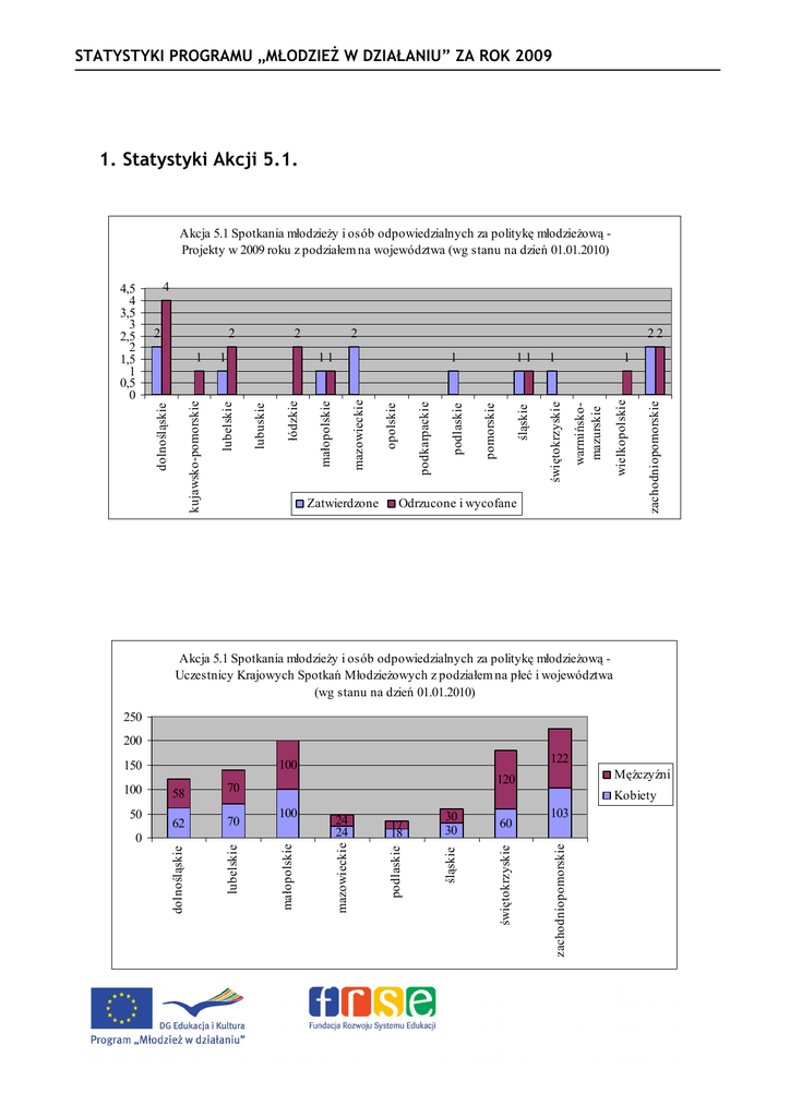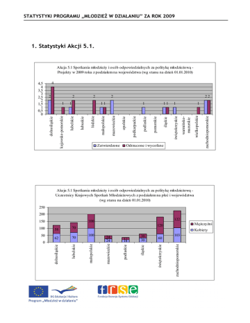 STATYSTYKI PROGRAMU „MŁODZIEś W DZIAŁANIU” ZA ROK 2009 1. Statystyki Akcji 5.1. Akcja 5.1 Spotkania młodzieŜy i osób odpowiedzialnych za politykę młodzieŜową Projekty w 2009 roku z podziałem na województwa (wg stanu na dzień 01.01.2010) 4 2 22 Odrzucone i wycofane wielkopolskie 1 warmińskomazurskie 1 świętokrzyskie śląskie pomorskie opolskie 11 zachodniopomorskie Zatwierdzone podkarpackie 1 mazowieckie łódzkie 11 lubuskie 1 lubelskie kujawsko-pomorskie 1 2 podlaskie 2 małopolskie 2 dolnośląskie 4,5 4 3,5 3 2,5 2 1,5 1 0,5 0 Akcja 5.1 Spotkania młodzieŜy i osób odpowiedzialnych za politykę młodzieŜową Uczestnicy Krajowych Spotkań MłodzieŜowych z podziałem na płeć i województwa (wg stanu na dzień 01.01.2010) 250 200 30 30 60 103 zachodniopomorskie 17 18 świętokrzyskie 24 24 śląskie 100 podlaskie 0 Kobiety mazowieckie 70 MęŜczyźni 120 małopolskie 62 lubelskie 50 58 70 dolnośląskie 100 122 100 150 STATYSTYKI PROGRAMU „MŁODZIEś W DZIAŁANIU” ZA ROK 2009 Akcja 5.1 Spotkania młodzieŜy i osób odpowiedzialnych za politykę młodzieŜową Uczestnicy Krajowych Spotkań MłodzieŜowych z podziałem na wiek i województwa (wg stanu na dzień 01.01.2010) 250 200 113 0 35 0 15-17 lat 100 50 zachodniopomorskie małopolskie 21 27 0 15 30 15 świętokrzyskie 115 34 lubelskie 26-30 lat 18-25 lat śląskie 100 dolnośląskie 0 45 85 80 50 85 podlaskie 6 0 40 mazowieckie 150 100 12 0