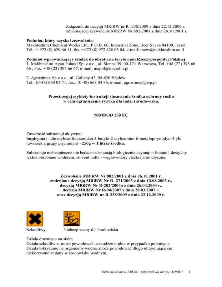 Załącznik do decyzji MRiRW nr R- 238/2009 z dnia 22.12.2009 r. zmieniającej zezwolenie MRiRW Nr 882/2001 z dnia 26.10.2001 r. Podmiot, który uzyskał zezwolenie: Makhteshim Chemical Works Ltd., P.O.B. 60, Industrial Zone, Beer Sheva 84100, Izrael. Tel.: + 972 (8) 629 66 11, fax.:+972 (8) 972 628 03 04, e-mail: [email protected] Podmiot wprowadzający środek do obrotu na terytorium Rzeczypospolitej Polskiej: 1. Makhteshim Agan Poland Sp. z o.o., ul. Sienna 39, 00-121 Warszawa, Tel. +48 (22) 395 66 66 , Fax. +48 (22) 395 66 67, e-mail: [email protected] 2. Agrosimex Sp.z o.o., ul. Goliany 43, 05-620 Błędów Tel.: (0-48) 668 04 71, fax.: (0-48) 668 04 86, e-mail: [email protected] Przestrzegaj etykiety-instrukcji stosowania środka ochrony roślin w celu ograniczenia ryzyka dla ludzi i środowiska. NIMROD 250 EC Zawartość substancji aktywnej: bupirymat - dimetylosulfonoamidan 5-butylo-2-etyloamino-6-metylopirymidyn-4-ylu (związek z grupy pirymidyn) - 250g w 1 litrze środka. Substancje niebezpieczne nie będące substancją biologicznie czynną: n-butanol, destylaty lekkie obrabiane wodorem, solvent nafta - węglowodory ciężkie aromatyczne, Zezwolenie MRiRW Nr 882/2001 z dnia 26.10.2001 r. zmienione decyzją MRiRW Nr R- 271/2003 z dnia 12.08.2003 r., decyzją MRiRW Nr R-202/2004o z dnia 26.04.2004 r., decyzją MRiRW Nr R-94/2007 z dnia 28.03.2007 r. oraz decyzją MRiRW nr R-238/2009 z dnia 22.12.2009 r. Szkodliwy Niebezpieczny dla środowiska Działa drażniąco na skórę. Działa szkodliwie, może powodować uszkodzenia płuc w przypadku połknięcia. Działa toksycznie na organizmy wodne, może powodować długo utrzymujące się niekorzystne zmiany w środowisku wodnym. Etykieta Nimrod 250 EC, załącznik do decyzji MRiRW 1 Uwaga! 1. Zabrania się stosowania środka w strefie bezpośredniej ochrony ujęć wody oraz na terenie uzdrowisk, otulin parków narodowych i rezerwatów. 2. Nie zanieczyszczać wód środkiem ochrony roślin lub jego opakowaniem. I. OPIS DZIAŁANIA Środek grzybobójczy w formie koncentratu do sporządzania emulsji wodnej o działaniu układowym do stosowania zapobiegawczego i wyniszczającego w ochronie roślin sadowniczych, warzywnych, ozdobnych i leśnych przed mączniakami prawdziwymi. II. ZAKRES STOSOWANIA, TERMINY I DAWKI. 1. ROŚLINY SADOWNICZE. A) JABŁOŃ -mączniak prawdziwy. Zalecana dawka: 0,7-1,4 l/ha. Wyższą z zalecanych dawek stosować w warunkach dużego nasilenia choroby. Zalecana ilość wody: 500-750 l/ha. Pierwszy zabieg wykonać na początku fazy kwitnienia, dalsze zabiegi wykonywać po kwitnieniu co 7-14 dni w zależności od stopnia nasilenia mączniaka prawdziwego. Uwaga: Nimrod 250 EC wykazuje dobrą skuteczność w temperaturze ok. 10ºC. B) AGREST, PORZECZKA -mączniak amerykański agrestu. Środek stosować: -zapobiegawczo - 0,75-1,5 l/ha -wyniszczająco - 1,5-2,25 l/ha. Wyższe z zalecanych dawek stosować w warunkach dużego nasilenia choroby. Zalecana ilość wody: 500-900 l/ha. Opryskiwać: * zapobiegawczo: na plantacjach porzeczki wykonać jeden zabieg po kwitnieniu, a na plantacjach agrestu przed kwitnieniem. * wyniszczająco: opryskiwać plantacje porzeczki i agrestu 2 krotnie co 7-10 dni po wystąpieniu pierwszych objawów choroby. C) TRUSKAWKA -mączniak prawdziwy. Zalecana dawka: 1,5-2,5 l/ha. Wyższą z zalecanych dawek stosować przy dużym nasileniu choroby. Zalecana ilość wody: 500-700 l/ha. Używając belki typu "Fragaria III" lub opryskiwaczy wentylatorowych do upraw rzędowych. Etykieta Nimrod 250 EC, załącznik do decyzji MRiRW 2 Środek stosować z chwilą wystąpienia pierwszych objawów choroby, w razie potrzeby zabieg powtórzyć po 10-14 dniach. 2. ROŚLINY WARZYWNE. A) POMIDOR (POD OSŁONAMI) -mączniak prawdziwy. Zalecane stężenie: 0,05 % (50 ml środka w 100 litrach wody). Zalecana ilość cieczy użytkowej: 120 l/1000m2. Wykonać 1-2 zabiegi w sezonie wegetacyjnym co 7 dni. Pierwszy zabieg wykonać z chwilą wystąpienia pierwszych objawów choroby. B) OGÓREK (POD OSŁONAMI) -mączniak prawdziwy. Zalecane stężenie: 0,05 % (50 ml środka w 100 litrach wody). Zalecana ilość cieczy użytkowej: 120-150 l/1000 m2. Wykonać 1-2 zabiegi w sezonie wegetacyjnym co 7 dni. Pierwszy zabieg wykonać z chwilą wystąpienia pierwszych objawów choroby. C) MARCHEW, PIETRUSZKA -mączniak prawdziwy. Zalecana dawka: 0,4 l/ha. Zalecana ilość wody: 700 l/ha. Wykonać 1-2 zabiegi w sezonie wegetacyjnym co 7 dni. Pierwszy zabieg wykonać z chwilą wystąpienia pierwszych objawów choroby. 3. ROŚLINY OZDOBNE (W GRUNCIE I POD OSŁONAMI) -mączniak prawdziwy. Zalecane stężenie: 0,1-0,25 % (100-250 ml środka w 100 litrach wody). Niższe stężenie środka stosować zapobiegawczo , wyższe wyniszczająco. Zalecana ilość cieczy użytkowej: 500-900 l/ha. Ilość cieczy użytkowej dostosować do wielkości i gęstości nasadzeń. 4. SZKÓŁKI LEŚNE -mączniak prawdziwy dębu. Zalecane stężenie: 0,1 % (100 ml środka w 100 l wody). Zalecana ilość cieczy użytkowej: 500 l/ha. UWAGI: 1. Przed zastosowaniem środka na rośliny ozdobne wykonać na każdej uprawianej odmianie próbny zabieg w celu sprawdzenia, czy w ciągu 7 dni nie wystąpiły objawy uszkodzenia roślin. 2. Środek stosować przemiennie z fungicydami należącymi do innych grup chemicznych. III. OKRES KARENCJI okres od dnia ostatniego zabiegu do dnia zbioru przeznaczenia do konsumpcji: jabłka, agrest, porzeczka, truskawka- 14 dni, pomidor, ogórek - 3 dni, marchew, pietruszka - 3 dni. Etykieta Nimrod 250 EC, załącznik do decyzji MRiRW 3 IV. OKRES PREWENCJI DLA PSZCZÓŁ, LUDZI I ZWIERZĄT okres zapobiegający zatruciu: NIE DOTYCZY. V. SPORZĄDZANIE CIECZY UŻYTKOWEJ Przed przystąpieniem do sporządzania cieczy użytkowej dokładnie ustalić potrzebną jej ilość. Odmierzoną ilość środka wlać do zbiornika opryskiwacza napełnionego częściowo wodą (z włączonym mieszadłem) i uzupełnić wodą do potrzebnej ilości. Opryskiwać z w