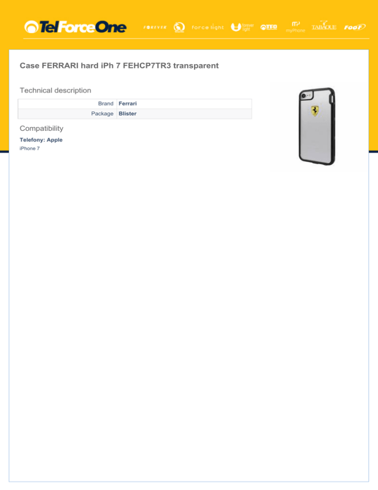 Case FERRARI hard iPh 7 FEHCP7TR3 transparent Technical description Brand Ferrari Package Blister Compatibility Telefony: Apple iPhone 7