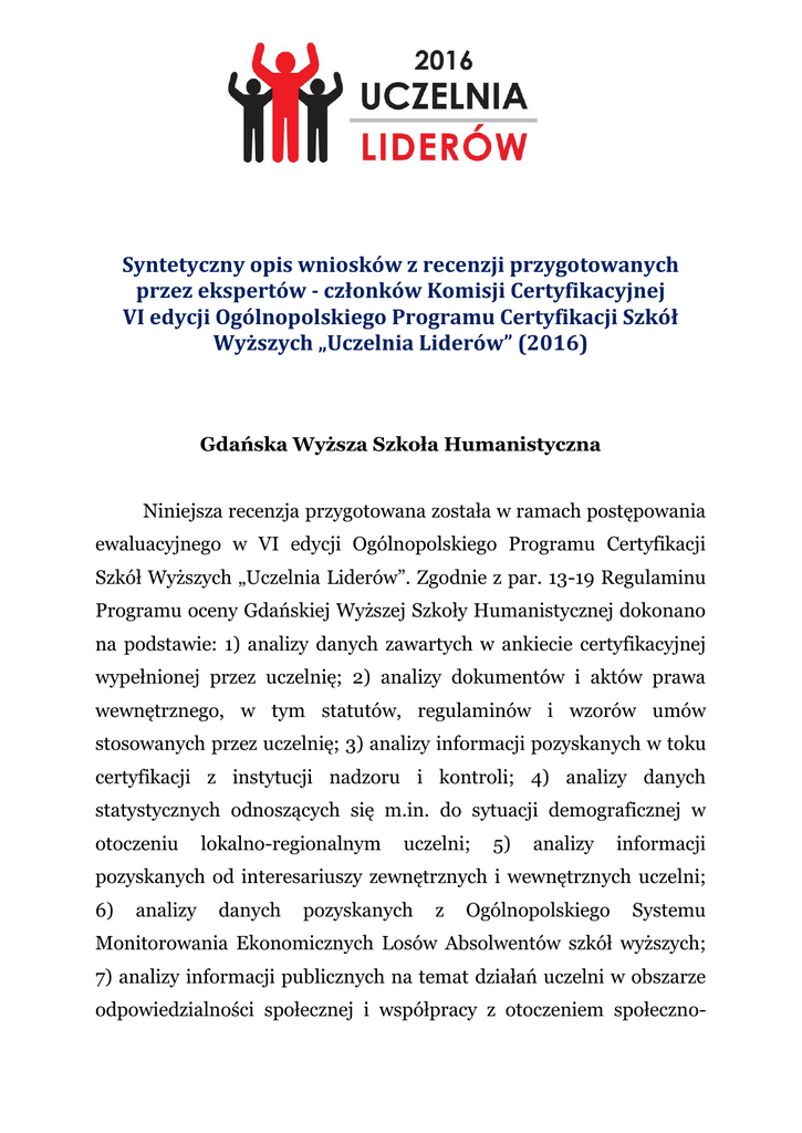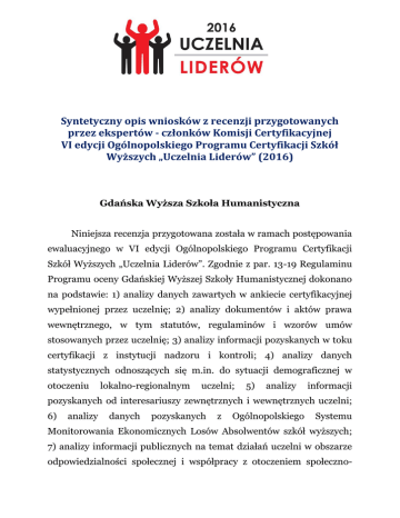 Syntetyczny opis wniosków z recenzji przygotowanych przez ekspertów - członków Komisji Certyfikacyjnej VI edycji Ogólnopolskiego Programu Certyfikacji Szkół Wyższych „Uczelnia Liderów” (2016) Gdańska Wyższa Szkoła Humanistyczna Niniejsza recenzja przygotowana została w ramach postępowania ewaluacyjnego w VI edycji Ogólnopolskiego Programu Certyfikacji Szkół Wyższych „Uczelnia Liderów”. Zgodnie z par. 13-19 Regulaminu Programu oceny Gdańskiej Wyższej Szkoły Humanistycznej dokonano na podstawie: 1) analizy danych zawartych w ankiecie certyfikacyjnej wypełnionej przez uczelnię; 2) analizy dokumentów i aktów prawa wewnętrznego, w tym statutów, regulaminów i wzorów umów stosowanych przez uczelnię; 3) analizy informacji pozyskanych w toku certyfikacji z instytucji nadzoru i kontroli; 4) analizy danych statystycznych odnoszących się m.in. do sytuacji demograficznej w otoczeniu lokalno-regionalnym uczelni; 5) analizy informacji pozyskanych od interesariuszy zewnętrznych i wewnętrznych uczelni; 6) analizy danych pozyskanych z Ogólnopolskiego Systemu Monitorowania Ekonomicznych Losów Absolwentów szkół wyższych; 7) analizy informacji publicznych na temat działań uczelni w obszarze odpowiedzialności społecznej i współpracy z otoczeniem społeczno- gospodarczym; 8) analizy danych z systemów informacyjnych, takich jak POL-ON, OPI, wybierzstudia.nauka.gov.pl. Oceny uczelni dokonało niezależnie od siebie 2 recenzentów – członków Komisji Certyfikacyjnej. Gdańska Wyższa Szkoła Humanistyczna to niepubliczna uczelnia magisterska, funkcjonująca na pomorskim rynku edukacyjnym od 1999 roku. W rejestrze uczelni niepublicznych i związków uczelni niepublicznych figuruje pod numerem 142. W skład struktury organizacyjnej uczelni wchodzi Wydział Nauk Społecznych oraz pozostałe komórki, w tym m.in. Studium Kształcenia Podyplomowego i Nauczycieli, Studium Nauczania Języków Obcych, Studium Wychowania Fizycznego, Pracownia Informatyki, Biblioteka Główna, Pracownia Praktyk Studenckich, Biuro Karier, Centrum InformacyjnoWydawnicze, Biuro Promocji i Archiwum. Certyfikowany podmiot prowadzi kształcenie na następujących kierunkach studiów dyplomowych: administracja, pedagogika oraz zarządzanie oraz na 42 kierunkach studiów podyplomowych. Obecnie w murach Gdańskiej Wyższej Szkoły Humanistycznej studiuje łącznie ponad 1,2 tys. studentów, w tym troje z zagranicy (rok akademicki 2015/2016 rozpoczęło ok. 400 żaków). Funkcję Rektora pełni prof. zw. dr hab. Zbigniew Machaliński, natomiast Kanclerza mgr Wiktor Usik. Polityka rozwoju Gdańskiej Wyższej Szkoły Humanistycznej realizowana jest w sposób spójny, kompleksowy i zgodny z potrzebami interesariuszy Szkoły, tak wewnętrznych, jak i zewnętrznych. Szeroko zakreślony katalog celów strategicznych, operacyjnych i bieżących uczelni jest systematycznie realizowany, z wykorzystaniem właściwe dobranych i efektywnych instrumentów zarządzania, w tym zwłaszcza zarządzania jakością kształcenia, zarządzania kapitałem intelektualnym oraz zarządzania zasobami ludzkimi. Uczelnia wypracowała trwałą zdolność szybkiego reagowania na potrzeby studentów i pracodawców oraz zmiany w otoczeniu, jak również zdolność wprowadzania innowacji (tak w zakresie merytorycznej „zawartości” programów nauczania, jak i organizacji dydaktyki), stanowiących warunek konieczny osiągania ambitnych celów rozwojowych przy założeniu, że rynek i satysfakcja studentów (absolwentów) stanowią zasadnicze kryterium ich efektywności. GWSH inwestuje w nowatorskie rozwiązania technologiczne i infrastrukturalne wpływające na jakość kształcenia i wzmacnianie praktycznego wymiaru edukacji, stosuje zaawansowane narzędzia z obszaru human resources, systematycznie poszerza dostępną ofertę edukacyjną (niewątpliwym atutem placówki jest szeroki wachlarz studiów podyplomowych), w tym ofertę nowatorskich, autorskich specjalności na studiach I i II stopnia (np. Biznes wielokulturowy, Trener personalny). Analizując działalność uczelni w okresie objętym recertyfikacją, Komisja podkreśla mnogość działań Gdańskiej Wyższej Szkoły Humanistycznej ukierunkowanych na umacnianie wizerunek i marki uczelni jako jednostki rzetelnej, profesjonalnej, oferującej kształcenie dyplomowe i podyplomowe na wysokim poziomie, liczącej się w gdańskim środowisku akademickim i wyznaczającej trendy edukacyjne w perspektywie średnio i długookresowej. Co bardzo istotne głos certyfikowanego podmiotu brany jest pod uwagę w debacie publicznej dotyczącej nie tylko rozwoju szkolnictwa wyższego Gdańska i Pomorza, ale także ogólnych celów rozwoju miasta i regionu, gdzie GWSH ma swój solidny i znaczący udział (m.in. poprzez oferowanie swojego know-how i zasobów intelektualnych w relacjach z instytucjami administracji publicznej czy w ramach organizowanych, otwartych debat i konferencji, jak np. sesja „Jak chronić wolną wolę w Internecie? Edukacja medialna i profilaktyka – sesja warsztatowoszkoleniowa”). Istotą funkcjonowania każdej uczelni wyższej jest partnerska i podmiotowa zarazem współpraca z otoczeniem społecznym, wynikająca ze wzajemnego zrozumienia swoich potrzeb, a przede wszystkim konieczności uwzględnienia elementów praktycznych w toku studiów. Wszakże szkoła wyższa nie może działać w próżni, a na jej funkcjonowanie ma wpływ wiele zewnętrznych czynników, które władze muszą uwzględniać w swojej codziennej działalności. W opinii Recenzentów gdańska Alma Mater w pełni odpowiada wymogom z tym związanym - w procesie organizacji toku studiów permanentnie uwzględnia potrzeby otoczenia, tworząc coraz to nowe kierunki, które mają zapełnić lukę wiedzową, umiejętnościową i kompetencyjną w wybranych segmentach rynku pracy. Warto wspomnieć, iż w latach 2015-2016 wdrożono kilkanaście nowych specjalności, np. w ramach kierunku peda