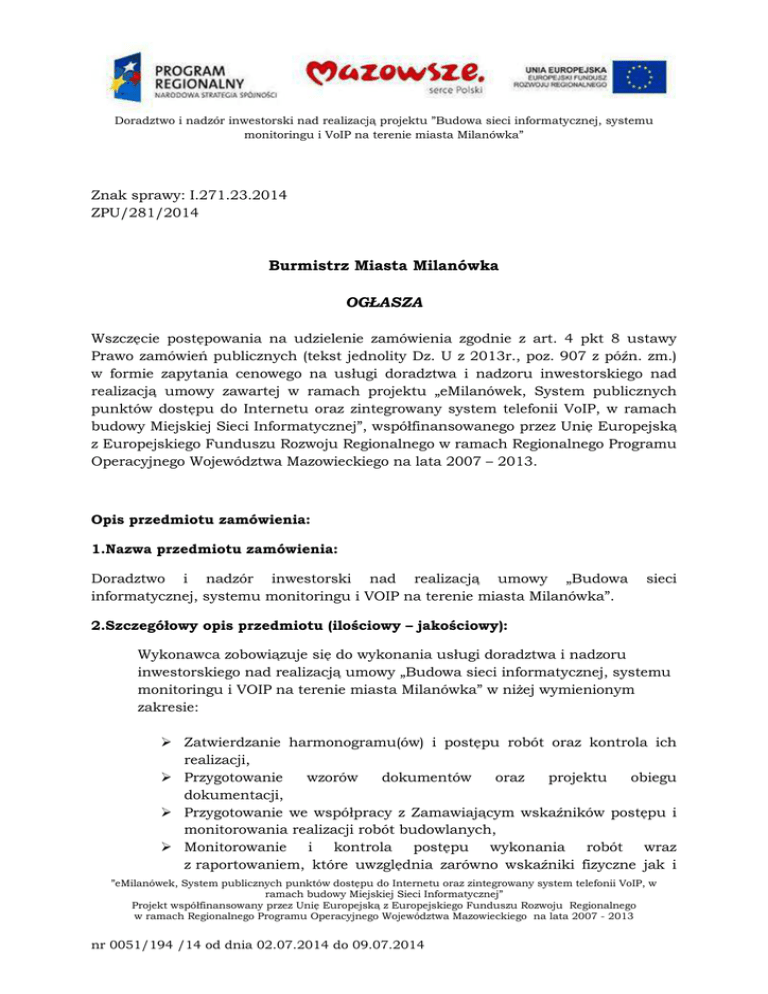 Doradztwo i nadzór inwestorski nad realizacją projektu ”Budowa sieci informatycznej, systemu monitoringu i VoIP na terenie miasta Milanówka” Znak sprawy: I.271.23.2014 ZPU/281/2014 Burmistrz Miasta Milanówka OGŁASZA Wszczęcie postępowania na udzielenie zamówienia zgodnie z art. 4 pkt 8 ustawy Prawo zamówień publicznych (tekst jednolity Dz. U z 2013r., poz. 907 z późn. zm.) w formie zapytania cenowego na usługi doradztwa i nadzoru inwestorskiego nad realizacją umowy zawartej w ramach projektu „eMilanówek, System publicznych punktów dostępu do Internetu oraz zintegrowany system telefonii VoIP, w ramach budowy Miejskiej Sieci Informatycznej”, współfinansowanego przez Unię Europejską z Europejskiego Funduszu Rozwoju Regionalnego w ramach Regionalnego Programu Operacyjnego Województwa Mazowieckiego na lata 2007 – 2013. Opis przedmiotu zamówienia: 1.Nazwa przedmiotu zamówienia: Doradztwo i nadzór inwestorski nad realizacją umowy „Budowa informatycznej, systemu monitoringu i VOIP na terenie miasta Milanówka”. sieci 2.Szczegółowy opis przedmiotu (ilościowy – jakościowy): Wykonawca zobowiązuje się do wykonania usługi doradztwa i nadzoru inwestorskiego nad realizacją umowy „Budowa sieci informatycznej, systemu monitoringu i VOIP na terenie miasta Milanówka” w niżej wymienionym zakresie: Zatwierdzanie harmonogramu(ów) i postępu robót oraz kontrola ich realizacji, Przygotowanie wzorów dokumentów oraz projektu obiegu dokumentacji, Przygotowanie we współpracy z Zamawiającym wskaźników postępu i monitorowania realizacji robót budowlanych, Monitorowanie i kontrola postępu wykonania robót wraz z raportowaniem, które uwzględnia zarówno wskaźniki fizyczne jak i ”eMilanówek, System publicznych punktów dostępu do Internetu oraz zintegrowany system telefonii VoIP, w ramach budowy Miejskiej Sieci Informatycznej” Projekt współfinansowany przez Unię Europejską z Europejskiego Funduszu Rozwoju Regionalnego w ramach Regionalnego Programu Operacyjnego Województwa Mazowieckiego na lata 2007 - 2013 nr 0051/194 /14 od dnia 02.07.2014 do 09.07.2014 Doradztwo i nadzór inwestorski nad realizacją projektu ”Budowa sieci informatycznej, systemu monitoringu i VoIP na terenie miasta Milanówka” finansowe, koszty, kontrolę budżetu i działania zapobiegawcze (jeśli będą konieczne), Ocenianie i rozstrzyganie wszelkich roszczeń lub dyskusji i problemów narastających podczas robót, zapobieganie sporom i opóźnieniom, jeżeli są możliwe do uniknięcia, Zatwierdzanie harmonogramu dostaw urządzeń i materiałów na plac budowy ze szczególnym uwzględnieniem ich kompletności, sposobu i czasu magazynowania oraz zgodności z projektem, Sprawdzanie i potwierdzanie czy „Wykonawca zadania inwestycyjnego” mobilizuje i dostarcza na budowę całe wyposażenie i dostawy zgodnie z umową, Weryfikacja i przeglądanie dokumentów „Wykonawcy zadania inwestycyjnego” (rysunków roboczych) zawierających zmiany, zatwierdzanie robót zamiennych, Zatwierdzanie materiałów budowlanych i instalacyjnych, urządzeń przeznaczonych do wbudowania, sprawdzanie dokumentów, zezwoleń, deklaracji zgodności, certyfikatów itd., w celu uniknięcia użycia materiałów uszkodzonych lub nie mających polskich certyfikatów, Zatwierdzanie proponowanych metod wykonywania robót budowlanych, włączając w to roboty tymczasowe zaproponowane przez „Wykonawcę zadania inwestycyjnego”, Bieżące weryfikowanie poprawności i zgodności dokumentacji projektowej oraz innej dokumentacji z obowiązującymi przepisami i wszelkimi normami technicznymi oraz sztuką budowlaną. W razie wykrycia błędów Wykonawca niezwłocznie powiadomi o tym Zamawiającego i poinformuje o możliwych poprawkach w projekcie lub błędnej dokumentacji, Rekomendowanie zmian w projektach i specyfikacjach technicznych, które mogą okazać się niezbędne lub pożądane podczas lub w następstwie wykonywania robót budowlanych, Sprawdzanie odpowiedniości i autentyczności wszystkich certyfikatów, ubezpieczeń, zabezpieczeń, gwarancji, praw własności itd., za które „Wykonawca zadania inwestycyjnego” jest odpowiedzialny zgodnie z warunkami umowy, Organizowanie, w razie konieczności, dodatkowych testów jakości przez specjalistyczne instytuty, jeżeli jest to niezbędne, przy czym konsekwencje finansowe z tytułu przeprowadzonych testów ponosi w zależności od ich wyników „Wykonawca zadania inwestycyjnego” (jeżeli testy potwierdzą niewłaściwą jakość badanego przedmiotu, urządzenia ”eMilanówek, System publicznych punktów dostępu do Internetu oraz zintegrowany system telefonii VoIP, w ramach budowy Miejskiej Sieci Informatycznej” Projekt współfinansowany przez Unię Europejską z Europejskiego Funduszu Rozwoju Regionalnego w ramach Regionalnego Programu Operacyjnego Województwa Mazowieckiego na lata 2007 - 2013 nr 0051/194 /14 od dnia 02.07.2014 do 09.07.2014 Doradztwo i nadzór inwestorski nad realizacją projektu ”Budowa sieci informatycznej, systemu monitoringu i VoIP na terenie miasta Milanówka” czy dostawy) lub Wykonawca (jeżeli testy nie potwierdzą przypuszczeń co do jakości badanego przedmiotu, urządzenia czy dostawy), Nadzór Placu Budowy sprawdzający jakość wykonania i materiałów zgodnie z umową oraz dobrą praktykę inżynierską, Nadzór nad „Wykonawcą zadania inwestycyjnego”, w zakresie informacji i zapewnienia realizacji robót zgodnie z odpowiednimi wymaganiami bezpieczeństwa i ochrony zdrowia, Organizowanie wraz z Zamawiającym cyklicznych narad koordynacyjnych (co najmniej raz w miesiącu, lub na życzenie Zamawiającego) oraz przygotowanie notatek w celu umożliwienia podejmowania decyzji o każdym zagadnieniu, które wpływa na postęp robót, sporządzanie protokołów ze spotkań, Egzekwowanie zgodności wykonanych robót ze specyfikacjami technicznymi, dokumentacją projektową, przedmiarami robót i zapisa