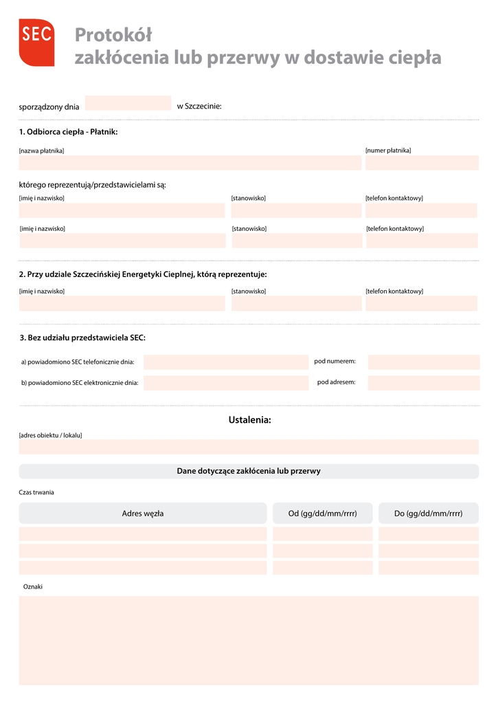 Protokół zakłócenia lub przerwy w dostawie ciepła w Szczecinie: sporządzony dnia 1. Odbiorca ciepła - Płatnik: [numer płatnika] [nazwa płatnika] którego reprezentują/przedstawicielami są: [imię i nazwisko] [stanowisko] [telefon kontaktowy] [imię i nazwisko] [stanowisko] [telefon kontaktowy] 2. Przy udziale Szczecińskiej Energetyki Cieplnej, którą reprezentuje: [imię i nazwisko] [stanowisko] [telefon kontaktowy] 3. Bez udziału przedstawiciela SEC: pod numerem: a) powiadomiono SEC telefonicznie dnia: pod adresem: b) powiadomiono SEC elektronicznie dnia: Ustalenia: [adres obiektu / lokalu] Dane dotyczące zakłócenia lub przerwy Czas trwania Adres węzła Oznaki Od (gg/dd/mm/rrrr) Do (gg/dd/mm/rrrr) Protokół zakłócenia lub przerwy w dostawie ciepła Uwagi [czytelny podpis]